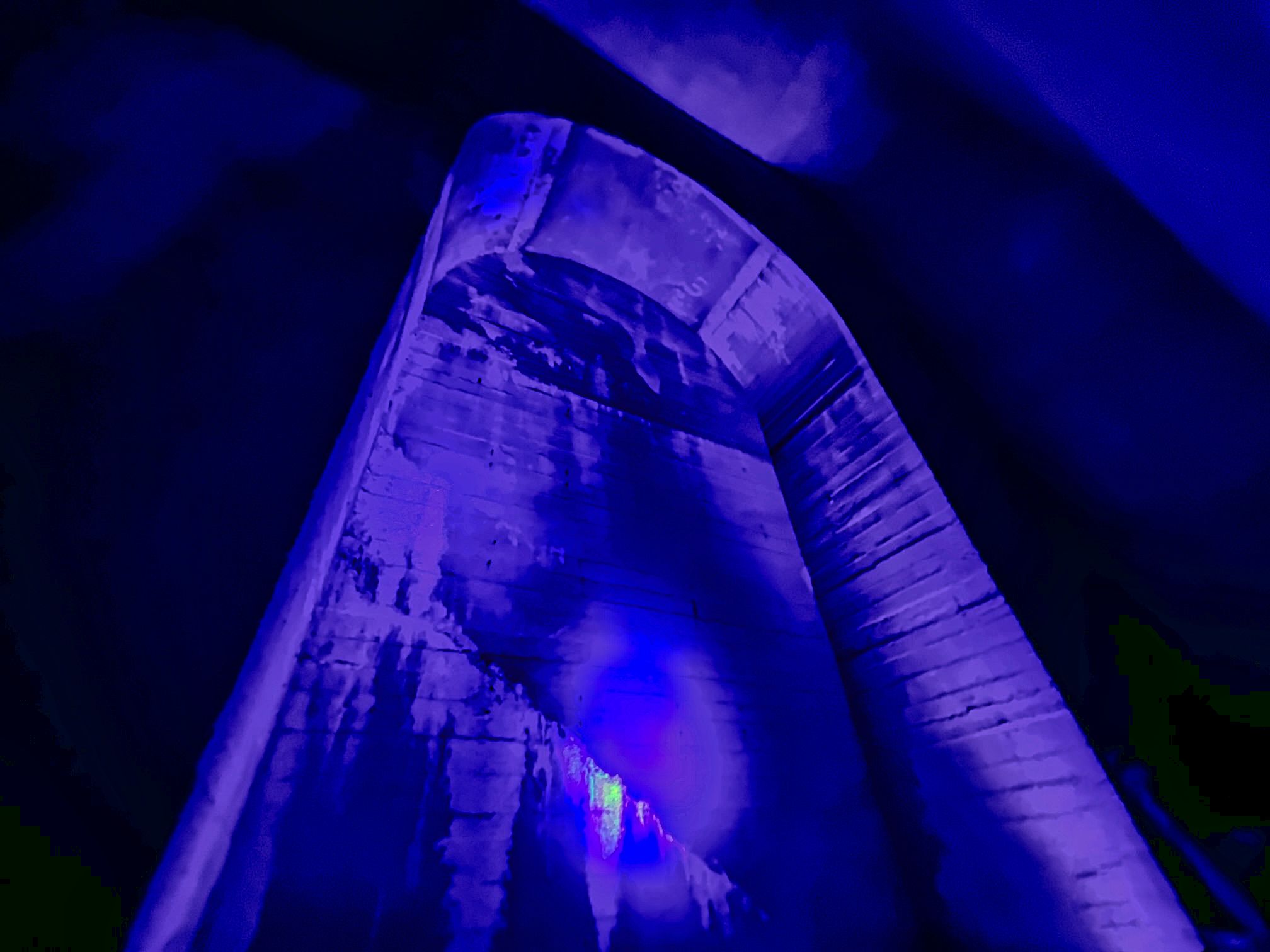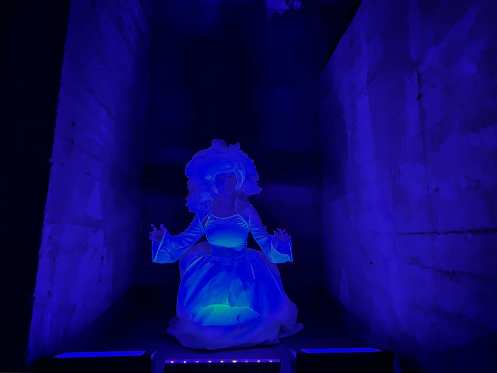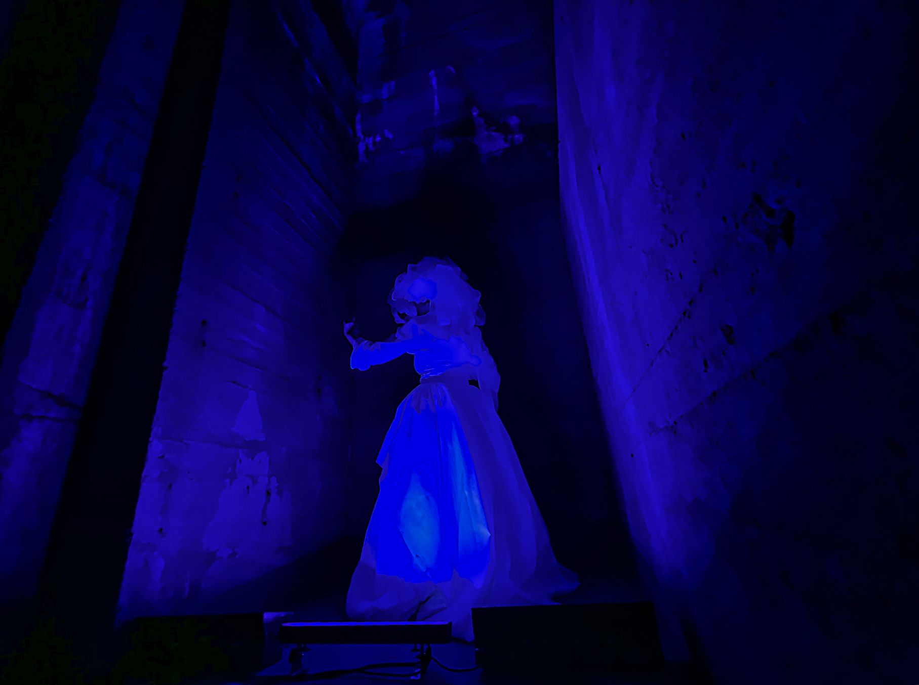 Ganz langsam geht es vorwärts. Lampen mit UV-Licht lassen einen Schriftzug „Verhaltet euch ruhig“ in einer fraktalähnlichen Schrift erscheinen. Man hört Arbeitsgeräusche, wie ich las von einem Zementwerk, weil Beton das Thema ist, um das es den Künstlern geht. Mittlerweile haben sich meine Augen einigermaßen an die Dunkelheit gewöhnt, ich erkenne blau beleuchtete Wände, es geht in mehrere kleine Kammern, in der letzten tanzt plötzlich eine Frau in einem weißem Hochzeitskleid aus der Dunkelheit. Who you gonna call …?