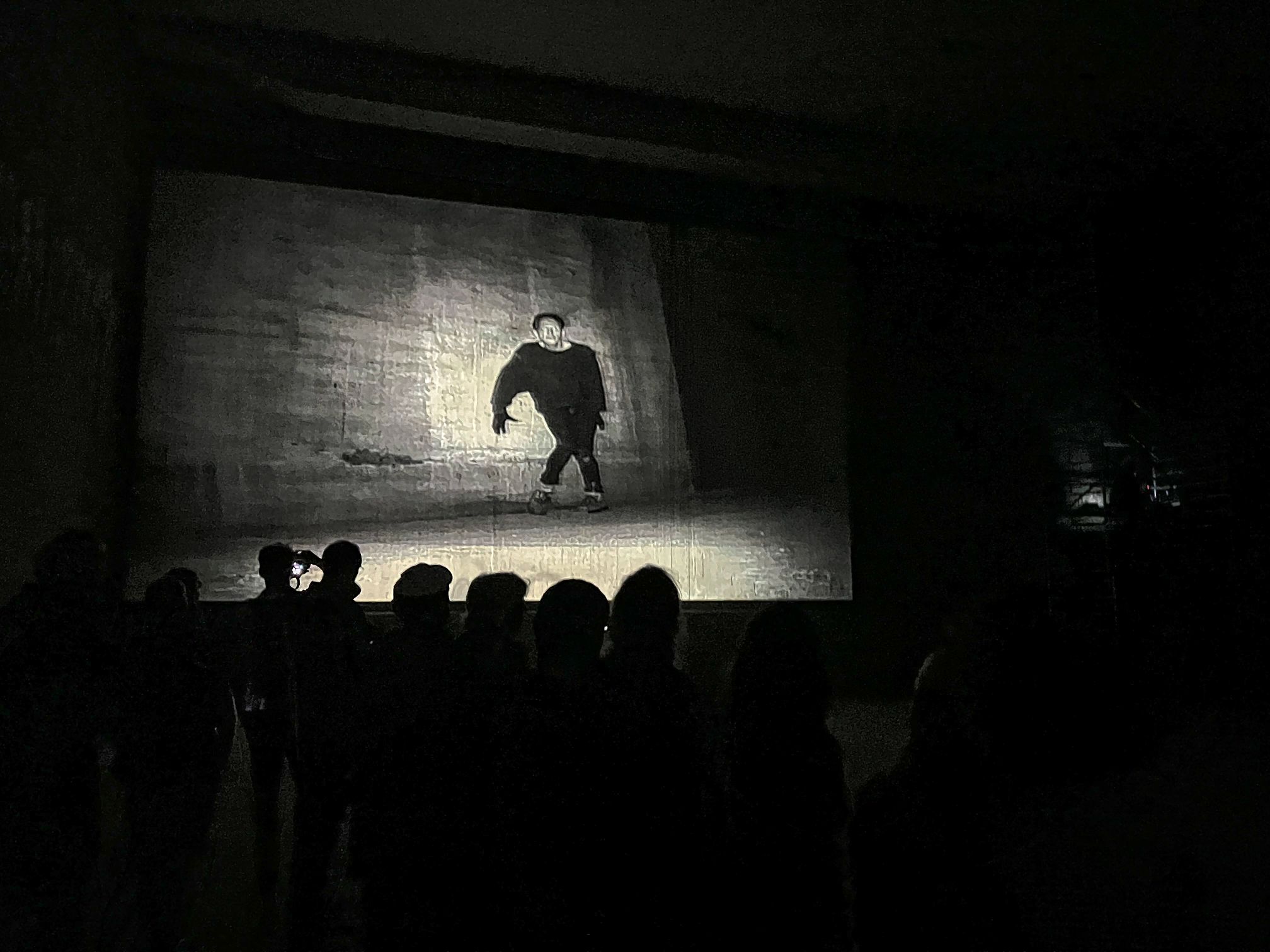 Es geht zurück in den eingangs gefühlt kleinen Raum. Ein Projektor projiziert jetzt das Bild einer Betonwand an die Wand. Der Raum ist gar nicht klein, im Gegenteil vielleicht 20×20 Meter groß und 6-8 Meter hoch, im Krieg ein Luftschutzbunker. Es ertönt eine Art Ansprache aus dem Off und auf der Wand erscheint ein Mensch. Ich fühle mich kurz an die 1920’er und Fritz Lang erinnert. Die Figur läuft langsam auf uns zu. Die Performance heißt nicht umsonst Concrete Delusion – Konkrete Täuschung. Gerade als ich Gefallen finde, öffnet sich die Türe wieder und nach ca. 40 Minuten kehre ich zurück ins gleißende Sonnenlicht.