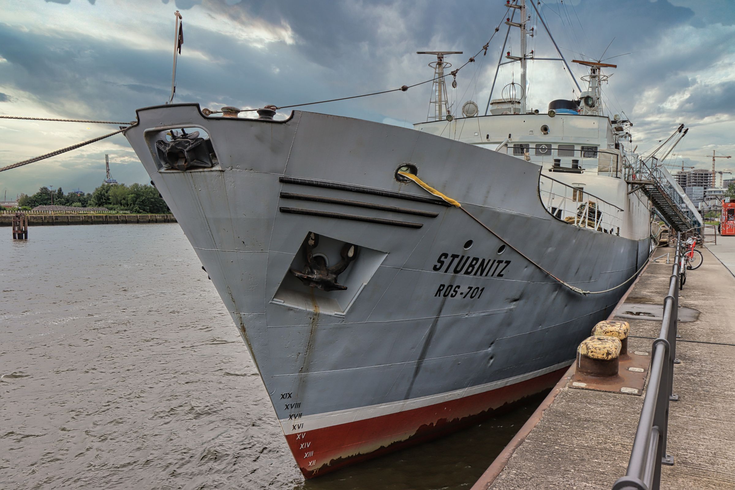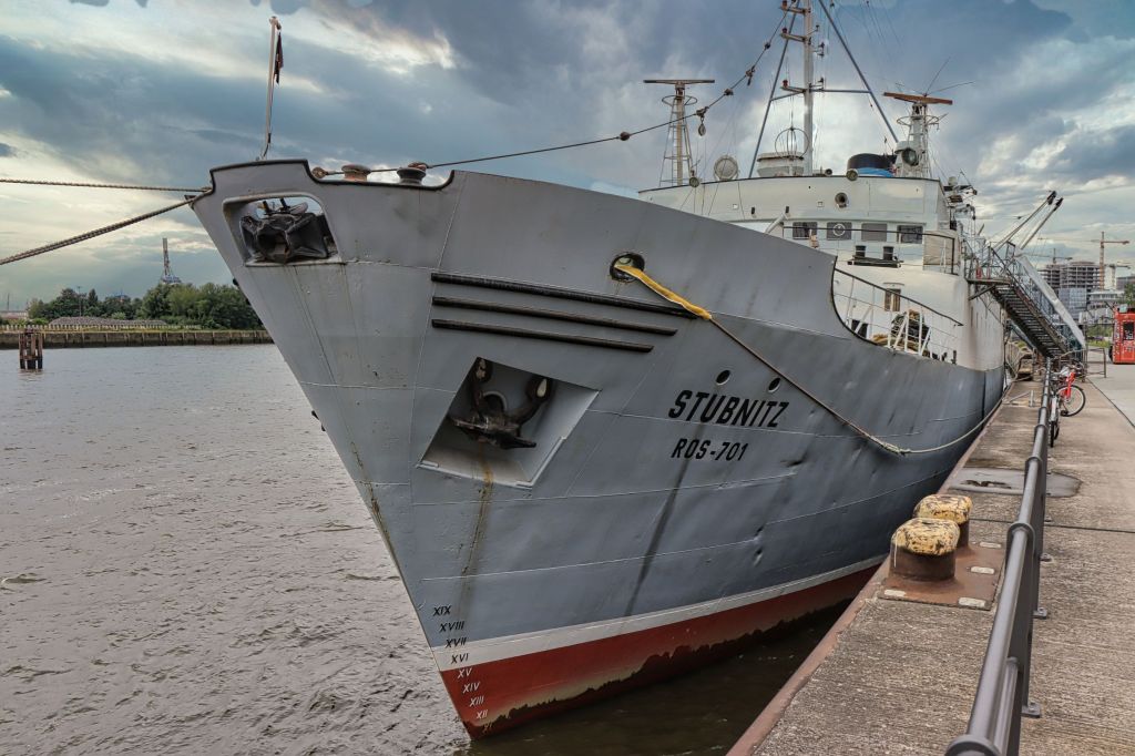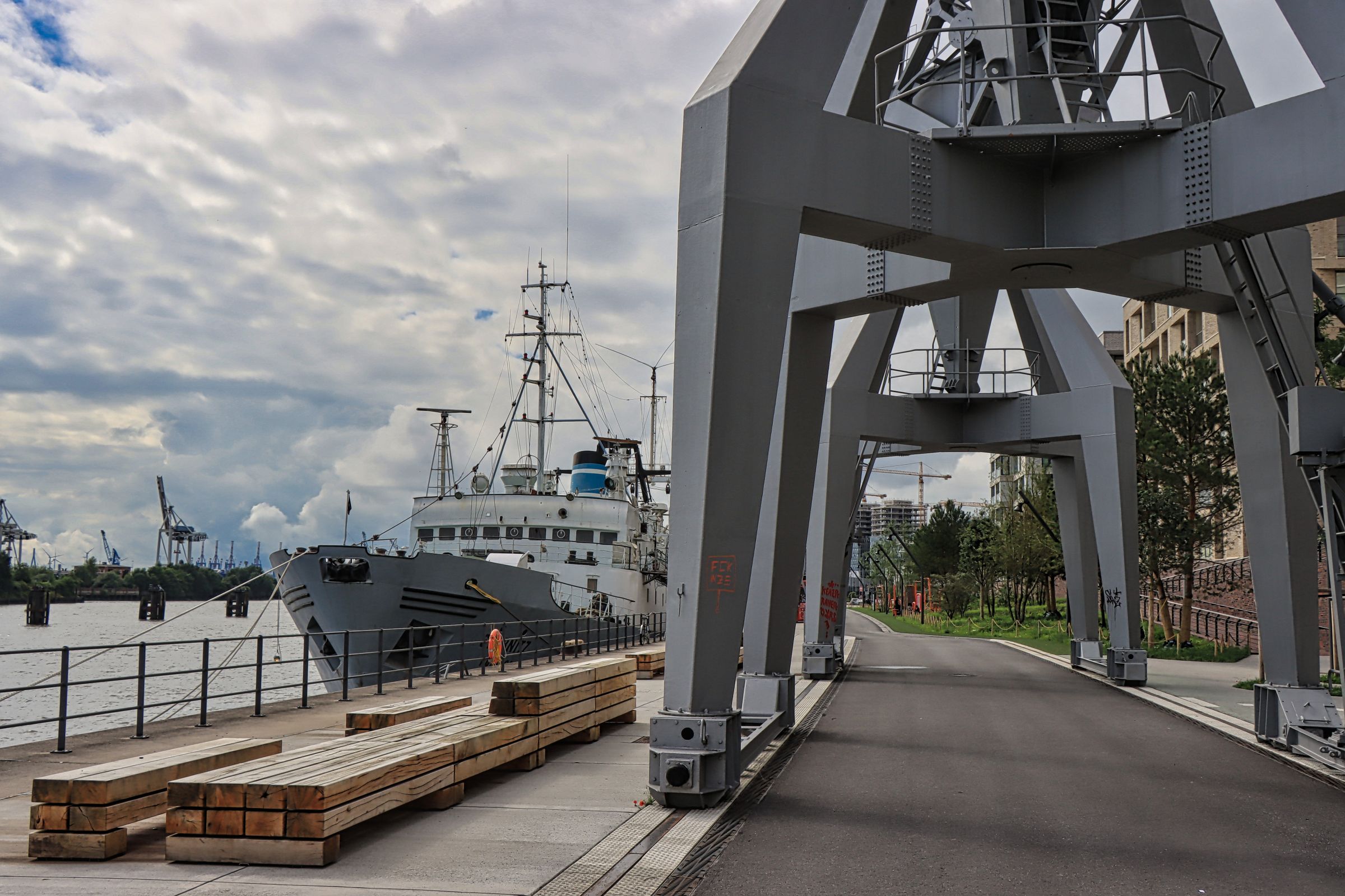 Der Kai soll irgendwann mal 1 km lang werden und die größte und zugleich grünste Promenade der Hafencity werden. Noch sind die Bäume klein, aber der erste 560 m lange Abschnitt ist jetzt fertiggestellt worden. Neben alten Hafenkränen, Spiel- und Sportmöglichkeiten, sowie Sitzgelegenheiten finden sich hier auch gleich Tanzschritte, die auf den Boden gemalt wurden. Tanzschrite? Ja, in der Tat, wer nach Feierabend das Tanzbein schwingen möchte, kann sich vielleicht daran orientieren. Außerdem liegt hier die Stubnitz. Das Schiff ist ein ehemaliges Kühlschiff der DDR-Hochsee-Fischfangflotte und wird seit 1992 als Veranstaltungsschiff genutzt. Touristen verirren sich aktuell noch eher selten in den hinteren Teil der Hafencity.