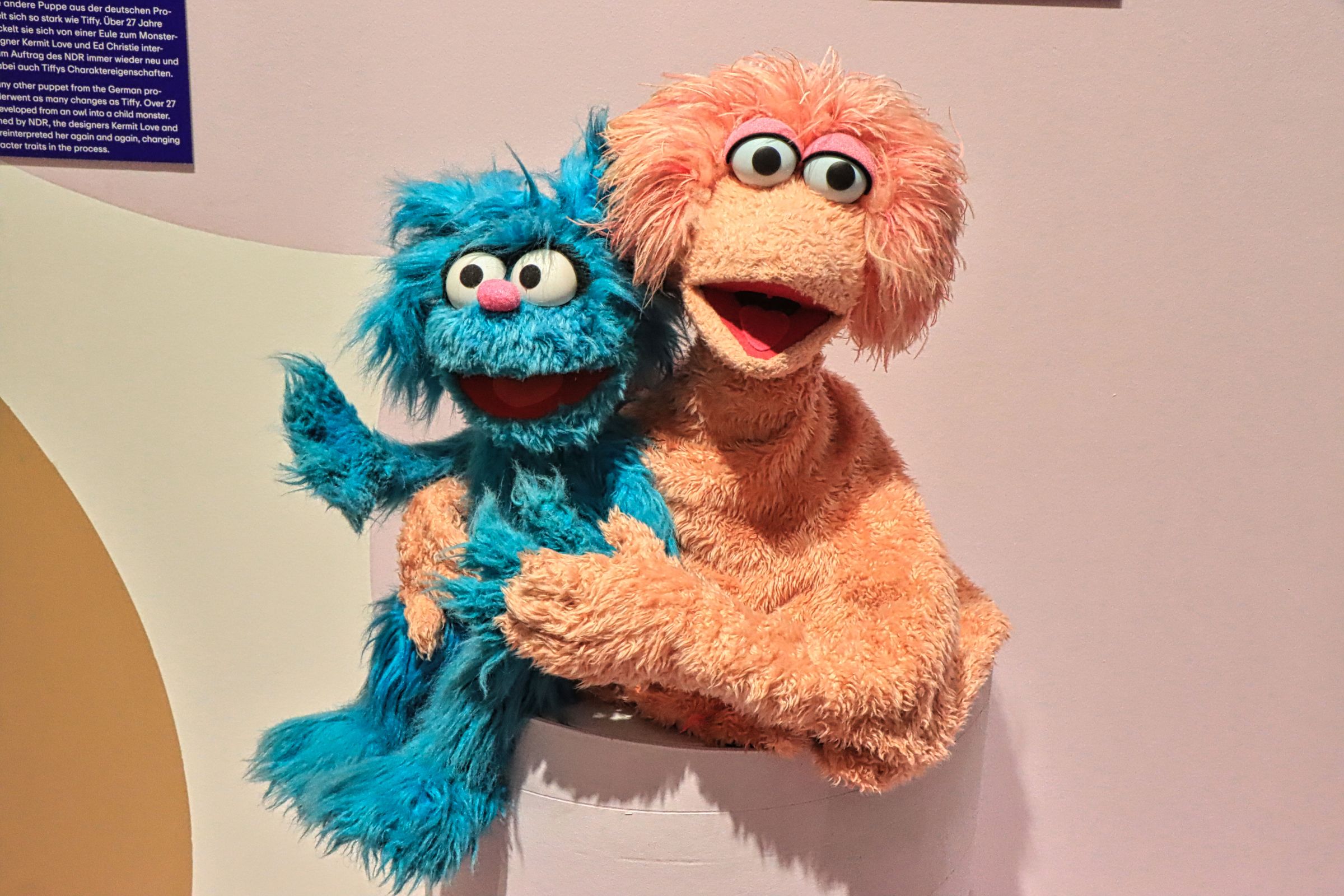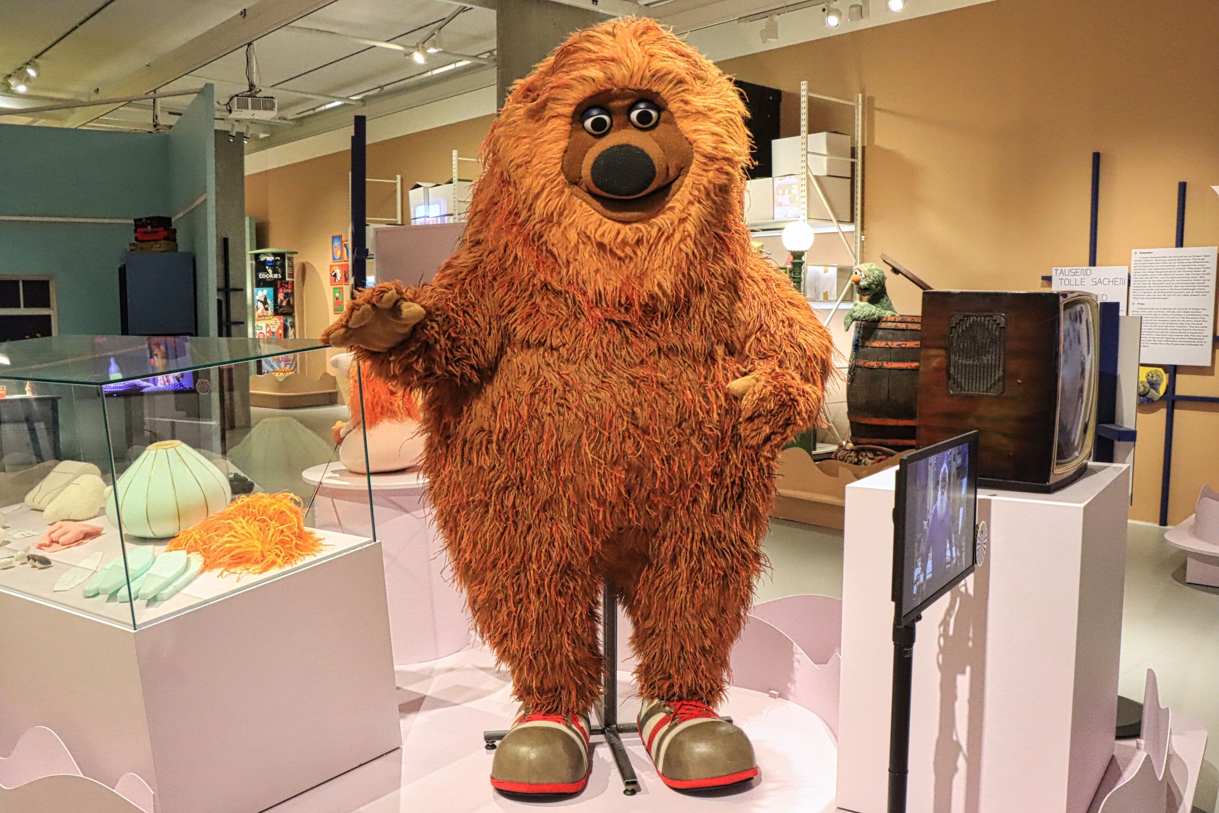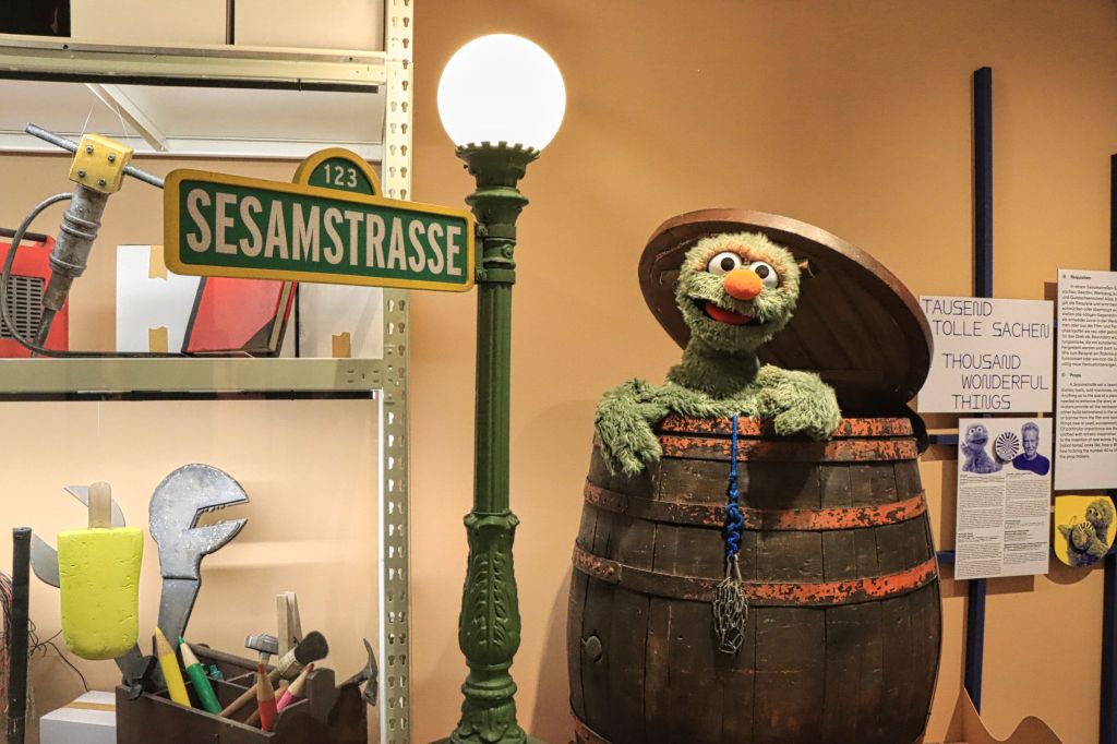 Bibo, das Krümelmonster, Samson und Tiffy, Herr von Bödefeld, aber auch Finchen, Erni und Bert, Elmo, Grobi und der Blaue (von dem ich nicht wußte, daß er so heißt) oder Rumpel sind die Figuren die vorgestellt werden. Man erfährt etwas über die Entstehungsgeschichte und den teilweisen Wandel der Figuren, über die Menschen vor und hinter den Kulissen. Apropos Rumpel, ich kannte ja noch Oscar, aber das ist ein anderes Thema. Die Ausstellung läuft noch bis zum 07.01.2024.