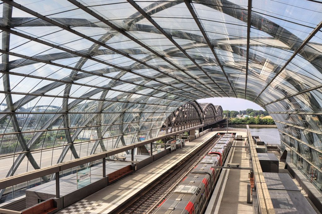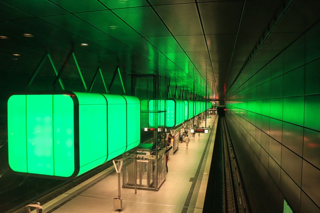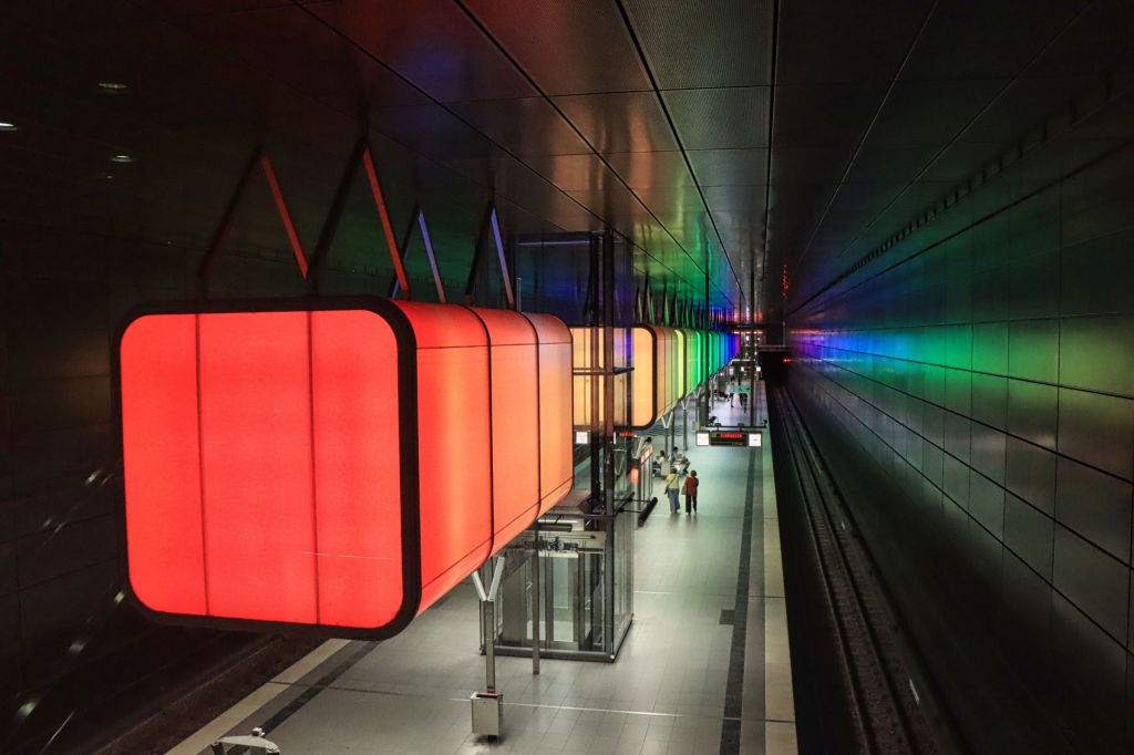 Am Nachmittag war ich zurück in der Speicherstadt. Sie ist es immer wieder wert fotografiert zu werden, auch wenn sich die Bilder über die Jahre gleichen. Ich hatte es geschafft, trotz zwei kleiner Schauern, nicht ein einziges mal meinen Regenschirm aufspannen zu müssen. Das heißt aber umgekehrt auch, daß ich dieses Mal nicht so weit raus war aus der Stadt. Kein Blankenese, kein Entenwerder, kein Grasbrook, dafür in der Hafencity entlang der U-Bahnlinie U4. Die Station Elbbrücken, die bunten Kuben (Lichtboxen) in der Station Hafencity Universität, die übrigens nicht nur leuchten, sondern manchmal auch der Musik folgen und die Station Überseequartier.