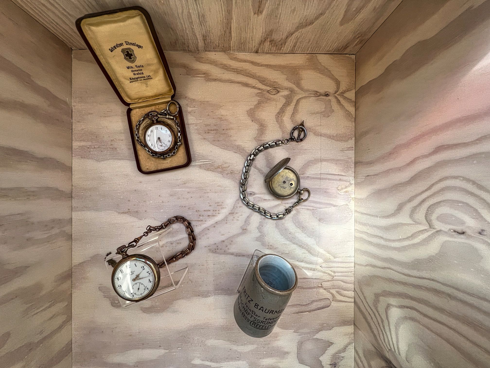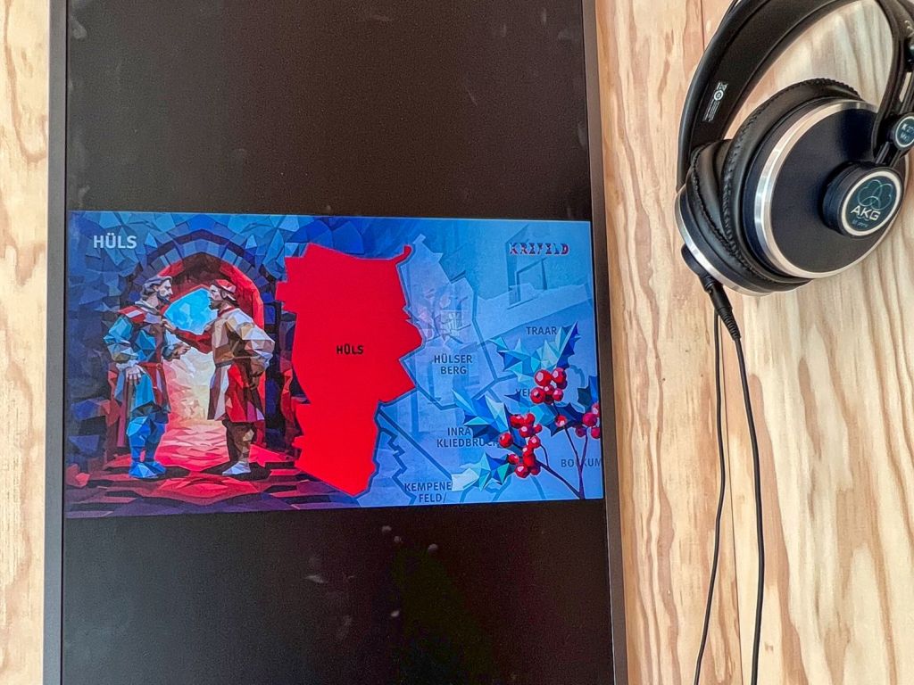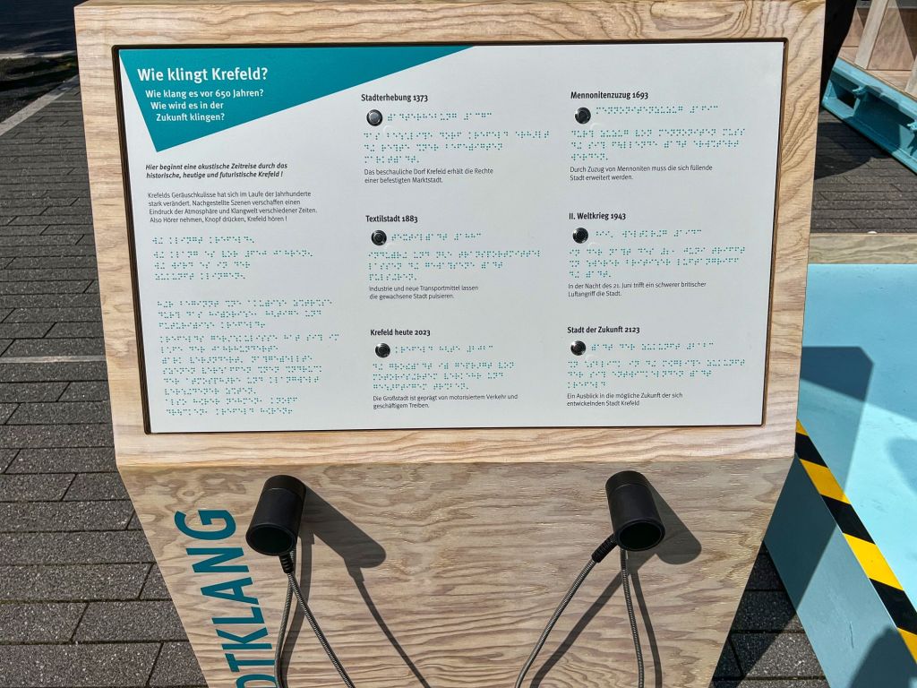 Es wird erklärt, wie es zu den vier Wällen kam, und daß früher mal Taschenuhren und sogar Senf aus Krefeld kam. Wer erinnert sich noch an Fritz Bauermanns feinsten Tafelsenf? Ich auch nicht, schließlich ist das über 100 Jahre her. Vor der Türe gibt es dann ein Tableau mit Knöpfen, die euch Geräusche aus längst vergangener, teilweise dunkler Zeit und Geräusche aus der Zukunft einspielen.