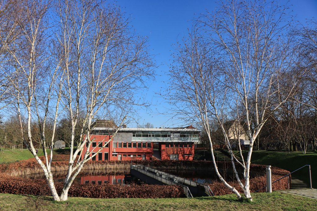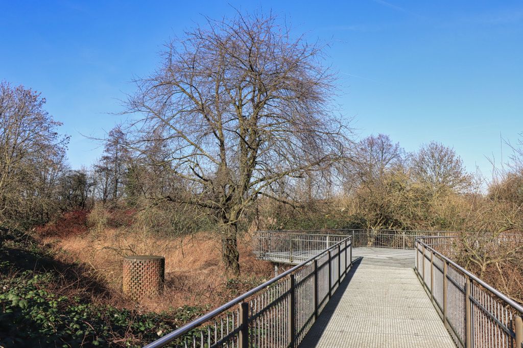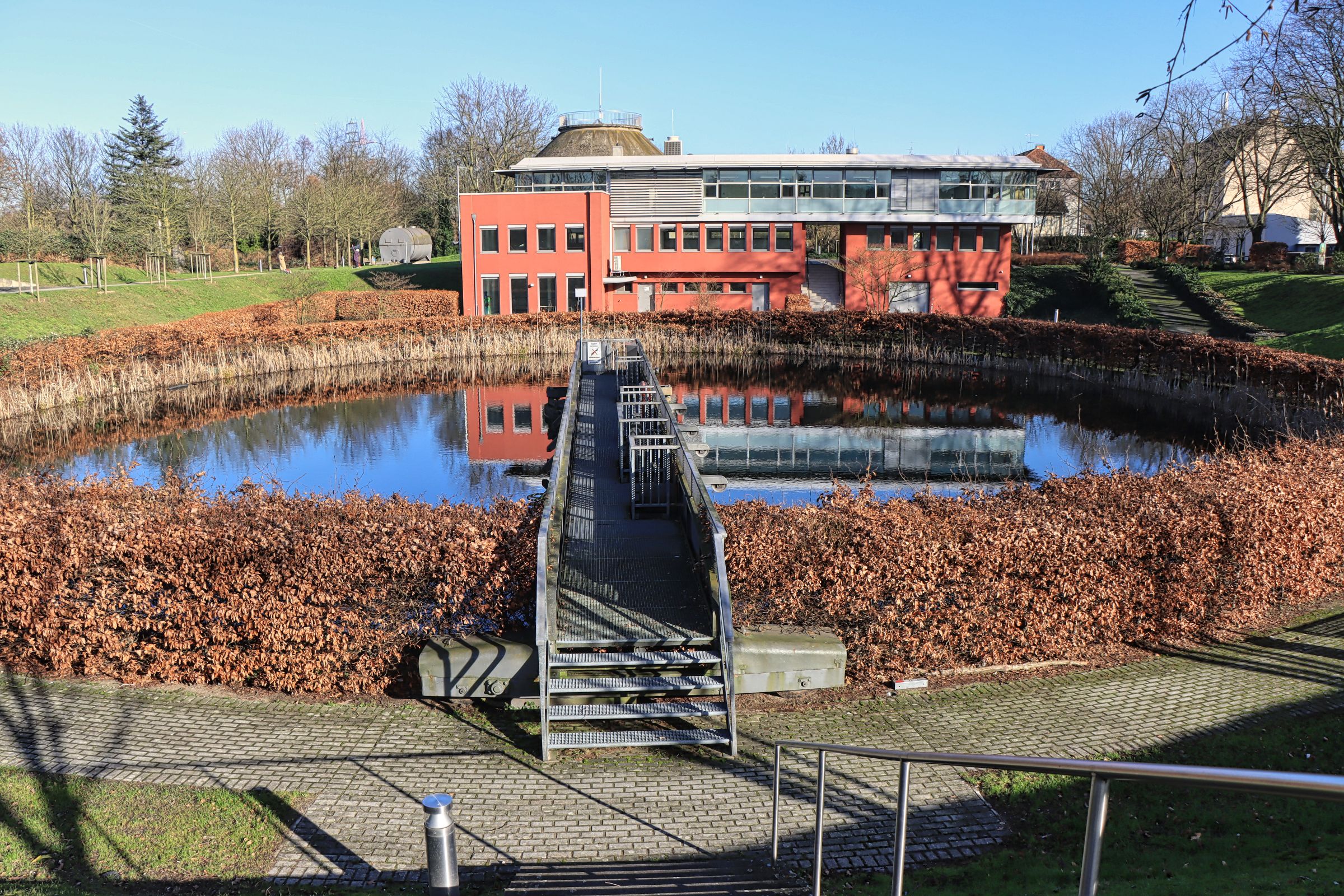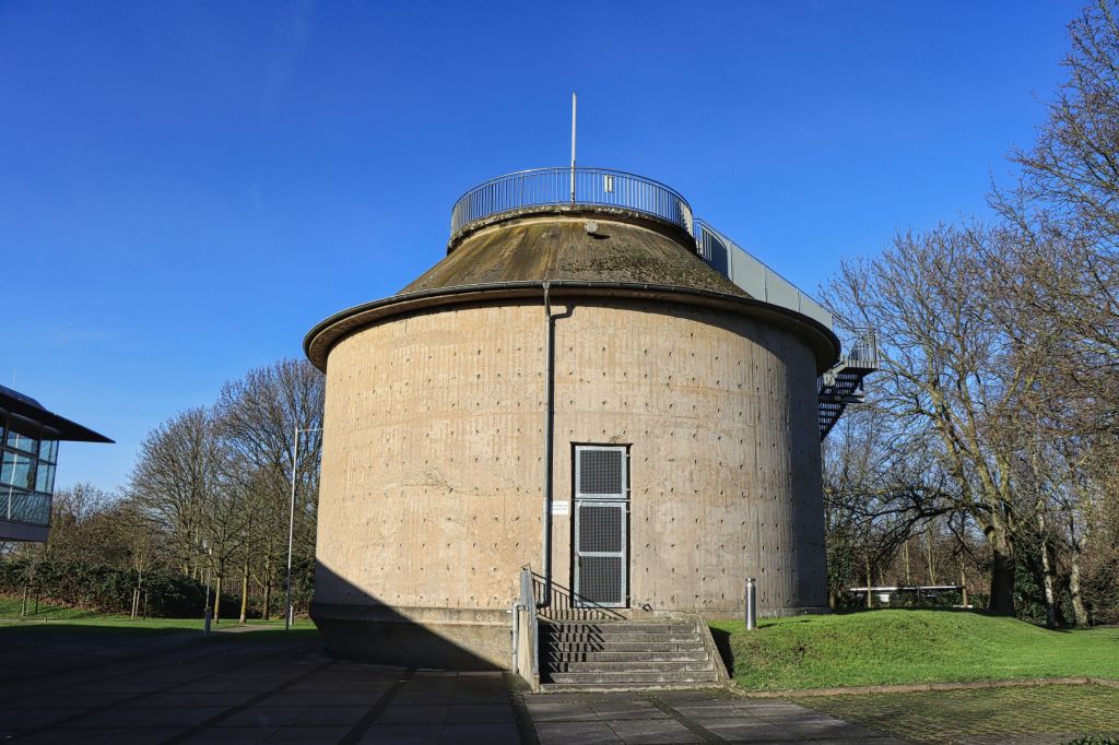 Dieses Mal bin ich ein paar Meter und nur ein paar Minuten vom Haus Ripshorst nach Osten gelaufen. Dort befindet sich der Emscher Klärpark. Hier war von 1958 bis 1996 die Kläranlage an der Mündung des Läppkes Mühlenbachs, der nach einer Kanalunterquerung in die Emscher fließt. 2003 wurde die Kläranlage zum Emscher Klärpark umgebaut. Auf dem naheliegenden alten Faulturm befindet sich sogar eine Aussichtsplattform, hinein in den Turm ging’s (an dem Samstag) leider nicht.