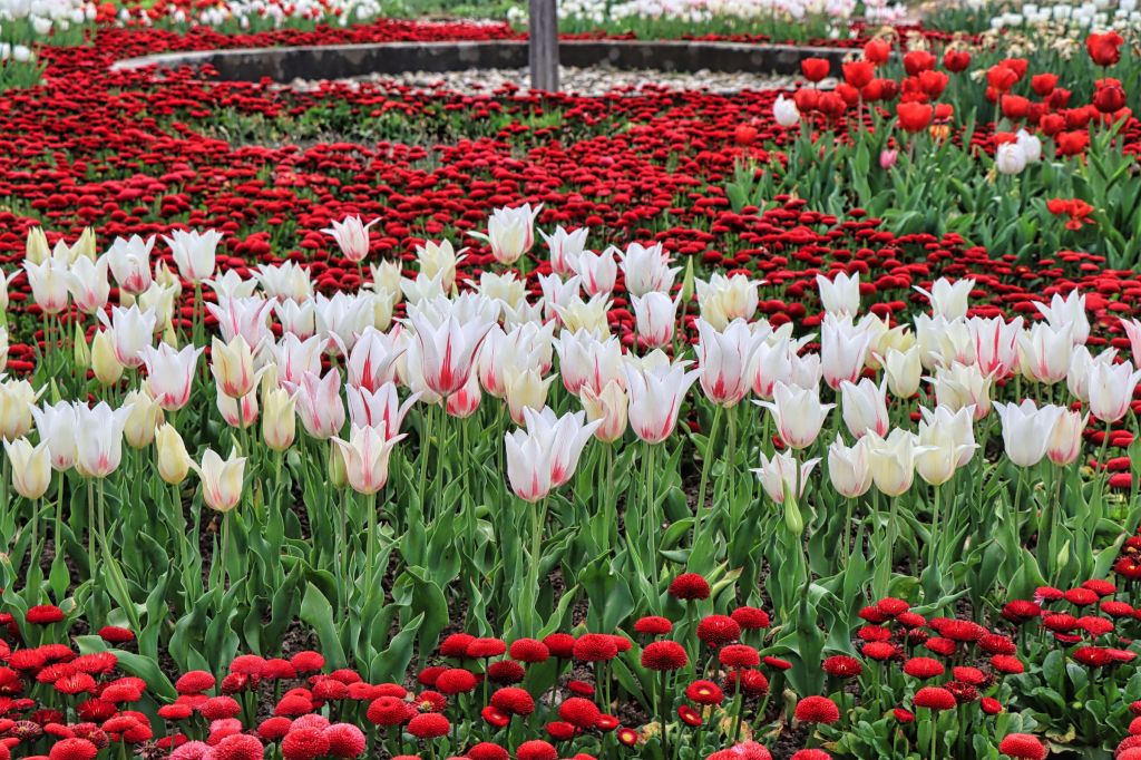 Weiter hinten im Park, der Plan nennt die Stelle Kakteen- und Sommerblumengarten, erstrahlte das riesige Blumenbeet dann in fast allen Frühlingsfarben. Ich konnte mich gar nicht sattsehen, vor allem, weil die Ansicht auf den Bildern kaum die ganze Blütenpracht widerspiegeln kann. Vor allem die unzähligen rosa, roten und weißen Gänseblümchen sowie die weißen Bodendecker machen schon ordentlich was her.