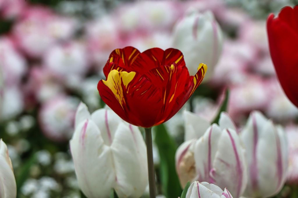 Die Kirschblüte war zwar bereits vorbei, so daß nur noch ganz wenige Blüten an den Kirschbäumen hingen, dafür haben sich die Gärtner hier im Park an anderer Stelle ins Zeug gelegt. Der Blumenring, den man durchschreitet, wenn man vom Haupteingang des Parks kommt erstrahlte in roten und weißen Tulpen, nur die Narzissen waren bereits verblüht. Ich war nicht der einzige, der einen Moment Geduld brauchte, um ein Bild ohne Besucher darauf machen zu können.