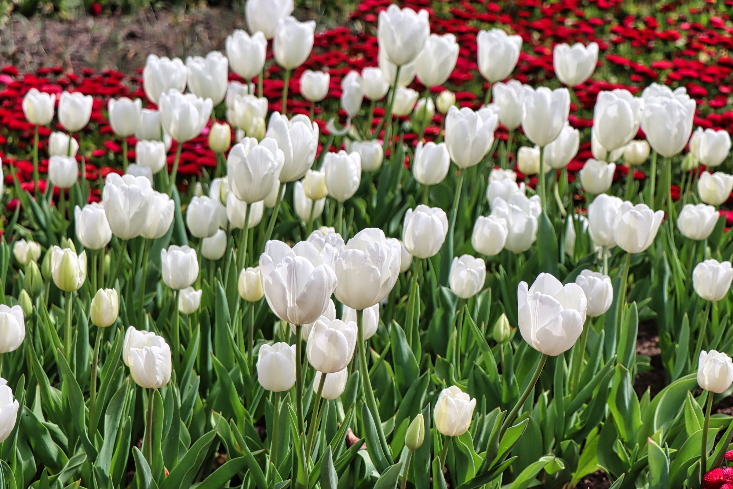 Weiter hinten im Park, der Plan nennt die Stelle Kakteen- und Sommerblumengarten, erstrahlte das riesige Blumenbeet dann in fast allen Frühlingsfarben. Ich konnte mich gar nicht sattsehen, vor allem, weil die Ansicht auf den Bildern kaum die ganze Blütenpracht widerspiegeln kann. Vor allem die unzähligen rosa, roten und weißen Gänseblümchen sowie die weißen Bodendecker machen schon ordentlich was her.