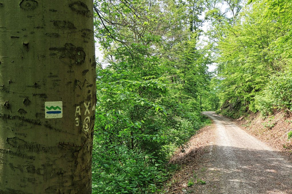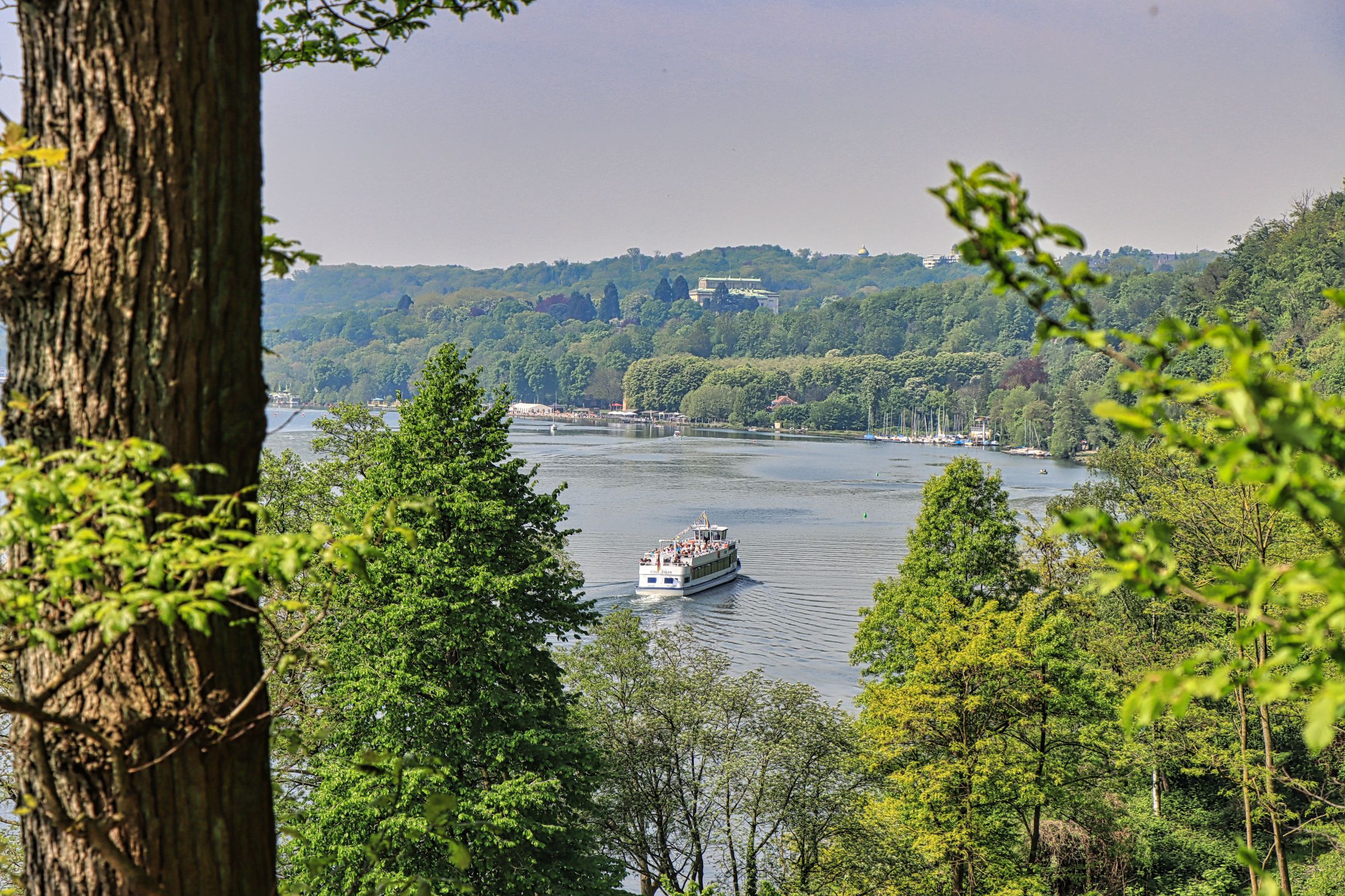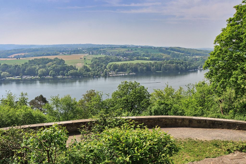 Eine wunderschöne Aussicht auf einen Großteil des Baldeneysees, auch wenn heute Saharasand den Himmel etwas trübt. Die Korte Klippe ist übrigens Rudolf Korte, dem Erbauer des Botanischen Gartens und damit dem Vorläufer des Grugaparks gewidmet. Zurück auf den Weg den ich gerade gekommen bin, biege ich an besagter Wandertafel links ab. Es geht kurz bergauf und dann plötzlich relativ steil bergab. Dieser Weg ist auch Teil des Baldeneysteigs, der hier in Serpentinen nach unten geht. Trotz allem kommen mir hier drei Mountainbikefahrer entgegen. Respekt.