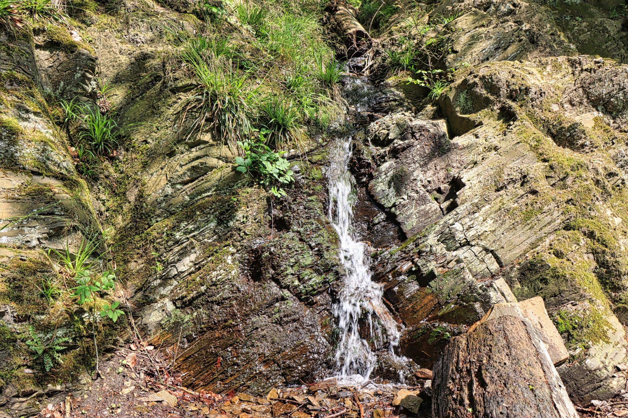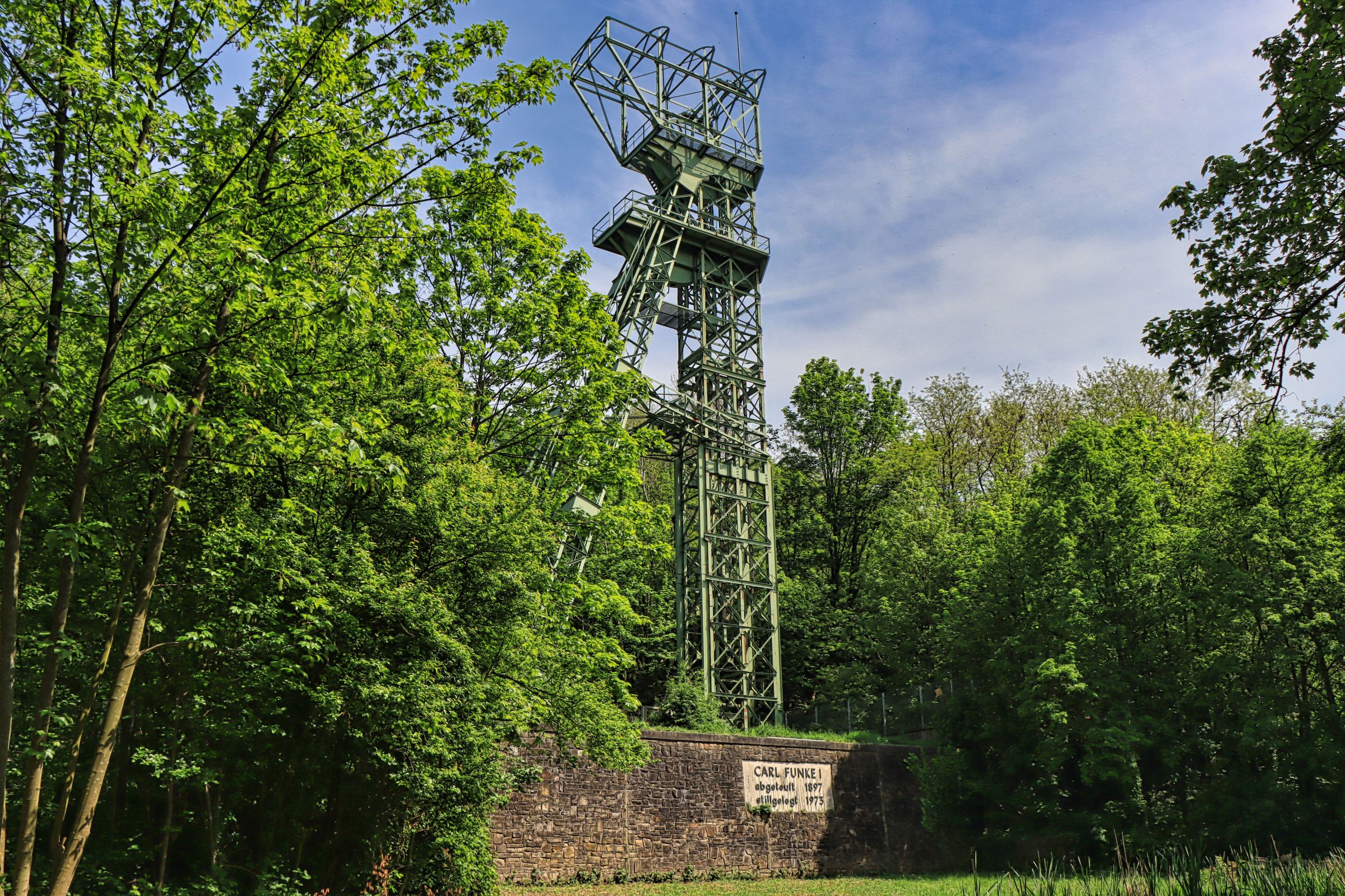 Nach zweidrittel des Weges stehe ich wieder an einer Stelle und bin begeistert von der Aussicht auf See, Wege und ein Schiff der weißen Flotte, die gerade vorbei schippert. Nach weiteren 10 Minuten stehe ich ganz unten auf Höhe des Baldeneysees, entdecke einen Wasserfall, von dem ich nicht wußte, daß der hier existiert und erreiche das Fördergerüst der Zeche Carl Funke. Natürlich habe ich das Fördergerüst schon mal fotografiert, aber mittlerweile war der Himmel wieder etwas blauer, also mußte ich nochmal draufhalten.