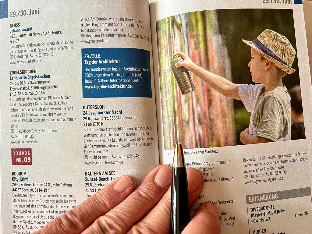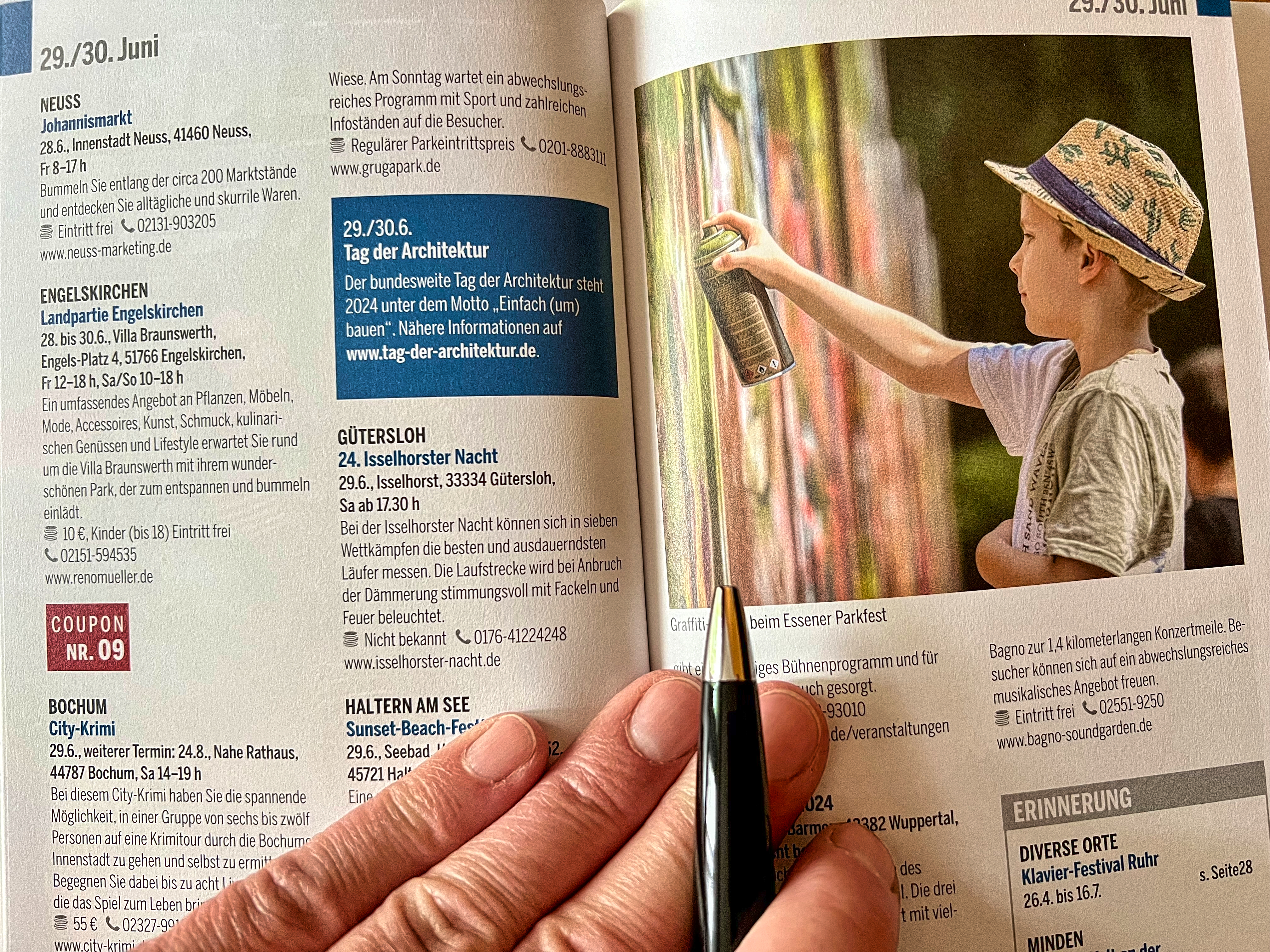 Auf 142 Seiten gibt der Klartextverlag wieder Tipps für ganz Nordrhein-Westfalen incl. Konzert- und Ausstellungshighlights. Das Buch kostet 9,95 € und bietet neben den Ausflugstipps 40 Rabattgutscheine im Wert von ca. 200 Euro. Selbstverständlich, man wird sie vielleicht nicht alle verwenden können, aber einen Gutschein an Freunde oder Nachbarn weiter zu reichen ist nicht verboten. Mal gibt es 1,- bis 3,- € Rabatt, mal gibt es freien Eintritt für eine zweite Person. Mir gefällt das Buch, weil manche Zeitschrift heute schon mehr kostet.