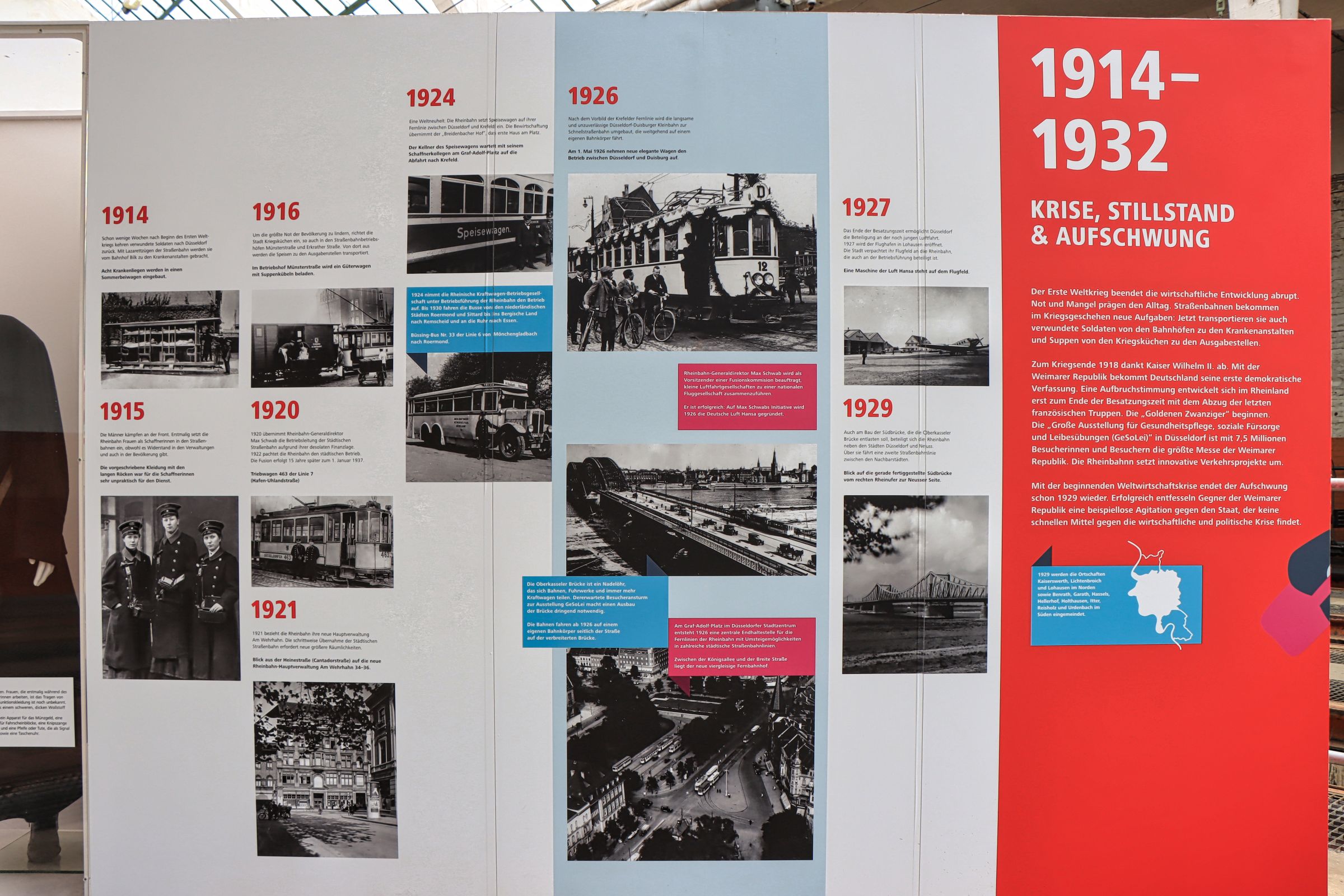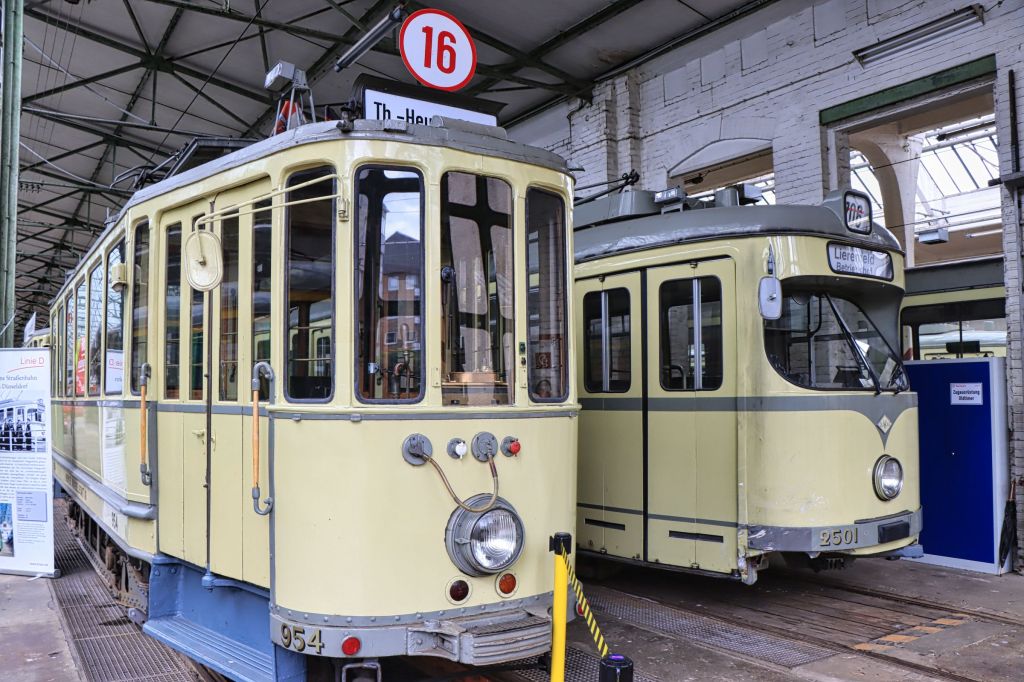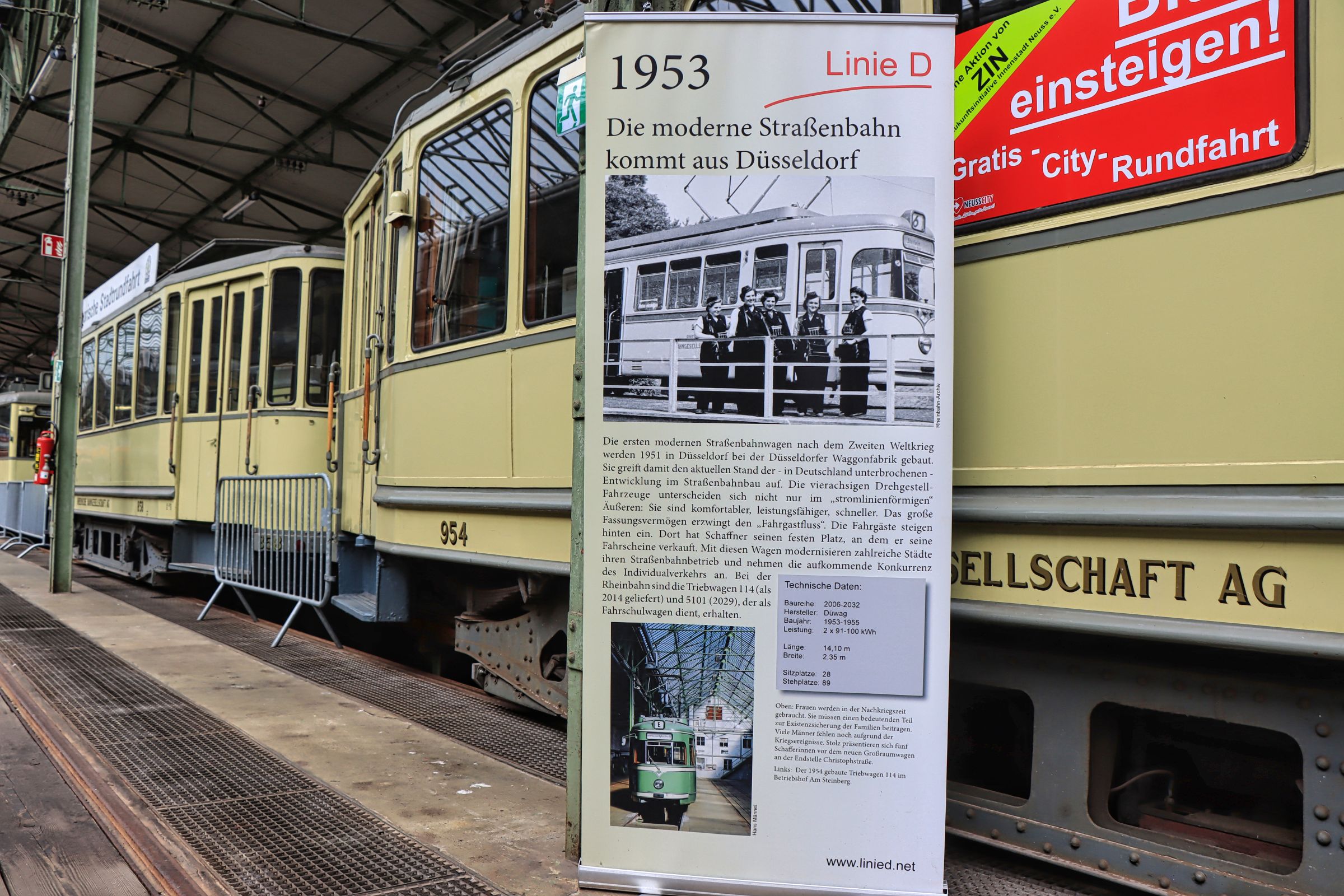 In der zweiten Halle kann der Besucher die komplette Geschichte der Rheinbahn von 1896 bis 2024 auf großen Informationstafeln nachlesen. Beispielsweise über die ersten Schafferinnen 1915, weil die Männer im Krieg dienten, über die ersten Brücken über den Rhein, die gebaut und wieder zerstört wurden. Straßenbahnlinien nach Krefeld oder Duisburg nannten sich damals Fernlinien. 1968 wird der Schaffner abgeschafft, in den 1970’er Jahren erfolgt der Bau weiterer und neuer Brücken. 1981 geht es für die erste Straßenbahn unter die Erde, 2005 wurde aus der Rheinischen Bahngesellschaft AG die Rheinbahn AG und auch Anfang der 2000’er Jahre folgten die ersten modernen Niederflurbahnen.