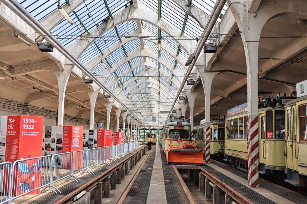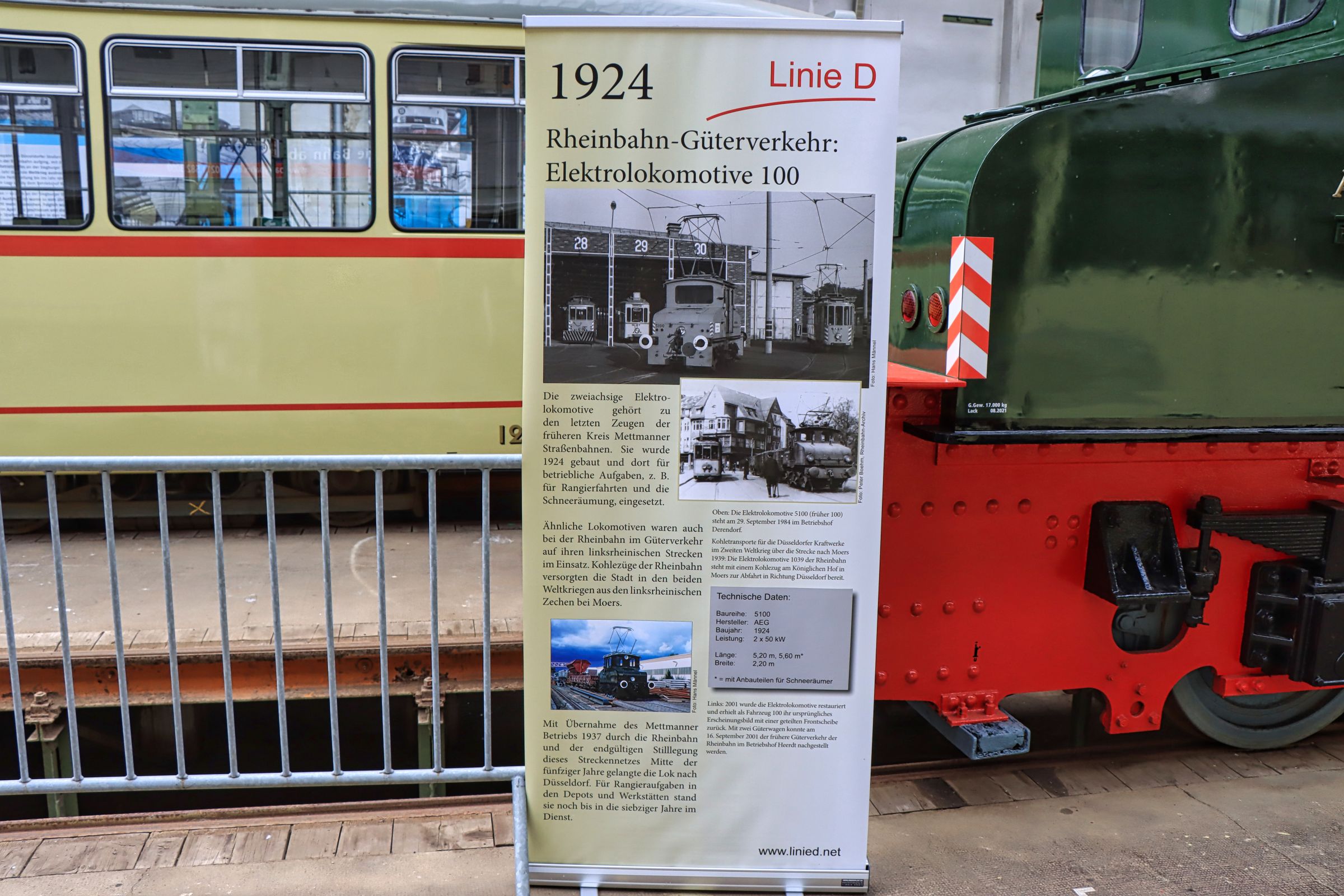 Ebenfalls steht in der Wagenhalle gleich ganz vorne ein Wagen der 2010 in Düsseldorf außer Betrieb genommen und nach Poznan in Polen verkauft wurde. Dort drehte er 9 Jahre seine Runden, bis er für die Ausstellung 2020 in der polnischen Originallackierung nach Düsseldorf zurückgebracht wurde. Zwischen den Straßenbahnen sticht eine dunkelgrüne E-Lok heraus. Sie wurde früher einmal für Rangierfahrten und zum Schneeräumen sowie mit einem ähnlichen Modell zum Transport von Kohle aus den linksrheinischen Zechen genutzt.