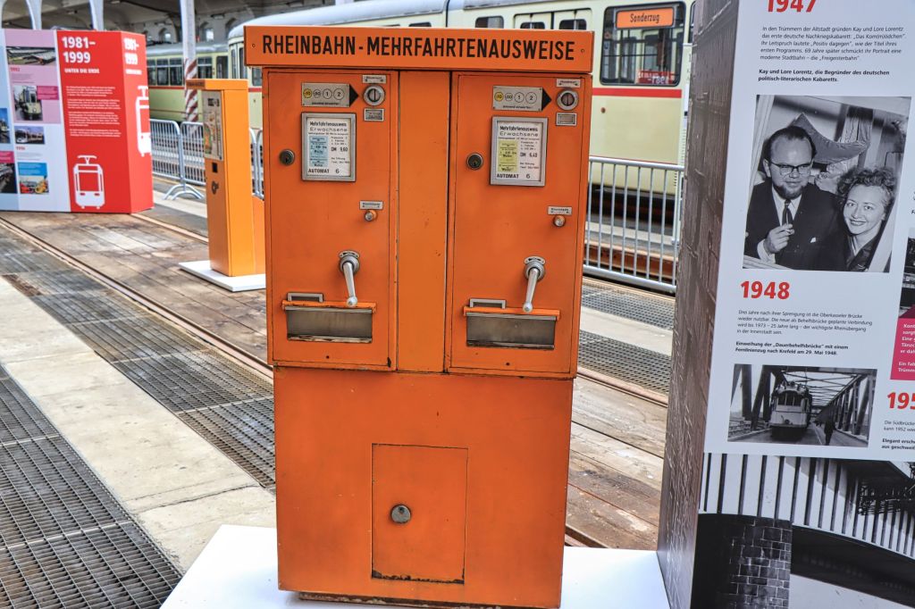 Jetzt möchte ich mir auf keinen Fall anmaßen, daß ich etwas zum diesem oder jenem Wagen sagen könnte, aber darum geht es auch gar nicht. Es ist einfach interessant zu sehen, was früher auf den Straßen Düsseldorfs unterwegs war, vor allem weil auch Krefeld seit 1898 an den Schienenverkehr von und nach Düsseldorf angebunden ist. Informationstafeln erklären dem Ausstellungsbesucher, daß die ersten modernen Straßenbahnwagen nach dem 2. Weltkrieg aus der Düsseldorfer Waggonfabrik kamen und es in der Vorautomatenzeit üblich war, daß der Schaffner hinten in der Bahn saß und Fahrkarten verkaufte. Der Einstieg erfolgte damals sozusagen hinten.