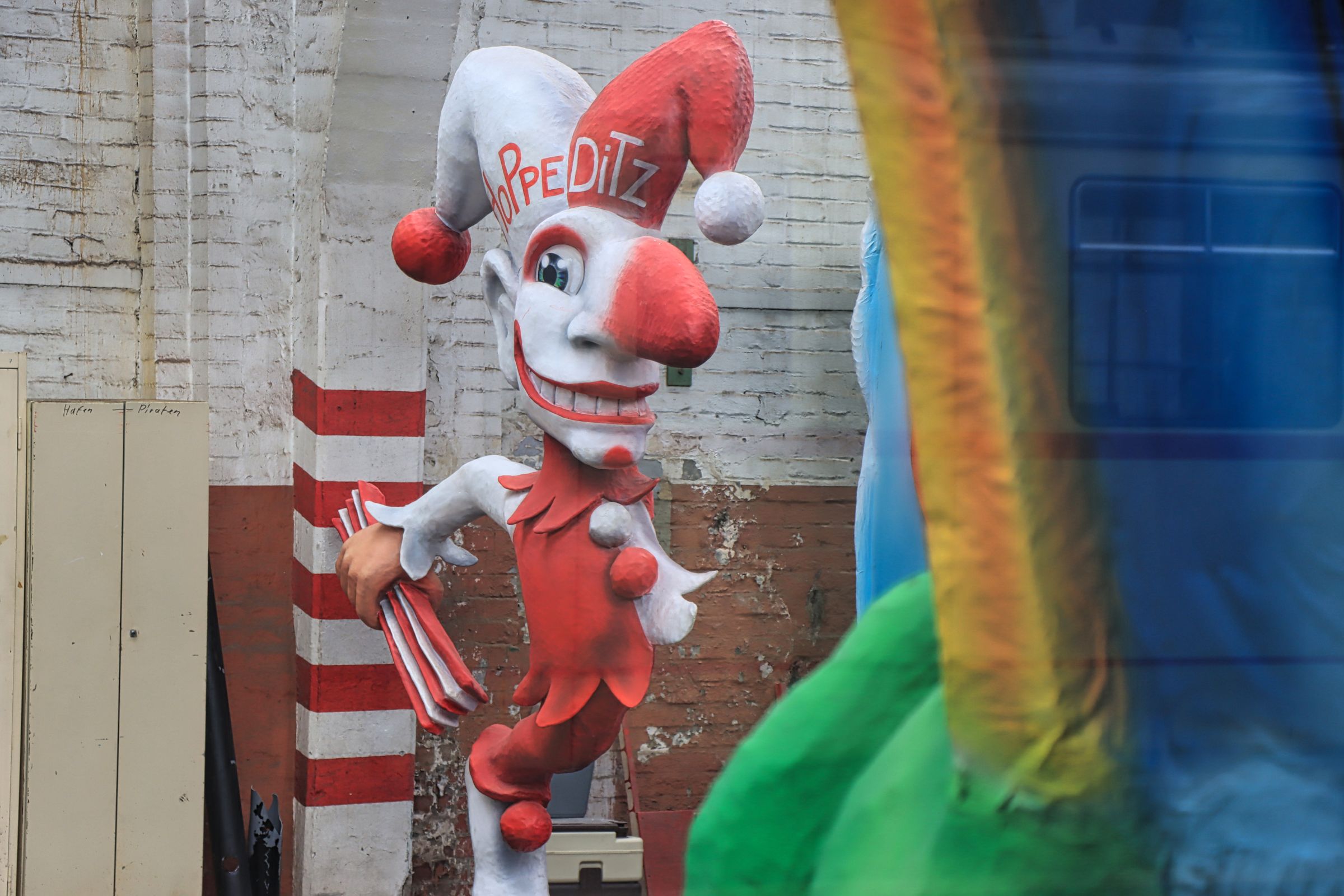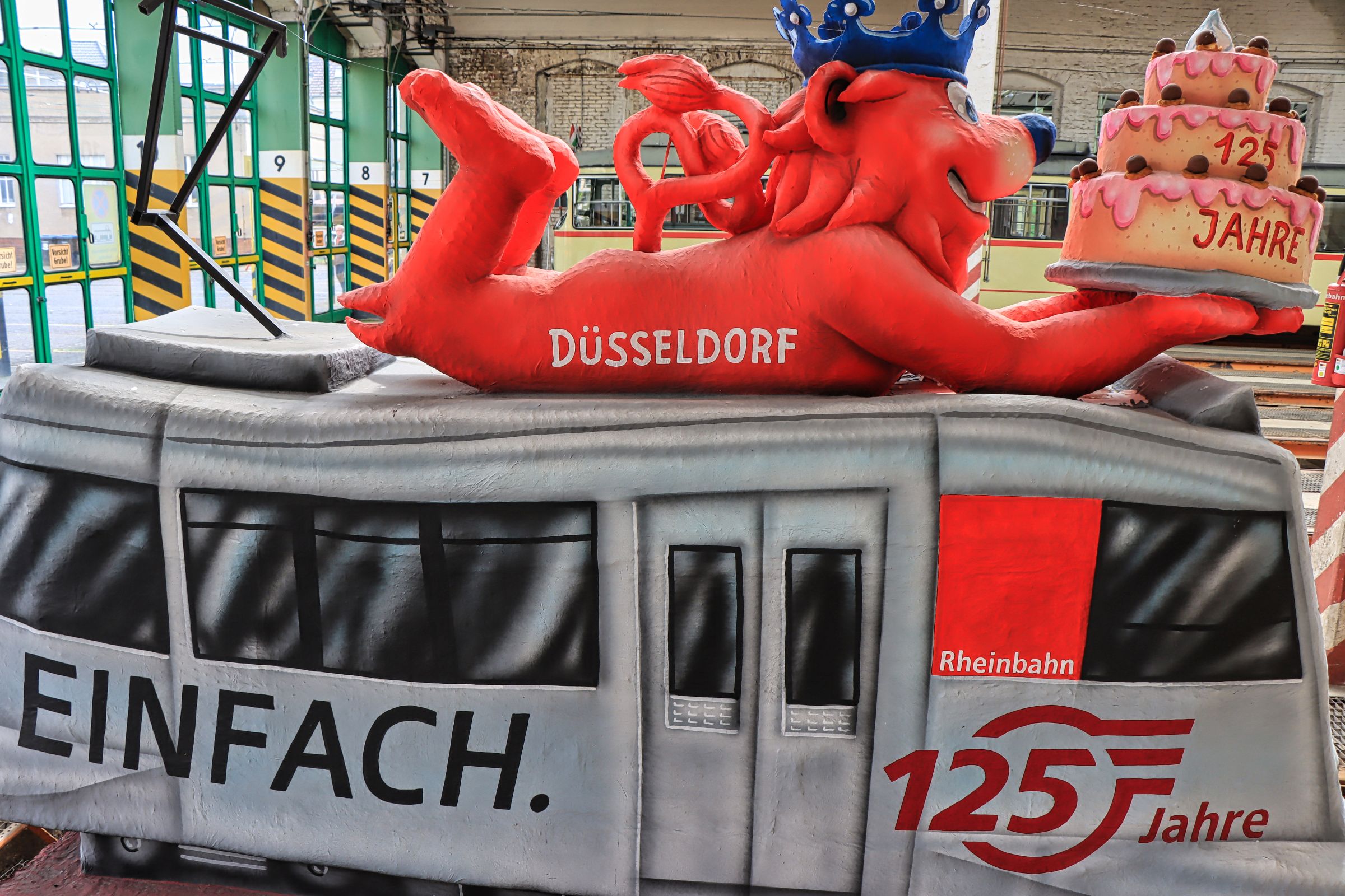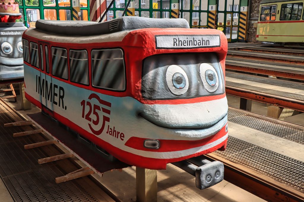 Die Figuren zum 125. Jubiläum der Rheinbahn (2021) stammen von Jacques Tilly und das nicht zufällig, denn in der letzten Wagenhalle entstehen die Karnevalswagen, die ein Team um Jacques Tilly dort jährlich für den Düsseldorfer Rosenmontagszug baut. Die Reste des letzten Umzugs incl. des Hoppeditz und des Putin Wagens aus 2023 (Putin badet in einer Badewanne voll Blut) standen noch dort. Der historische Betriebshof hat noch an Sonntagen bis Ende Mai und dann wieder zum Tag des offenen Denkmals im September geöffnet.