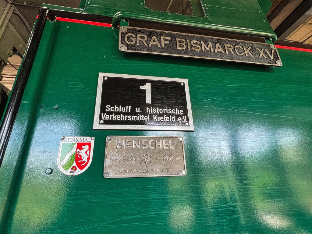 Schließlich durfte ich noch einen kurzen Bick auf die Lok des historischen Krefelder Dampfzugs Schluff werfen, die derzeit leider in der Werkstatt steht (nicht Teil des Museums). Die Dampflok „Graf Bismarck XV“ (Baujahr 1947) fuhr früher auf Zeche Bismarck in Gelsenkirchen und hoffentlich bald wieder die Wagons von 1903-1912 zum Hülser Berg. Derzeit zieht den Schluff ersatzweise eine Diesellok.
