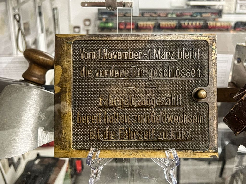 Historische Schilder „Nicht in den Wagen spucken“ oder „Fahrgeld passend bereithalten“ sind ebenso dabei wie ein alter Fahrkartenautomat, Fahrkarten aus alten Tagen (die aus Pappe) oder die Münzwechsler die mancher vielleicht noch in fest verbauter oder mobiler Form (als Umhängetasche) kennt. Der Fahrschalter einer Straßenbahn, Karbidlampen, Fahrtzielanzeiger, Signalhörner, Fahrscheine vom Abreißblöckchen und eine Modellbahnanlage im H0-Maßtab, die den Nordbahnhof um 1900 zeigt, runden die kleine Ausstellung ab. Unterstützt die Ausstellung, kommt alle vorbei, wer weiß, wie lange es sie noch gibt.