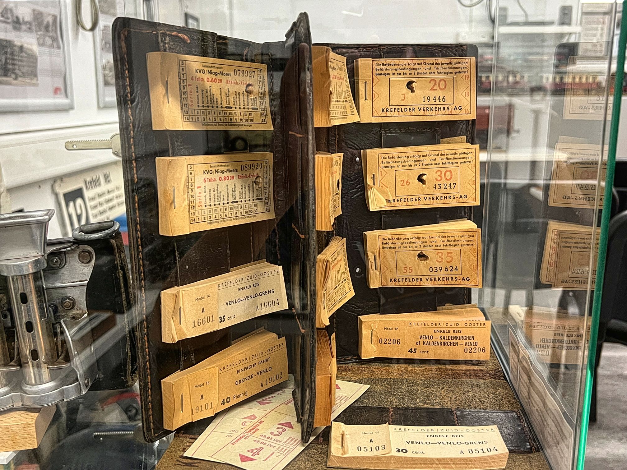Als ich zur Türe reinkomme, kommt mir schon eine Modelleisenbahn im Flur entgegen gefahren. Das kleine Museum präsentiert den Besuchern die Entwicklung der Krefelder Eisenbahn, der Straßenbahn und des Omnibusverkehrs. Während es bis in die 1980’er Jahre noch ein Außengelände mit historischen Fahrzeugen gab, gibt es jetzt nur noch eine Sammlung mit Fahrzeugmodellen, Bildern und Ausrüstungs-gegenständen, die in jedem Bus bzw. jeder Straßenbahn und in manchen Büros der SWK zu finden waren.