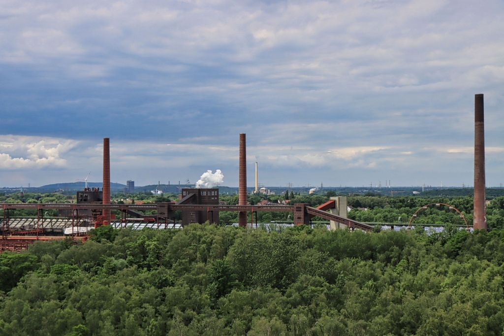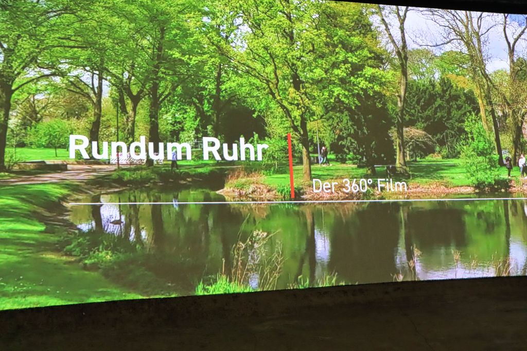 Dorthin ging es auch zuerst. Wo heute das 360 Grad Kino ist, war früher der Rundeindicker. Ja, der heißt wirklich so und diente früher der Wasseraufbereitung, indem Schlammreste und Wasser in ihm getrennt wurden. Zu erreichen ist das Kino durch das Portal der Industriekultur (welches an normalen Tagen Eintritt kostet). Auf vier (Lein-)Wänden wird eine Art großformatiger ca. 20 minütiger Imagefilm über das Ruhrgebiet gezeigt. Daher der naheliegende Titel „Rundum Ruhr“. Anschließend bin ich der Kohlenwäsche mal wieder aufs Dach gestiegen, immerhin ohne daß es, wie sonst so häufig, geregnet hat.
