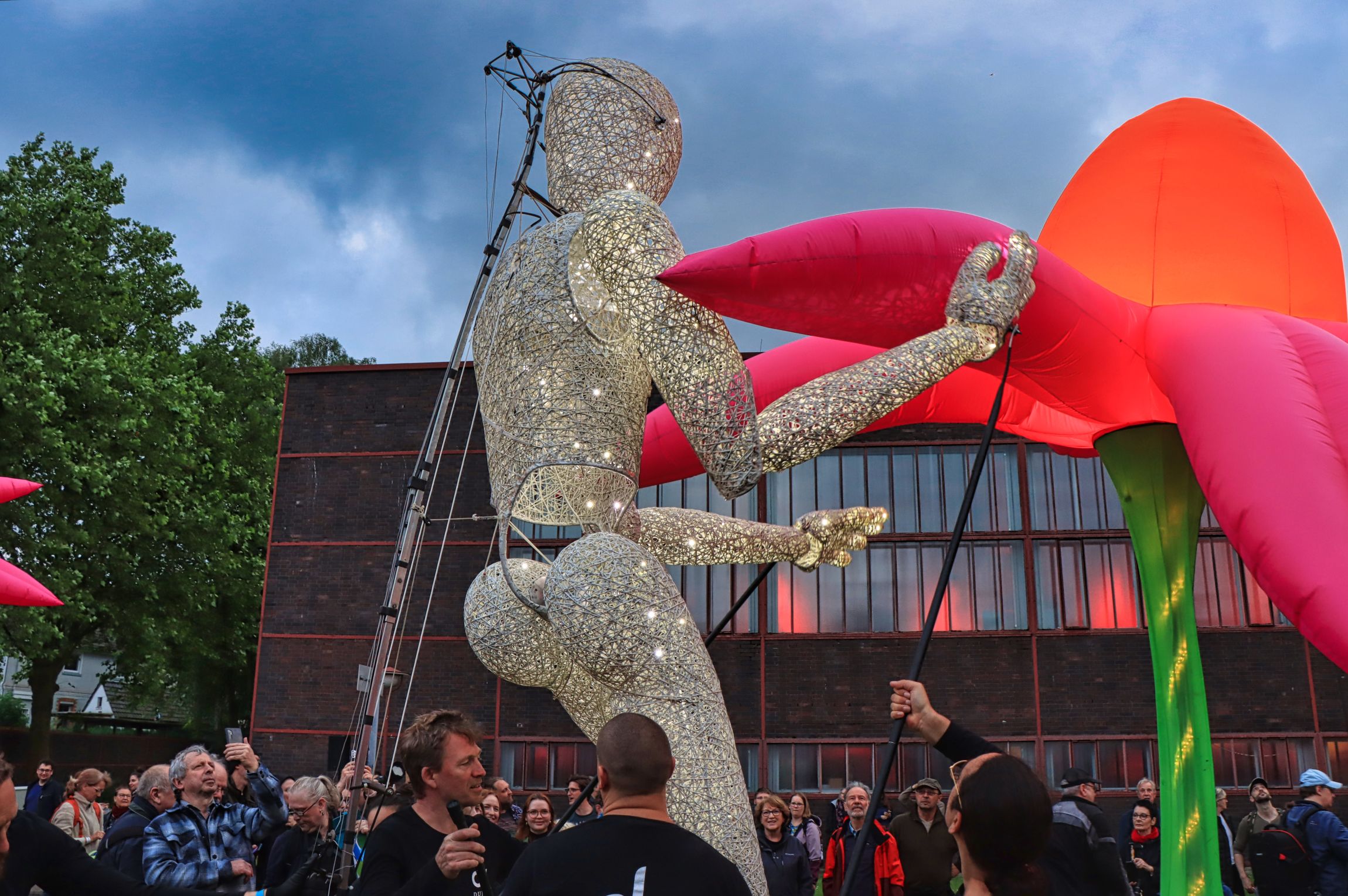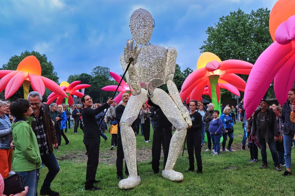 Am Samstag war dann also Extraschicht und ich konnte in aller Ruhe draußen die Kamera auf das eine oder andere halten, denn das Museum hatte ich ja erstmal abgehakt. Dundu, die überlebensgroße Figur, die so locker leicht von fünf „Puppenspielern“ bewegt wird, war das Highlight des Abends. Wie gemacht für die riesigen illuminierten Blumen und live begleitet von einer Kora, einem Harfeninstrument, das vorzugsweise in Westafrika gespielt wird. Überhaupt gab es ganz viel Musik über den Abend.
