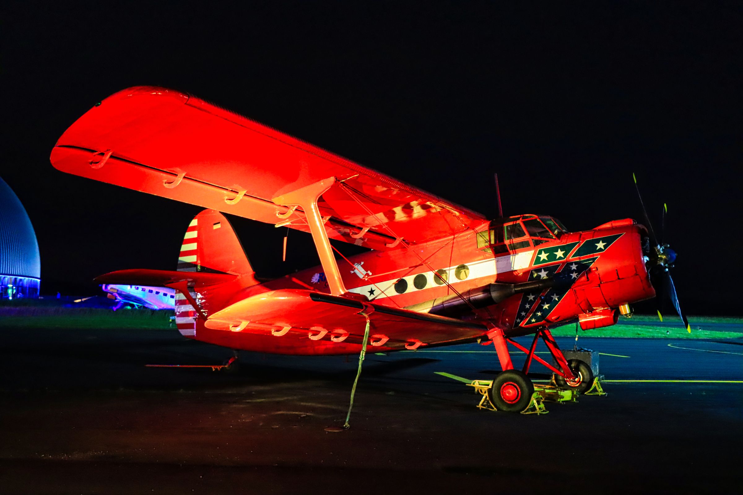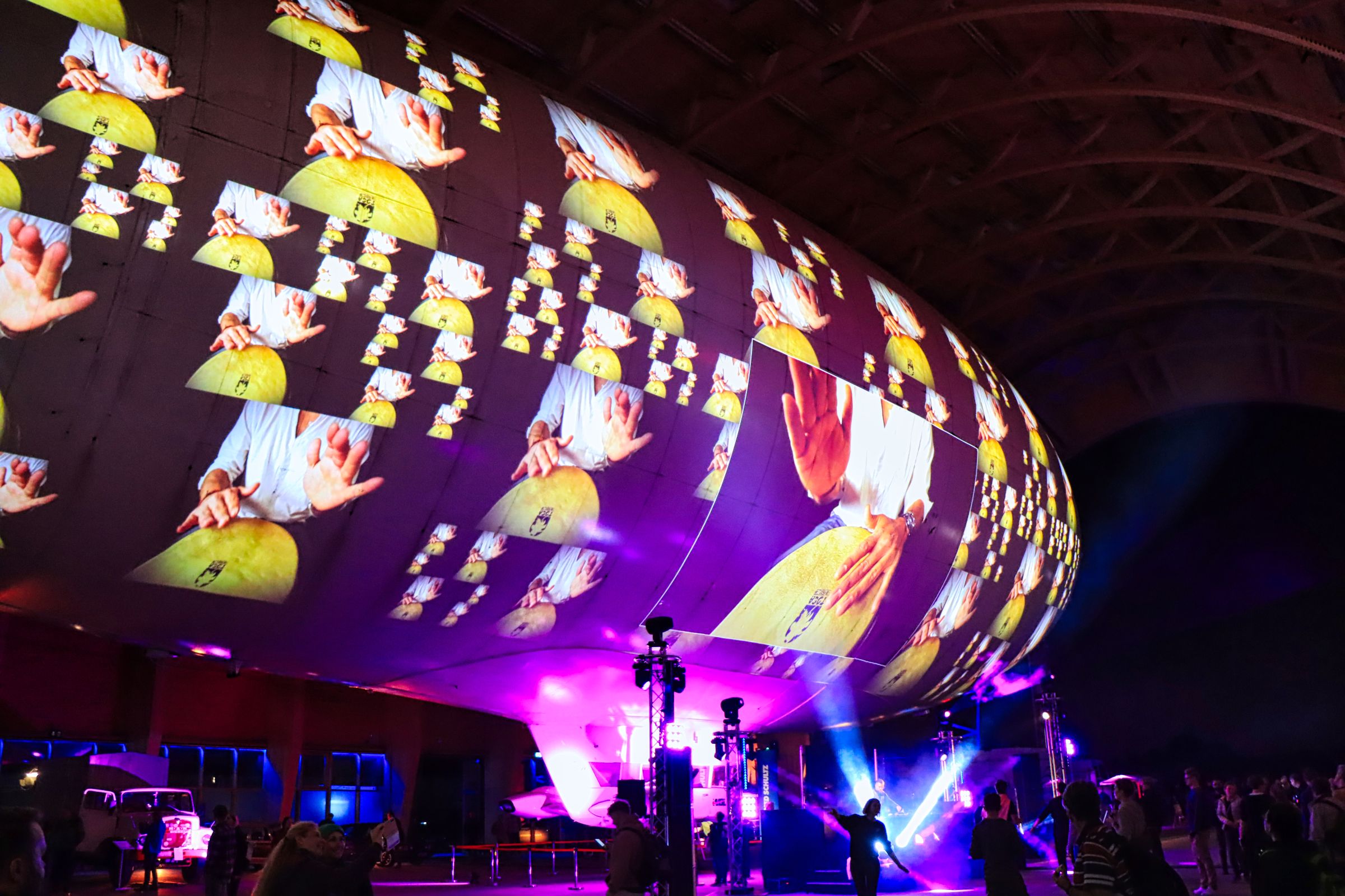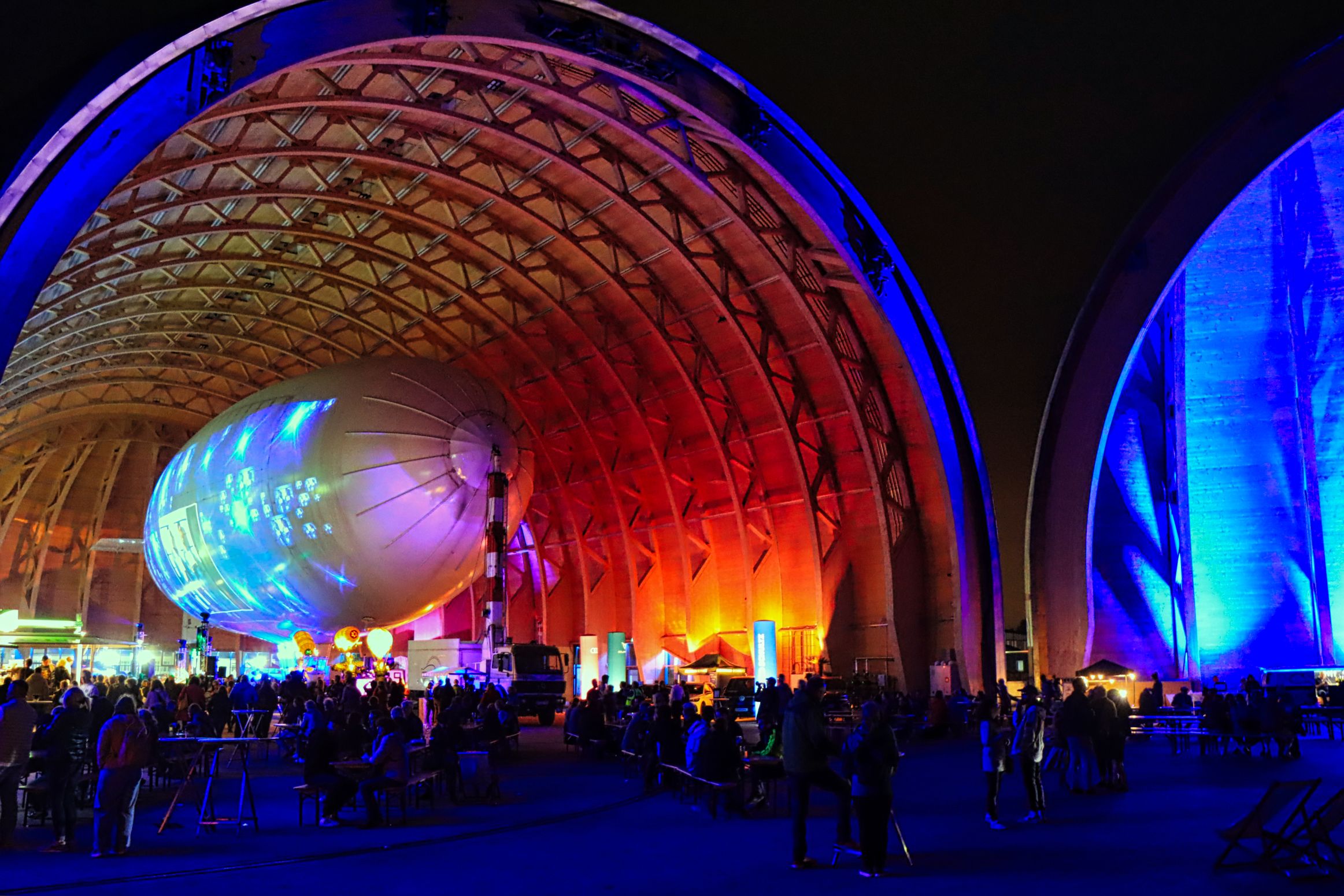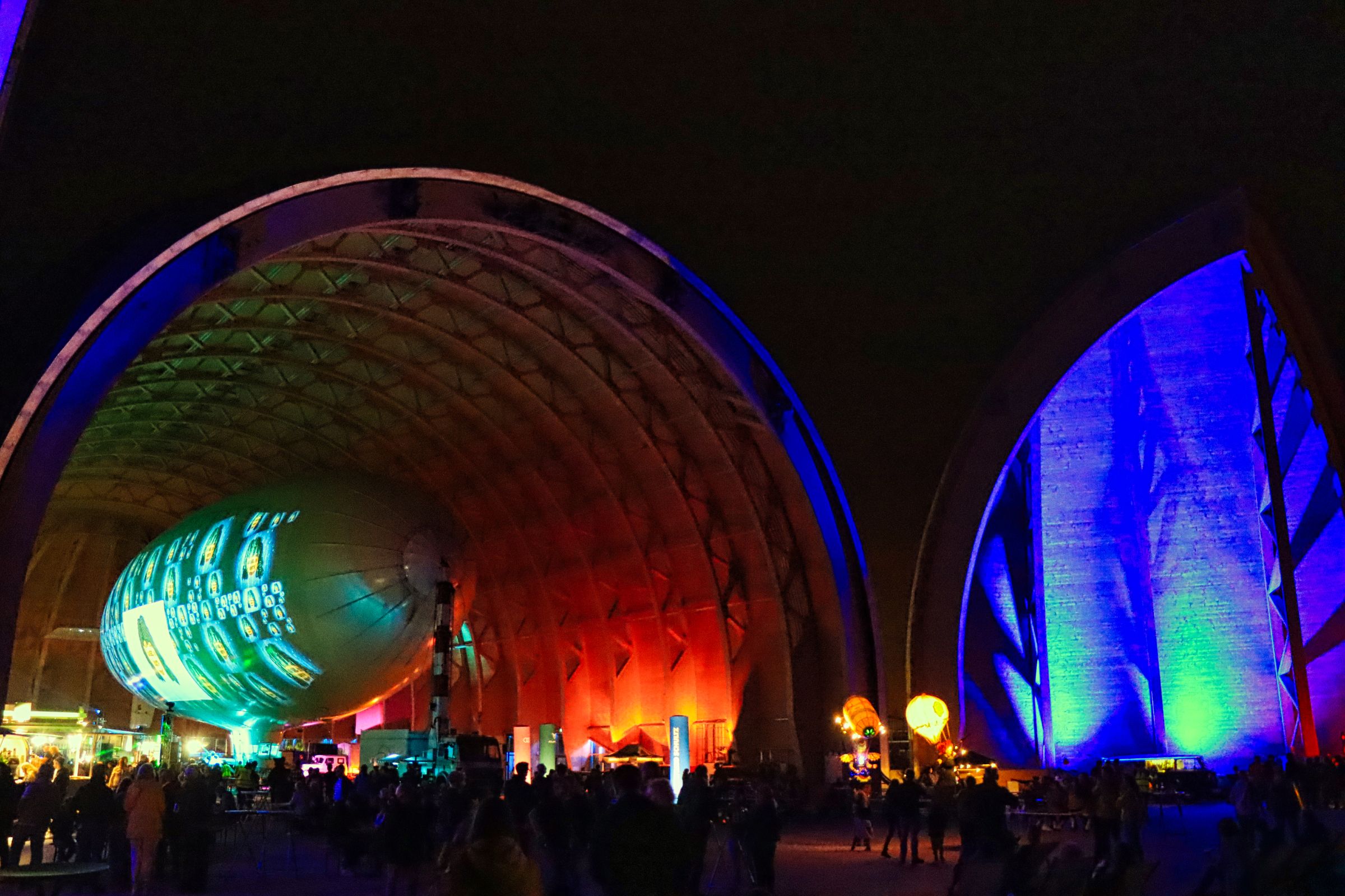 Das Luftschiff namens Theo, mittlerweile was den Flugbetrieb betrifft ja von Hugo abgelöst, wurde mit einer Videoprojektion, passend zur Musik, bespielt, so eine Art überdimensionaler Videoclip. Die Musik war vielleicht etwas laut, aber die Show an sich war gut. Dazu gab’s noch ein paar Oldtimer, umstehende Kleinflugzeuge wurden genauso wie die Ju52 beleuchtet nur mit den Pommes gings, während ich in der Schlange stand, leider zu früh zu Ende. Also noch ein paar Bilder von der Luftschiffhalle und dann gegen Mitternacht ab nach Hause. Die restlichen Bilder gibt’s bei Flickr und Google Photos.