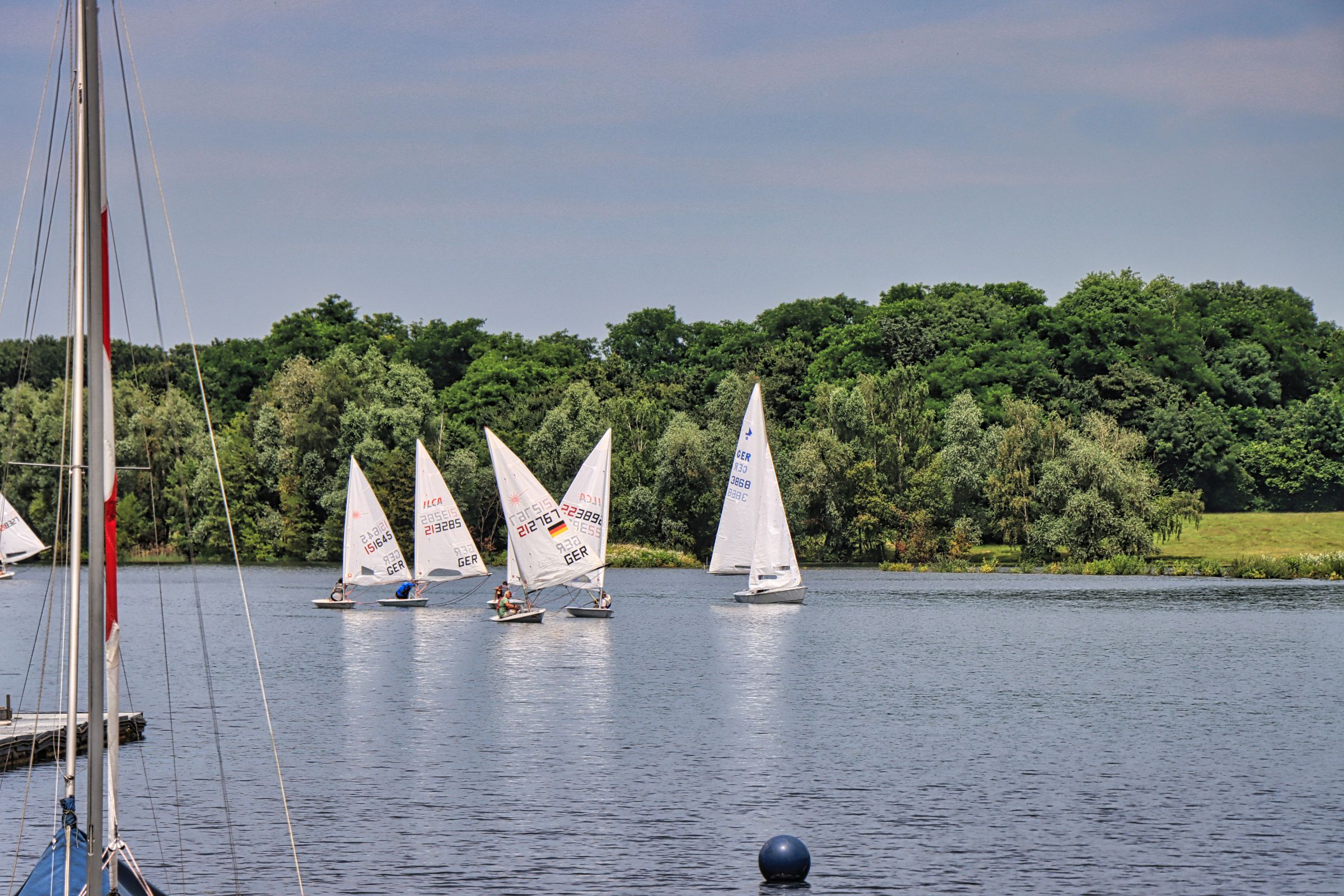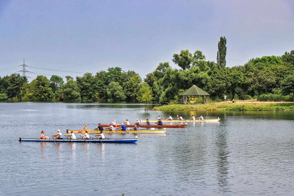 Der nächste Triathlon findet übrigens am Sonntag den 25. August 2024 statt. Ansonsten halte ich mich von derart sportlichen Aktivitäten eher fern, spaziere lieber entlang der Regattastrecke und beobachte die Segelboote. Der Weg ist gepflastert und damit gut zu begehen, selbst bei diesem feuchten Sommer. Hinter den parallel verlaufenden Feldern ist in der Ferne kurz mal die Autobahn zu sehen. Es war mir gar nicht klar, daß der Erholungspark Elfrather See so nah an der A57 liegt. Fast wieder am Ausgangspunkt angekommen, entdecke ich dann noch ein paar Ruderboote, die am heutigen Krefelder Rudertag teilnehmen und eine kleine Regatta veranstalten.