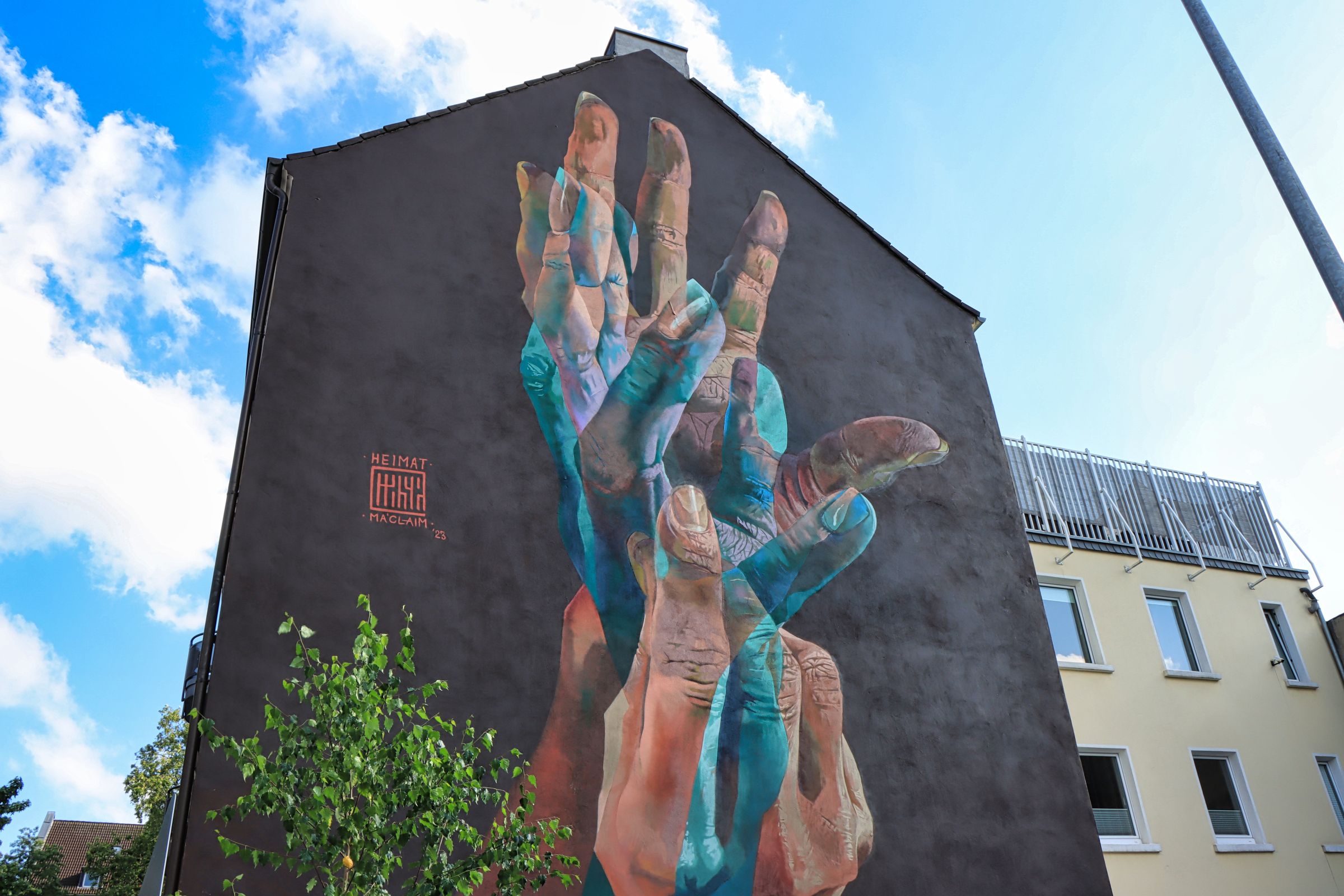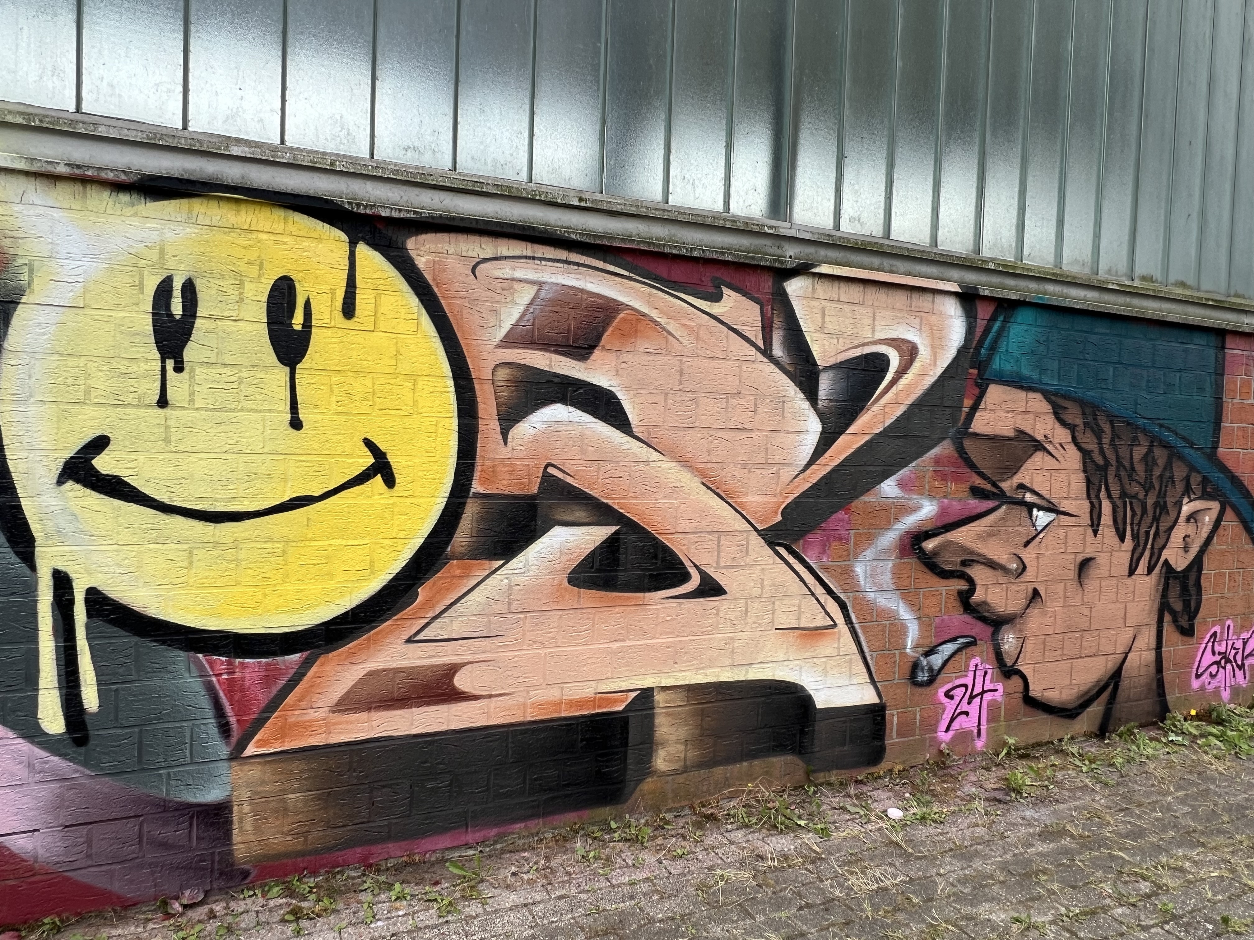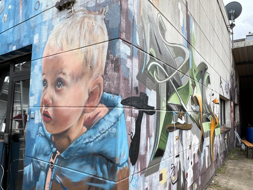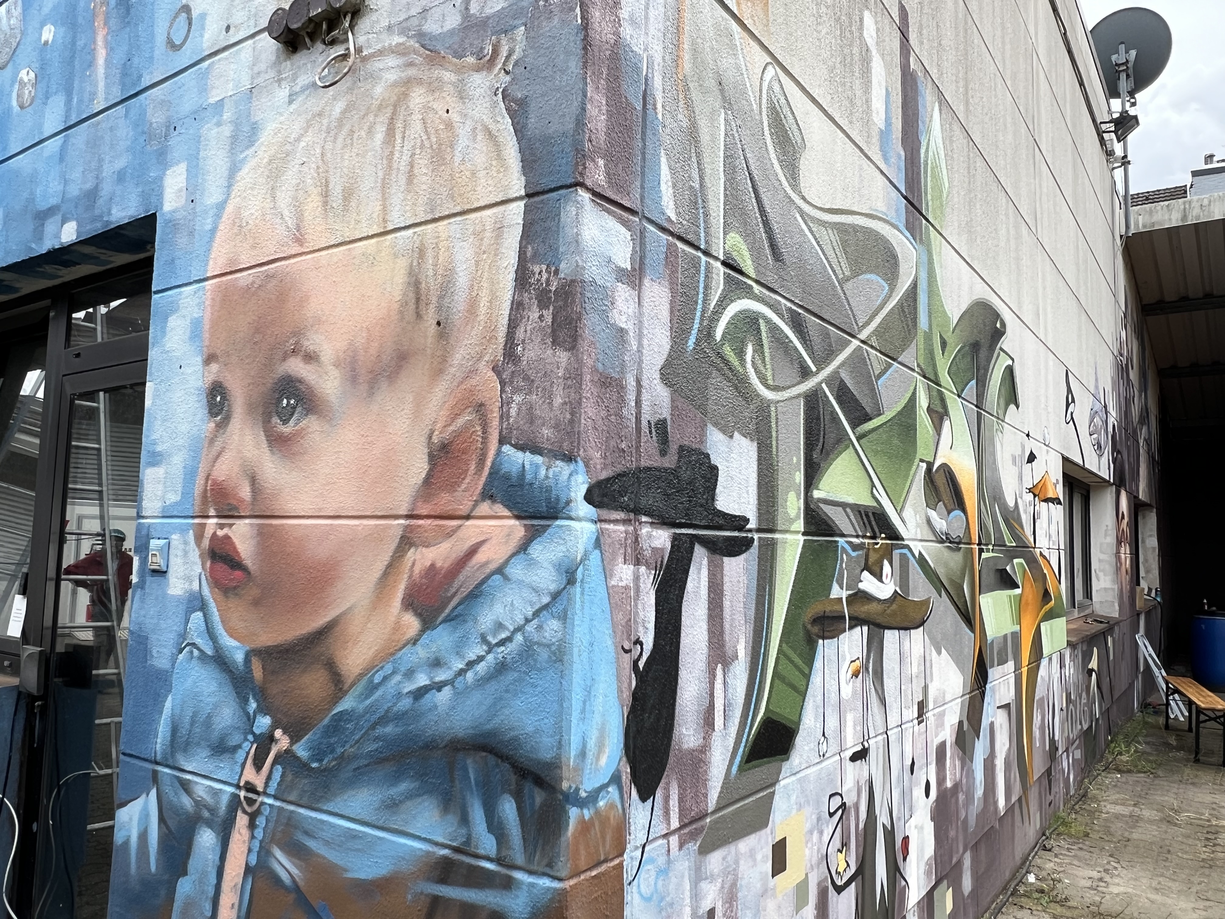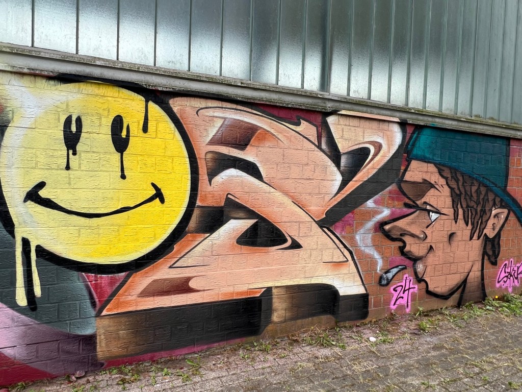Über einen Stopp am Seidenweberhaus und an der Königstraße ging es über den Norwall zu einem nagelneuen Wandbild von Gizem Erdem, das an der Dionysiusstr. 60 noch in Arbeit war. Als wir über die Westparkstr. links abbiegen, wird es für einen Moment ländlich, obwohl wir eigentlich noch fast mitten in der Stadt sind. Auf dem Firmengrundstück von ReGINerate (der GIN aus Krefeld) wurde soviel neues gemalt, ich habe nicht mal geschafft alles zu fotografieren. Die angepeilte Zeit von 2 Stunden ist mittlerweile schon überschritten, aber es gibt noch mehr.