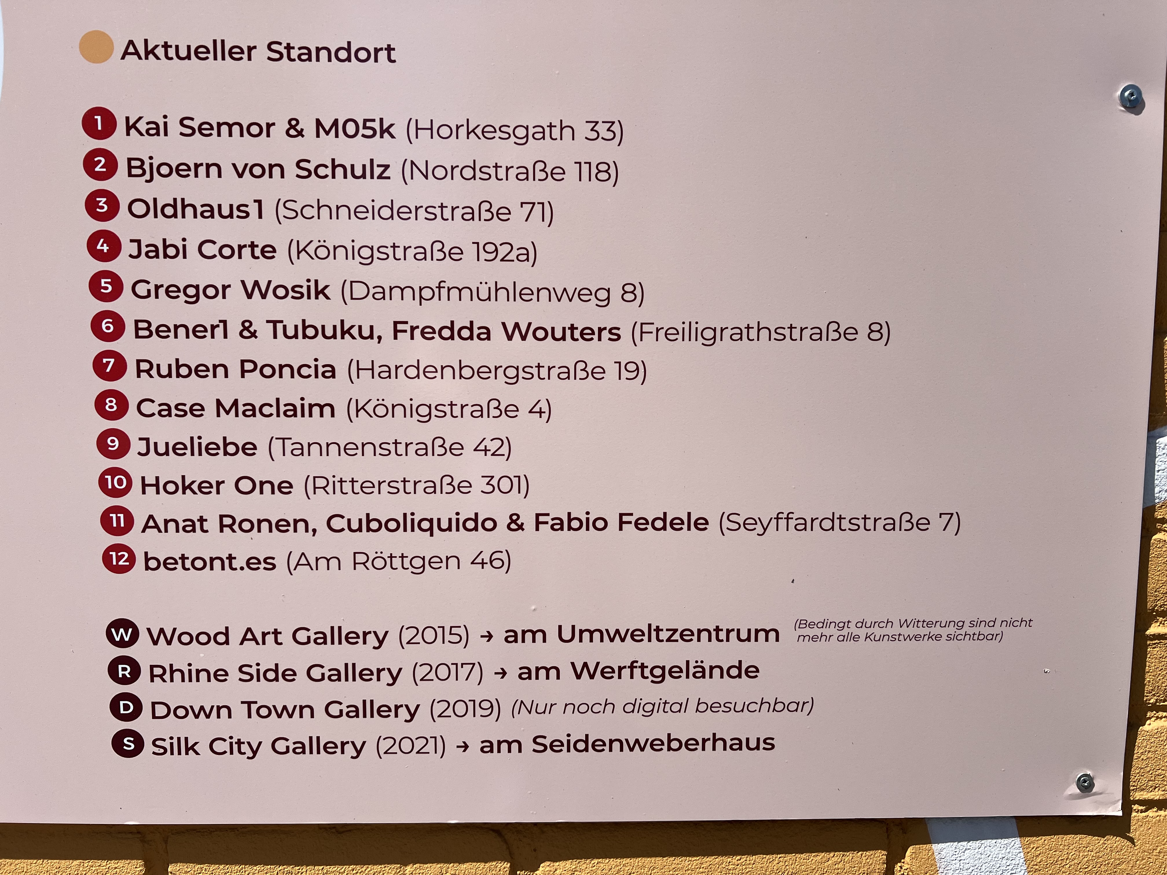 Zum Schluß noch der Hinweis, daß ihr gegenüber vom Krefelder Großmarkt entlang der Mauer zum Sportplatz noch eine Übersicht incl. QR-Code und den eindeutigen Hinweis „Entdecke die Urban Art Gallery 2023 in ganz Krefeld“ findet. Vielen Dank an das Stadtmarketing, daß ich die Tour mit führen durfte. Bliebe abschließend nur noch der Hinweis auf die Seite Krefeld.de bzw. den dortigen Rückblick auf den Raderlebnistag. P.S.: Von den mittlerweile bunt beklebten und bemalten Verteilerkästen in der Innenstadt erzähle ich euch dann beim nächsten Mal.