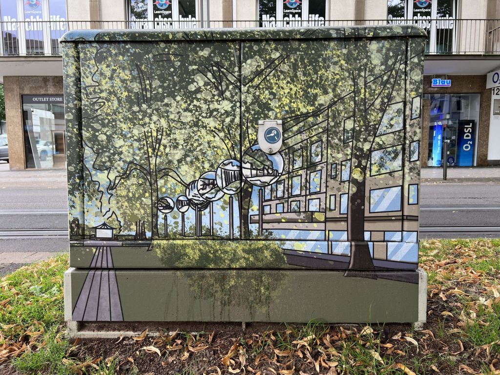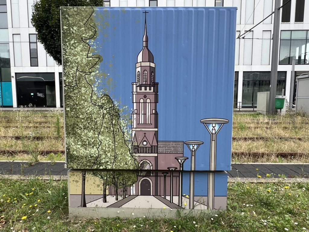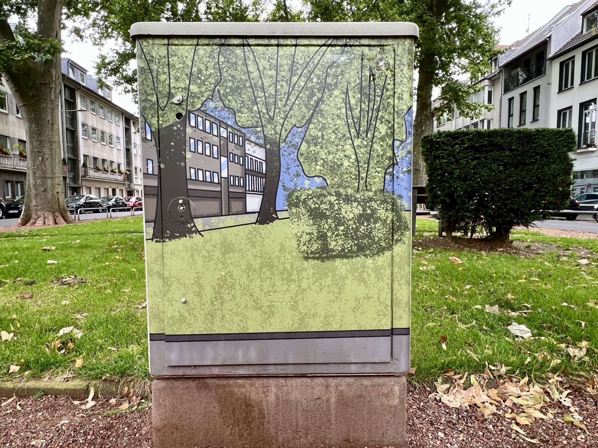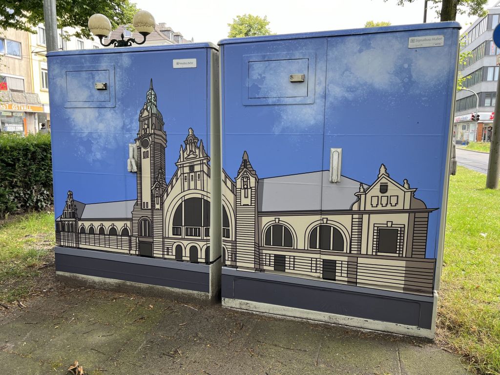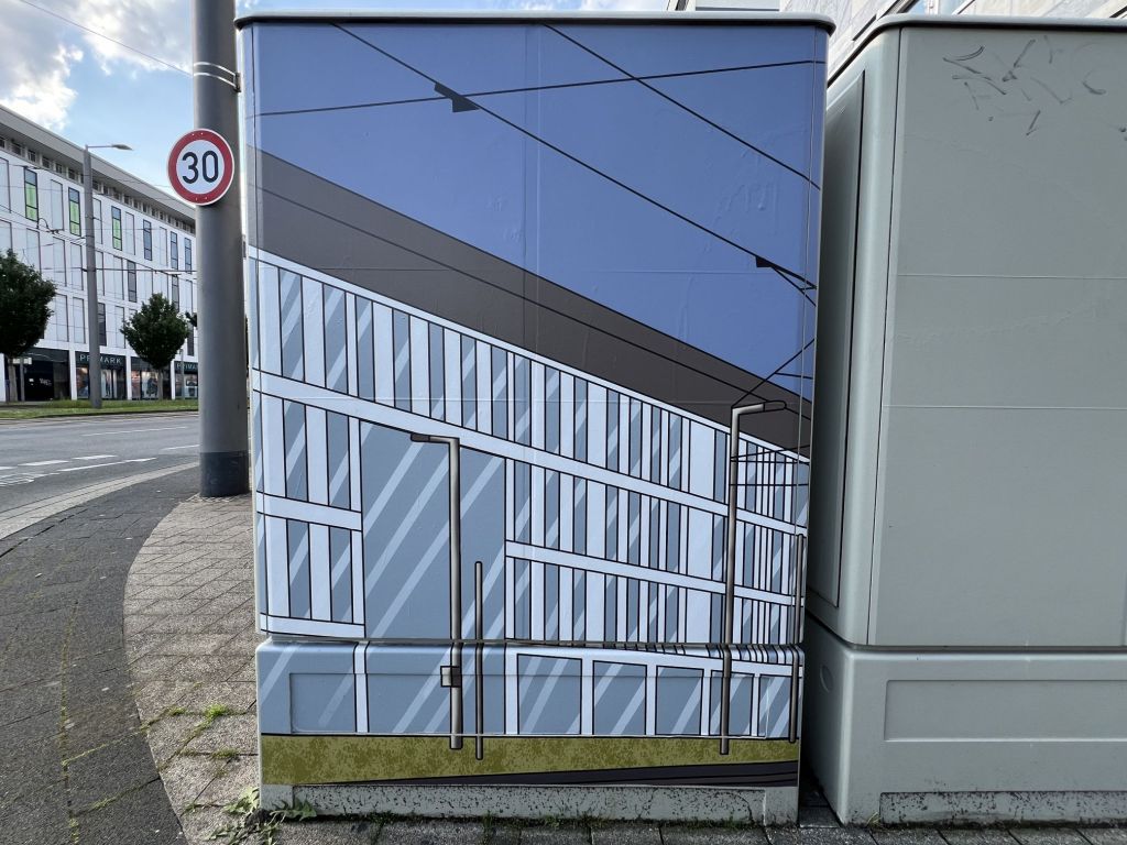 Die Dionysiuskirche ist dabei, ebenso wie z.B. der Hauptbahnhof. Und weil die Wälle schließlich ein bisschen Tradition haben, zeigen einige der Verteilerkästen auch den jeweiligen Wall bzw. die Kunst, die auf dem Wall zu finden ist (z.B. die Glaslinsen oder der Ostwallpavillon). Die Aktion nennt sich in Anlehnung an die StreetArt Kunst KastenArt. In zwei Fällen sind die Kästen sogar derart bemalt, daß sie sich in die Umgebung einfügen, als wären sie gar nicht vorhanden. In den anderen Fällen lohnt es sich, mal den Kopf zu heben, denn oft ist das abgebildete Gebäude direkt dahinter oder nur eine Straßenseite entfernt.