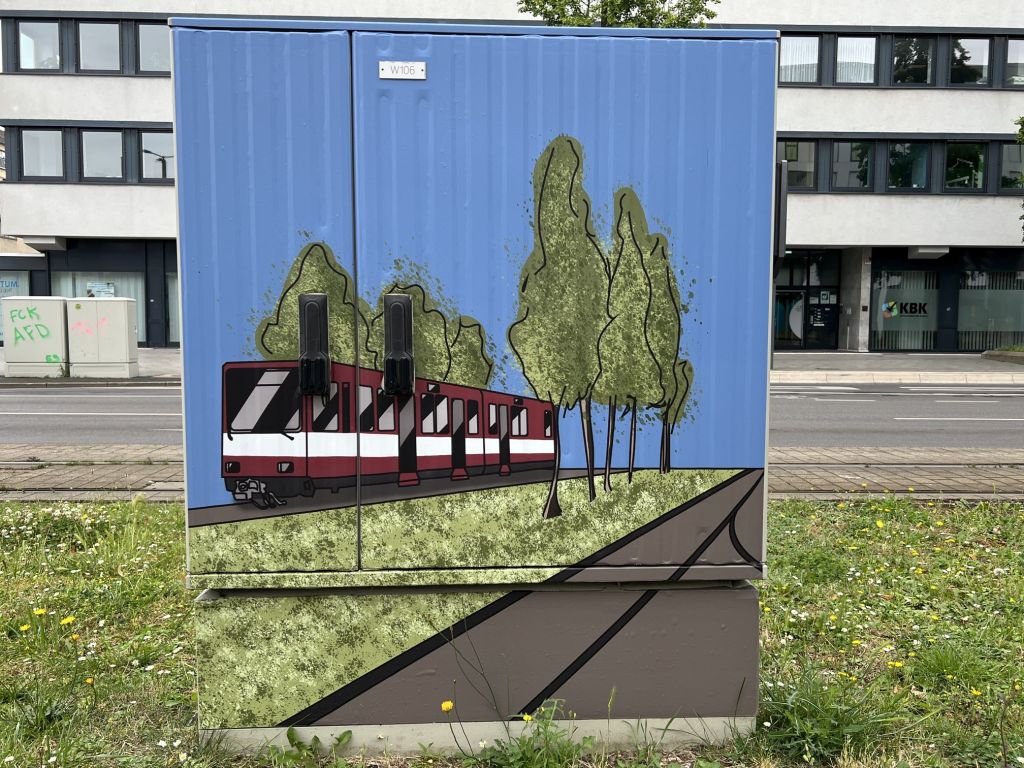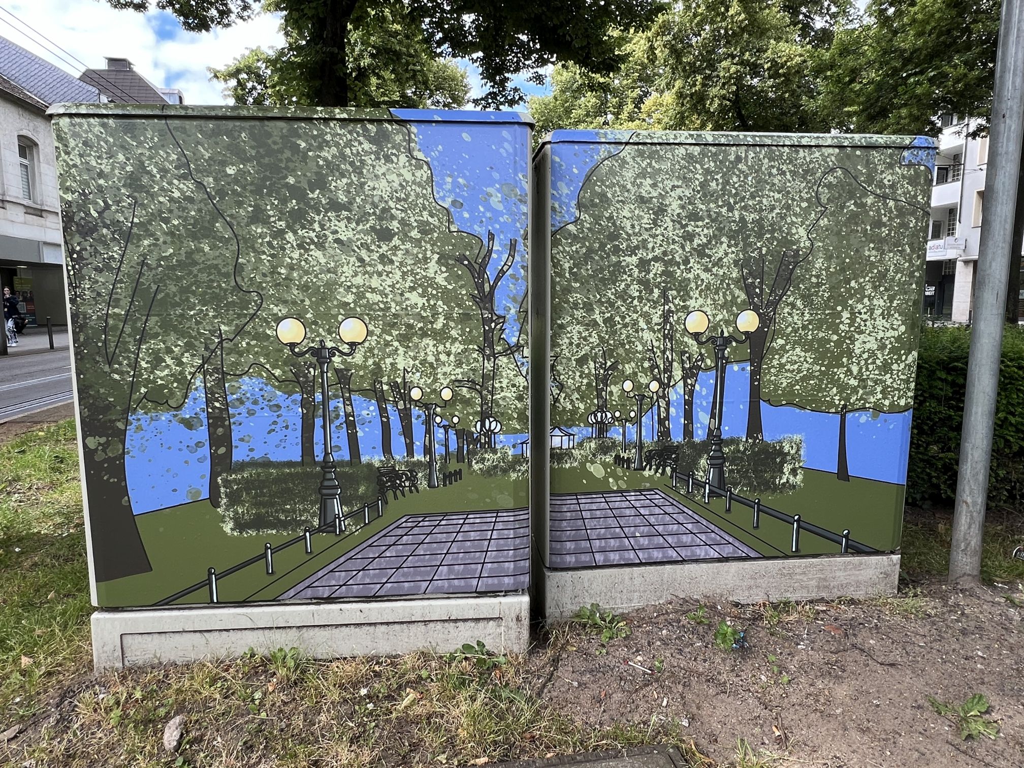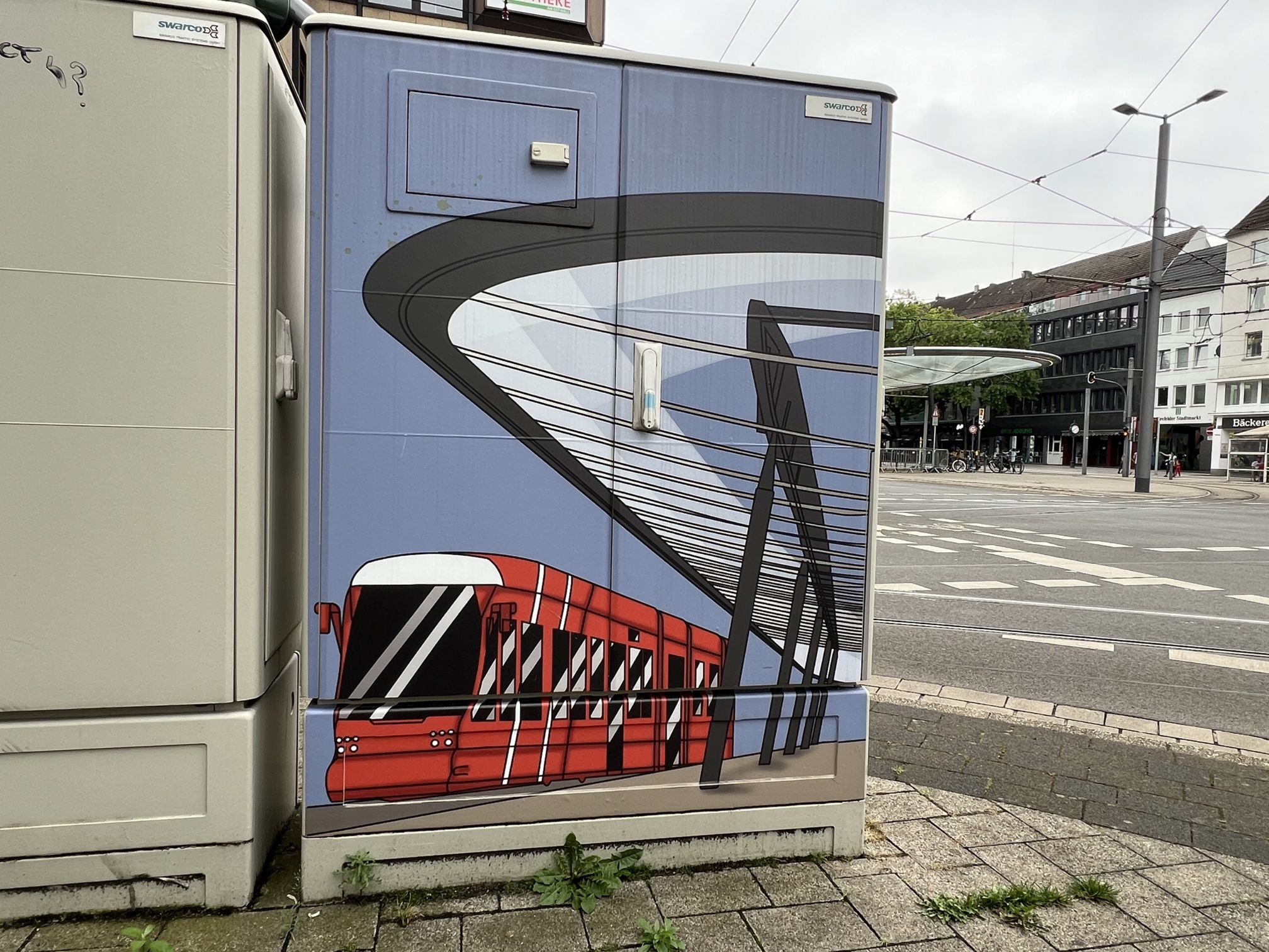 Habt ihr schon mal von Adolph von Vagedes gehört? Er hat vor über 180 Jahren die vier Wälle (Nord-, Ost-, Süd- und Westwall) konzipiert, die heute noch die Grenze der sogenannten Innenstadt in Krefeld bilden und ja, es gibt auch eine nach ihm benannte Straße (Nähe Friedrichsplatz). Wenn man diese Wälle aktuell abläuft, was zum Teil über einen breiten Grünstreifen möglich ist, findet man seit einiger Zeit ebenfalls bunt bemalte bzw. beklebte Kästen. Sie zeigen in den meisten Fällen Gebäude, die sich im unmittelbaren Umfeld befinden. Rund um die Haltestelle Rheinstraße sieht man auf ihnen die Straßenbahn aus Krefeld und aus Düsseldorf (U76).
