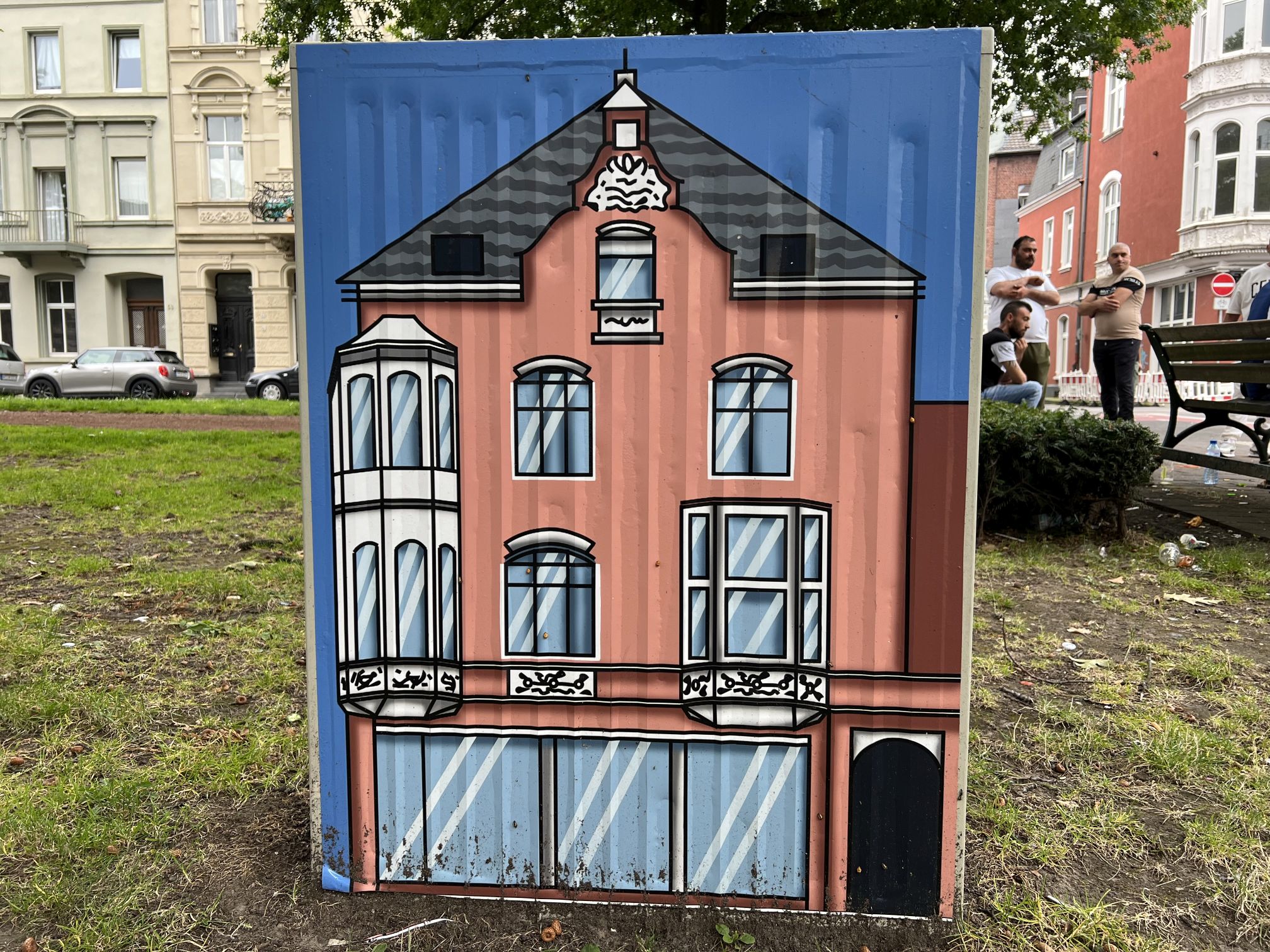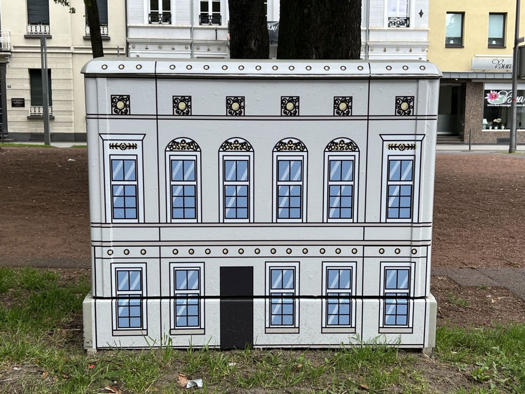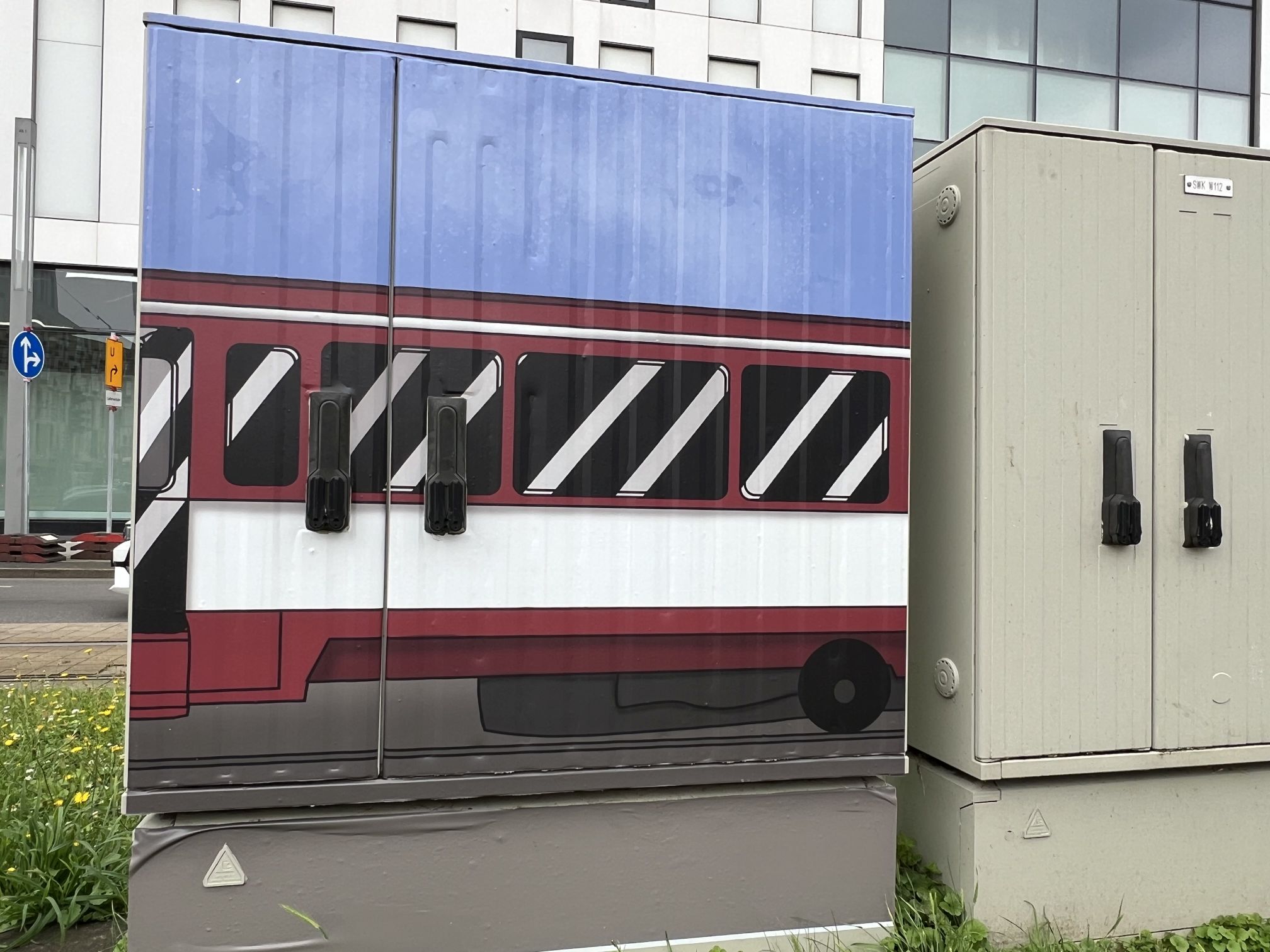 Habt ihr schon mal von Adolph von Vagedes gehört? Er hat vor über 180 Jahren die vier Wälle (Nord-, Ost-, Süd- und Westwall) konzipiert, die heute noch die Grenze der sogenannten Innenstadt in Krefeld bilden und ja, es gibt auch eine nach ihm benannte Straße (Nähe Friedrichsplatz). Wenn man diese Wälle aktuell abläuft, was zum Teil über einen breiten Grünstreifen möglich ist, findet man seit einiger Zeit ebenfalls bunt bemalte bzw. beklebte Kästen. Sie zeigen in den meisten Fällen Gebäude, die sich im unmittelbaren Umfeld befinden. Rund um die Haltestelle Rheinstraße sieht man auf ihnen die Straßenbahn aus Krefeld und aus Düsseldorf (U76).