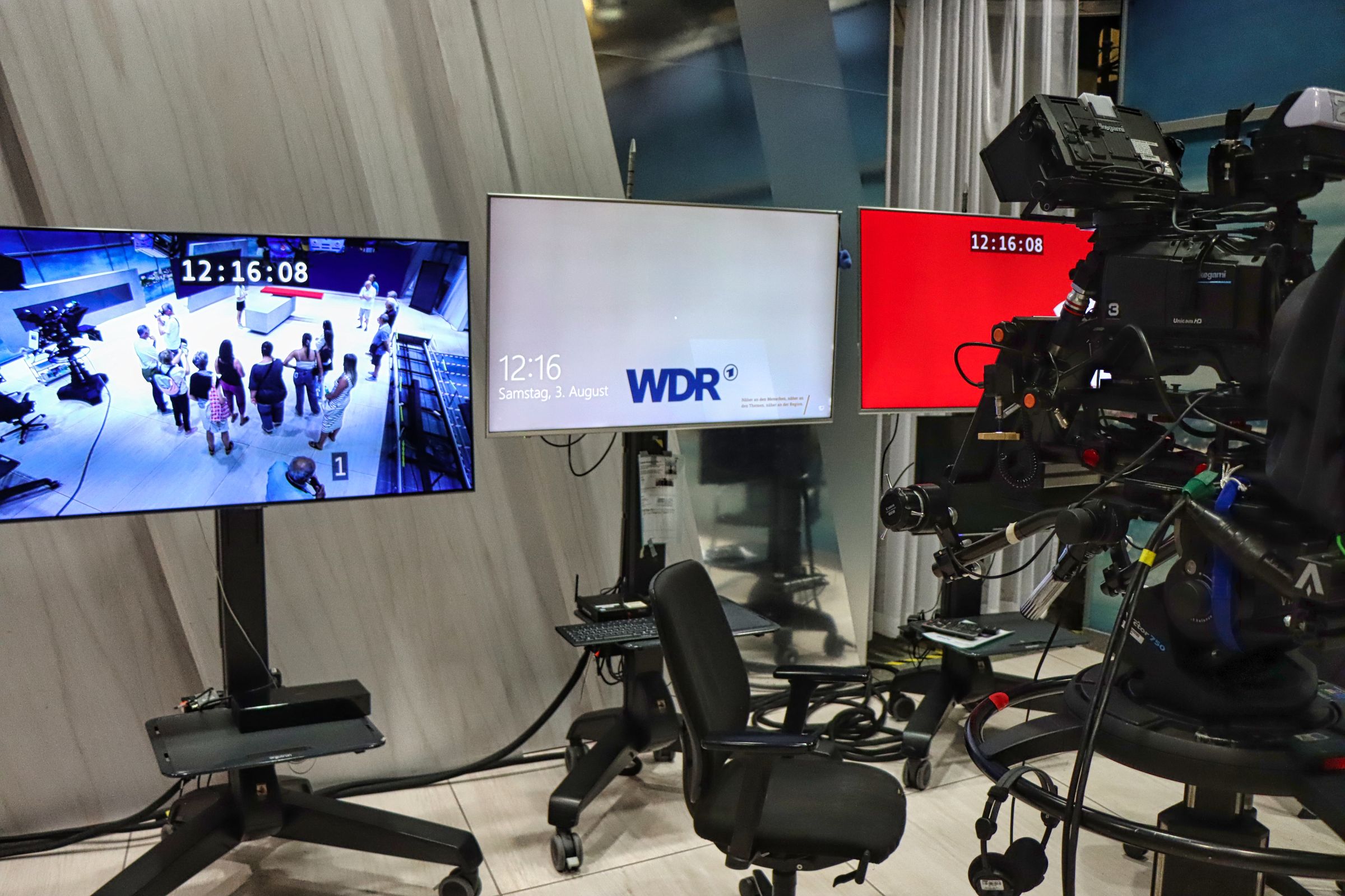 Auf Grund der Pandemie lange Zeit ausgesetzt, sind Führungen jetzt wieder möglich. Auch ihr könnt euch ganz einfach hier anmelden. Wir begeben uns als erstes in das Studio, daß ihr aus den Nachrichtensendungen des WDR (Aktuelle Stunde, WDR aktuell) kennt. Früher in Düsseldorf, jetzt zentral hier in Köln. Daran anschließend geht es unter die Erde. Weil der Dom gleich um die Ecke steht, hat der WDR sein Gebäude nicht nur 5 Etagen nach oben sondern auch 5 Etagen nach unten gebaut und dort befinden sich die Studios des Morgenmagazins (auch genutzt für Hier und Heute, Servicezeit, Presseclub u.a.), der Sportschau oder Maischberger bzw. Hart aber Fair. Schon erstaunlich, was man hier auf z.T. kleinem Raum untergebracht hat.