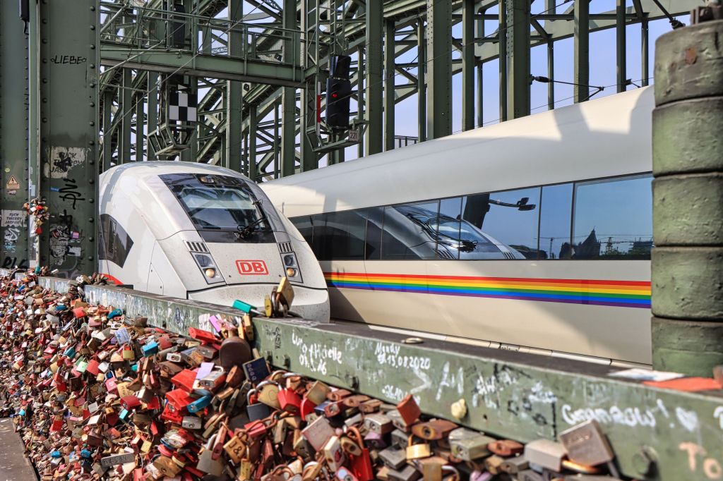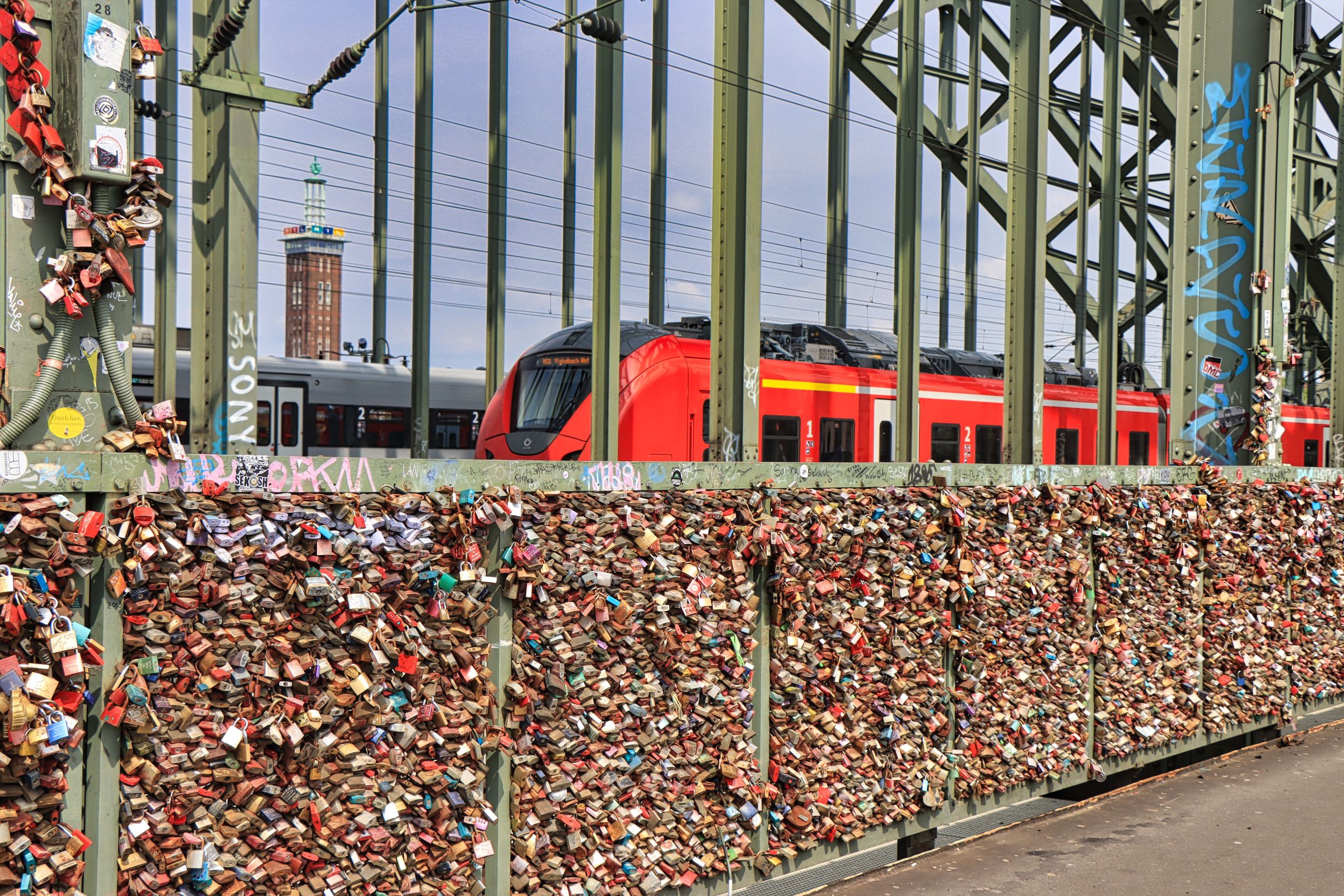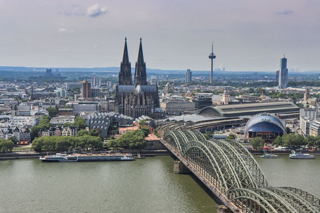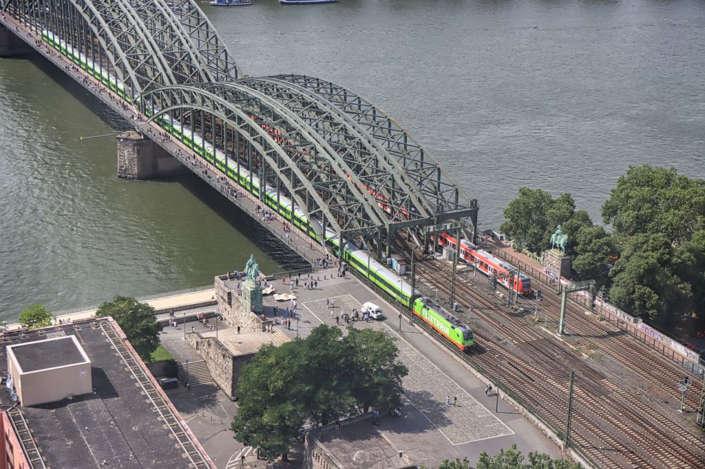 Nach Mittag hatten sich ein paar blaue Lücken im Himmel aufgetan, also noch etwas Zeit, sich zwischen Dom und Hohenzollernbrücke umzusehen. Das große gläserne Gebäude (LVR Turm) auf der Deutzer Seite, genannt Triangle, bietet in der 29. Etage eine wunderbare Aussichtsplattform in 103 m Höhe. Keine Angst, die Plattform ist rundum verglast, nur nach oben ist sie offen. Mit 5,- € Eintritt seid ihr dabei und während es beim letzten Mal eine Warteschlage gab, war jetzt kaum was los.