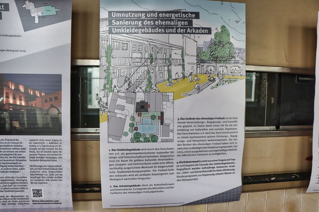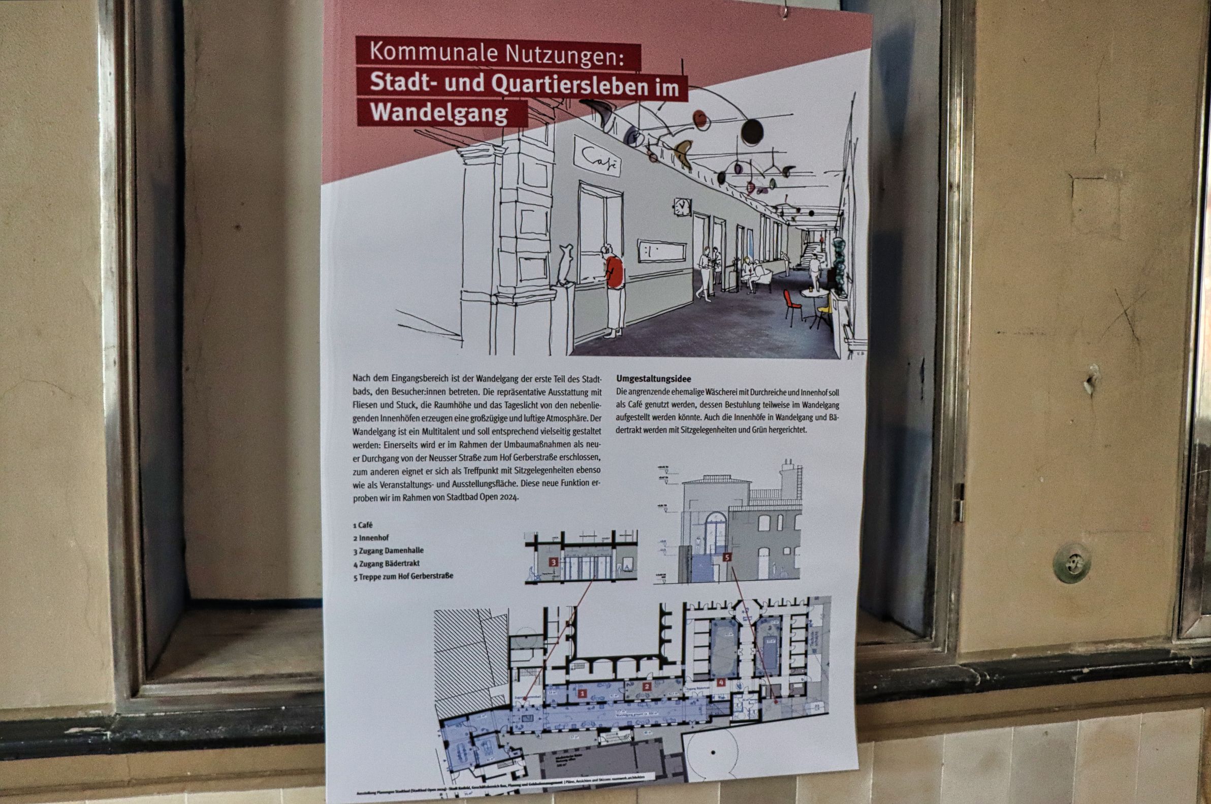 Das alles passiert im Außenbereich. Und drinnen? Ja, dort ist auch einiges passiert, nicht nur neue Fenster oder das Freilegen der Wände von altem Putz (ich schrieb darüber bereits 2020), vom 23. August bis zum 21. September 2024 gibt es einen vierwöchigen Aktionszeitraum, in dem Teile des Gebäudes wieder bei einer Führung besichtigt werden können. Dazu Workshops, verschiedene Veranstaltungen (Comedy & Theater) und die Einladung eigene Ideen beizusteuern. Eine permanente Ausstellung zeigt, wie die Planungen für das neue Stadtbad aussehen (könnten). Mehr zu Terminen findet ihr hier.