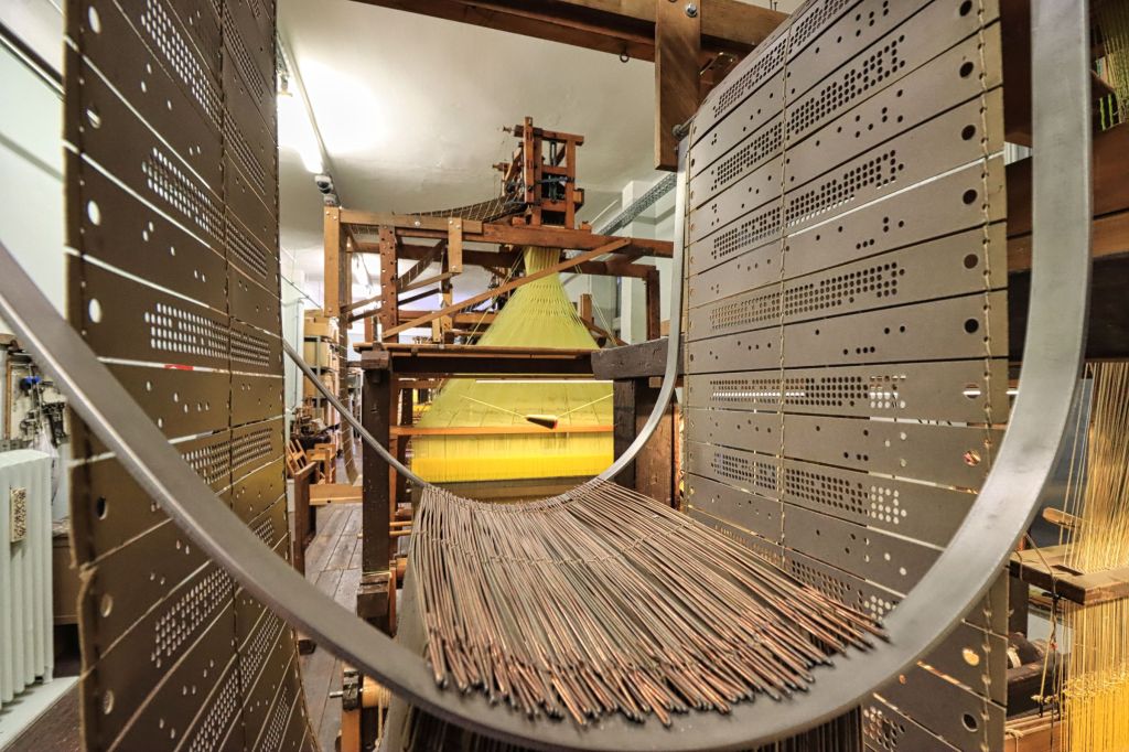 Der alte Websaal beinhaltet eine ganze Reihe alter mechanischer Webstühle, die, so sagt mir das Internet, Jacquardwebstühle genannt werden, weil sie durch eine Art übergroße Lochkarte gesteuert werden. Weil die Kettfäden dabei einzeln hochgezogen werden, wurde das Weben groß gemusterter Gewebe möglich. Und wer hat sich damit Paramente (ein für mich neues Wort für aufwendig gestaltete Gewänder) machen lassen. Natürlich die katholische Kirche.