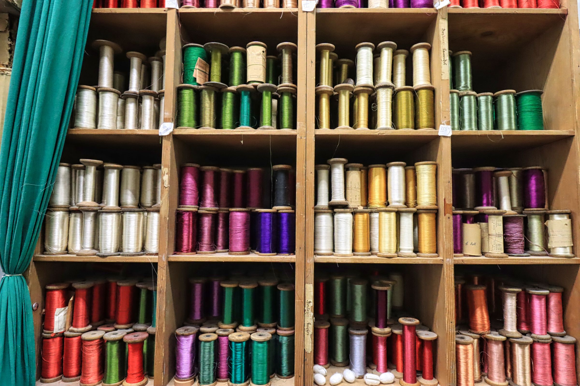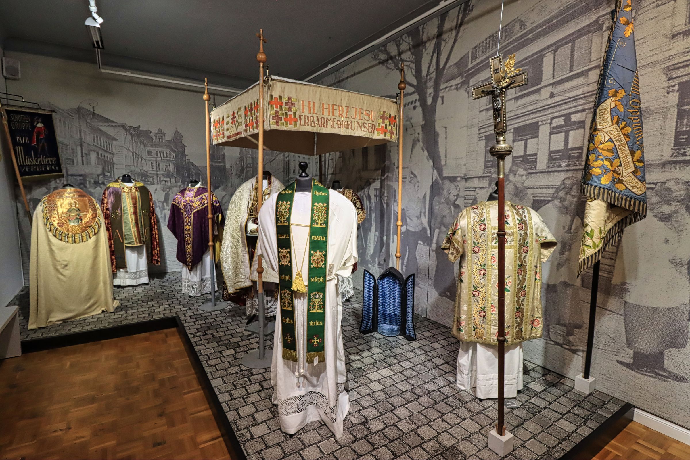 Der alte Websaal beinhaltet eine ganze Reihe alter mechanischer Webstühle, die, so sagt mir das Internet, Jacquardwebstühle genannt werden, weil sie durch eine Art übergroße Lochkarte gesteuert werden. Weil die Kettfäden dabei einzeln hochgezogen werden, wurde das Weben groß gemusterter Gewebe möglich. Und wer hat sich damit Paramente (ein für mich neues Wort für aufwendig gestaltete Gewänder) machen lassen. Natürlich die katholische Kirche.
