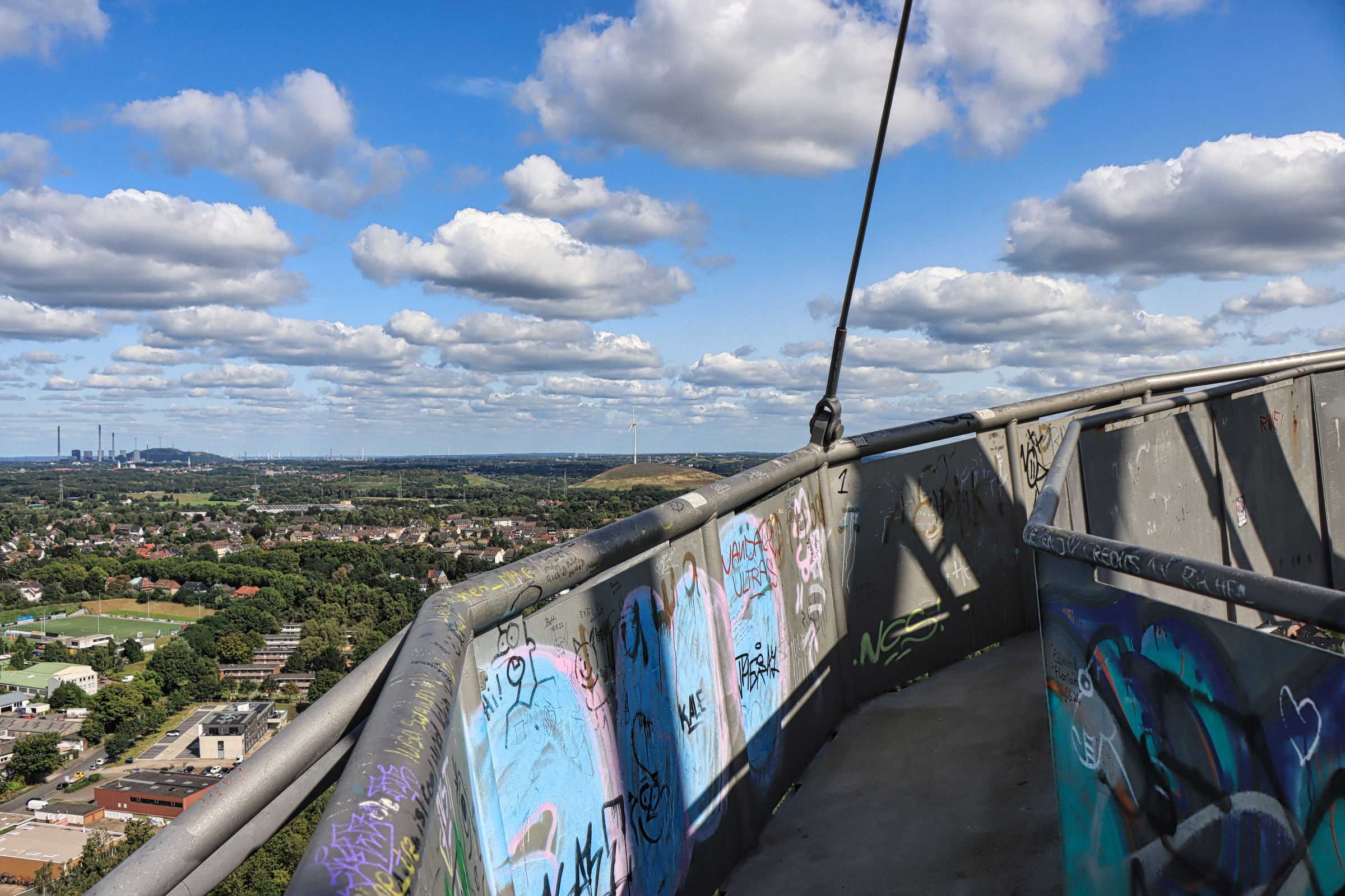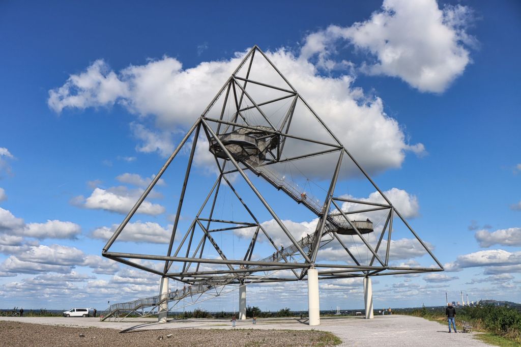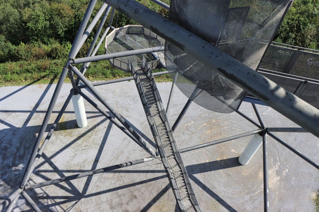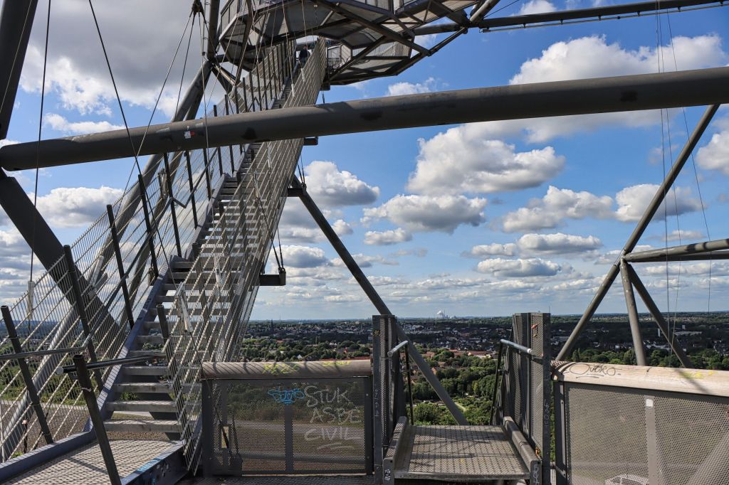Ich habe die Halde dieses mal wieder über die Treppe auf der Südseite erklommen. Bis zur Haldenkuppe sind es 382 Stufen, auf den Tetraeder selber noch mal gut 100 weitere. Wenn man das Haldenplateau erreicht, hat man immerhin schon eine Höhe von 65 Metern erreicht, der Tetraeder selbst hat eine Höhe von 50 Metern. Für Besucher geht es über Treppen auf drei verschiedene Aussichtsetagen. Einmal auf 18, auf 32 und auf 38 Meter. Nach einer kühlen Spätsommernacht war der Himmel ziemlich klar, die Aussicht dieses Mal daher gut.