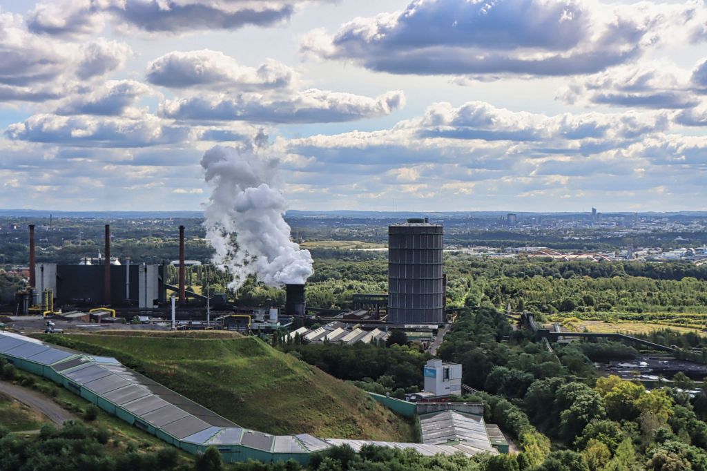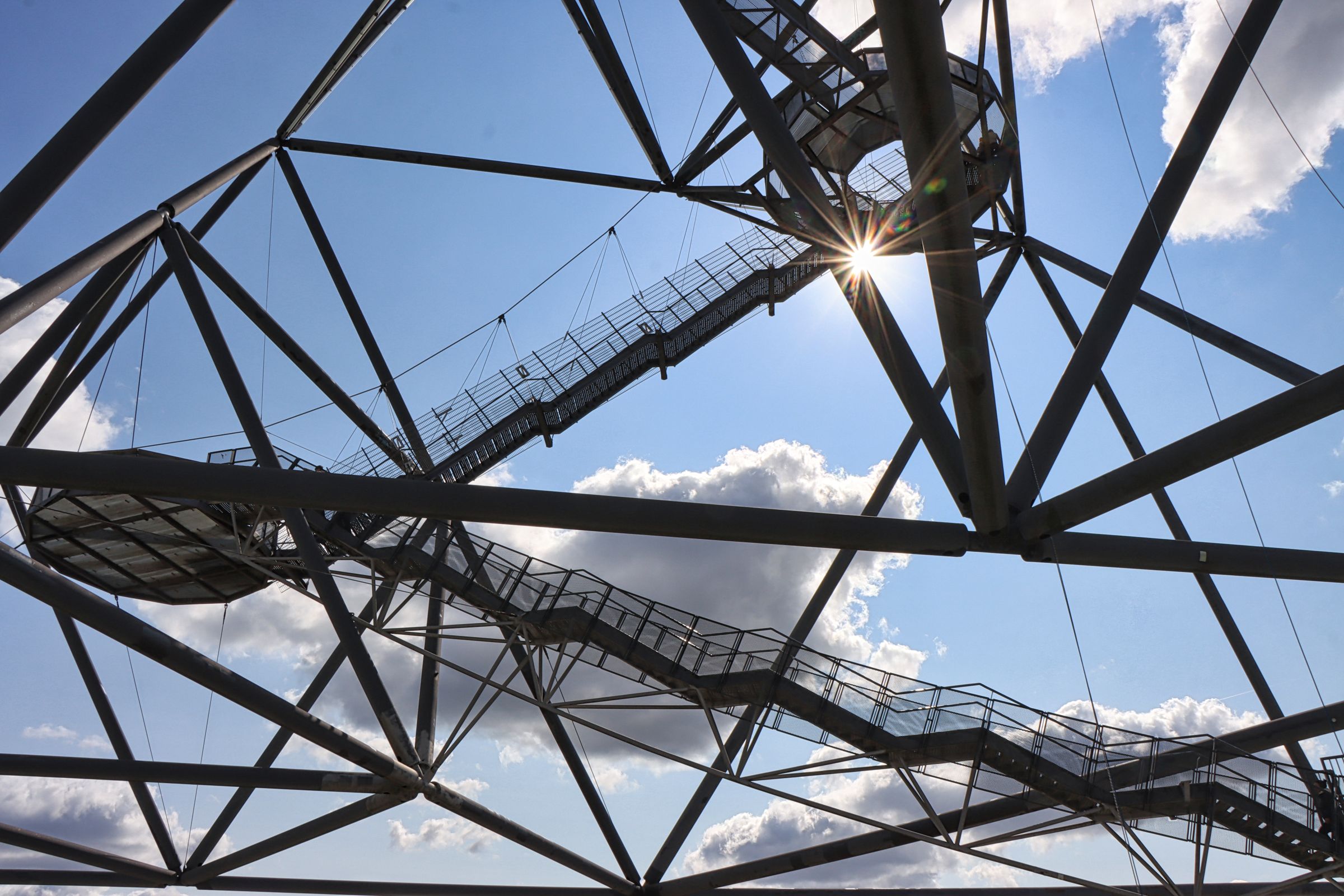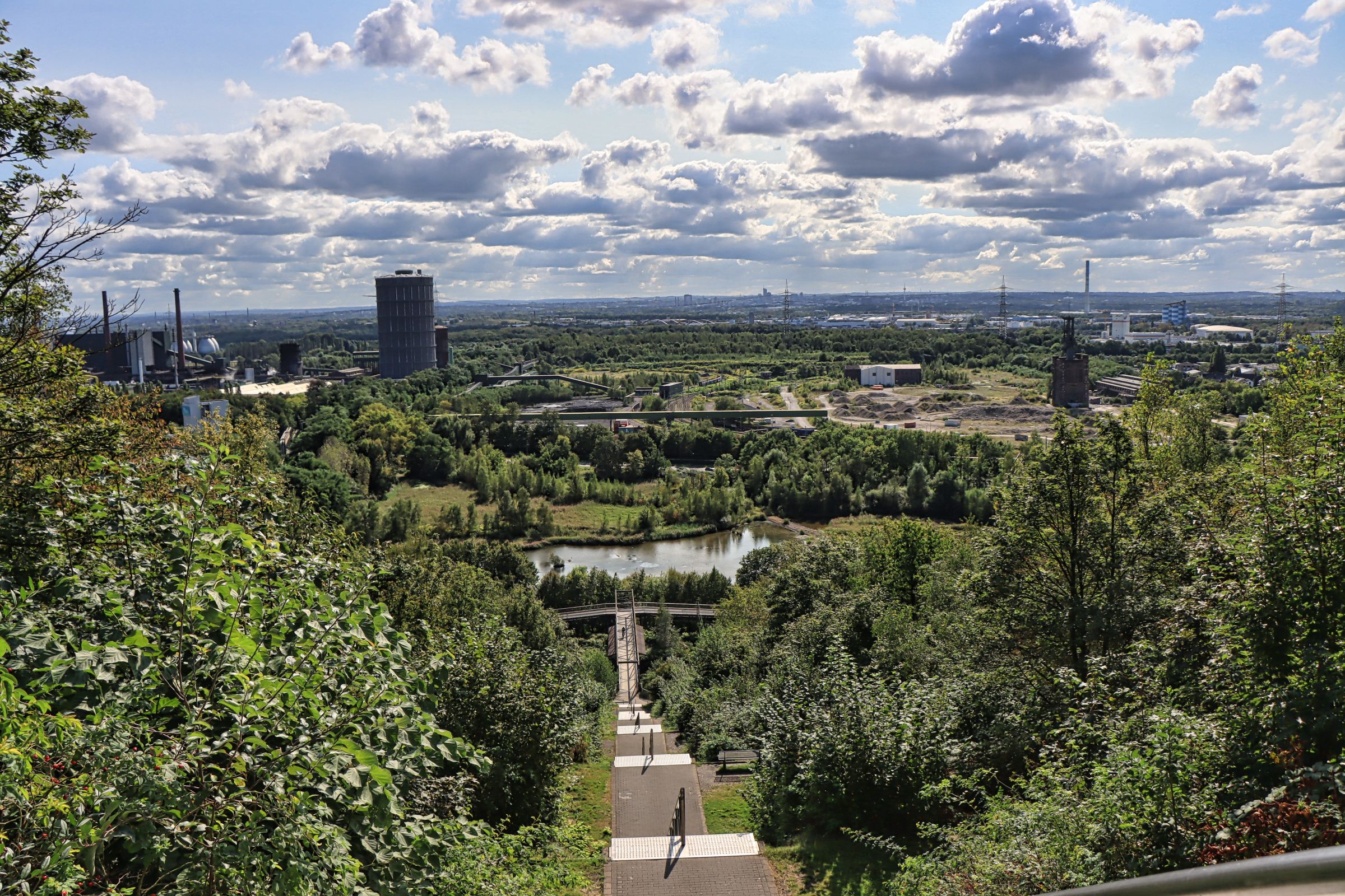 Ich habe die Halde dieses mal wieder über die Treppe auf der Südseite erklommen. Bis zur Haldenkuppe sind es 382 Stufen, auf den Tetraeder selber noch mal gut 100 weitere. Wenn man das Haldenplateau erreicht, hat man immerhin schon eine Höhe von 65 Metern erreicht, der Tetraeder selbst hat eine Höhe von 50 Metern. Für Besucher geht es über Treppen auf drei verschiedene Aussichtsetagen. Einmal auf 18, auf 32 und auf 38 Meter. Nach einer kühlen Spätsommernacht war der Himmel ziemlich klar, die Aussicht dieses Mal daher gut.