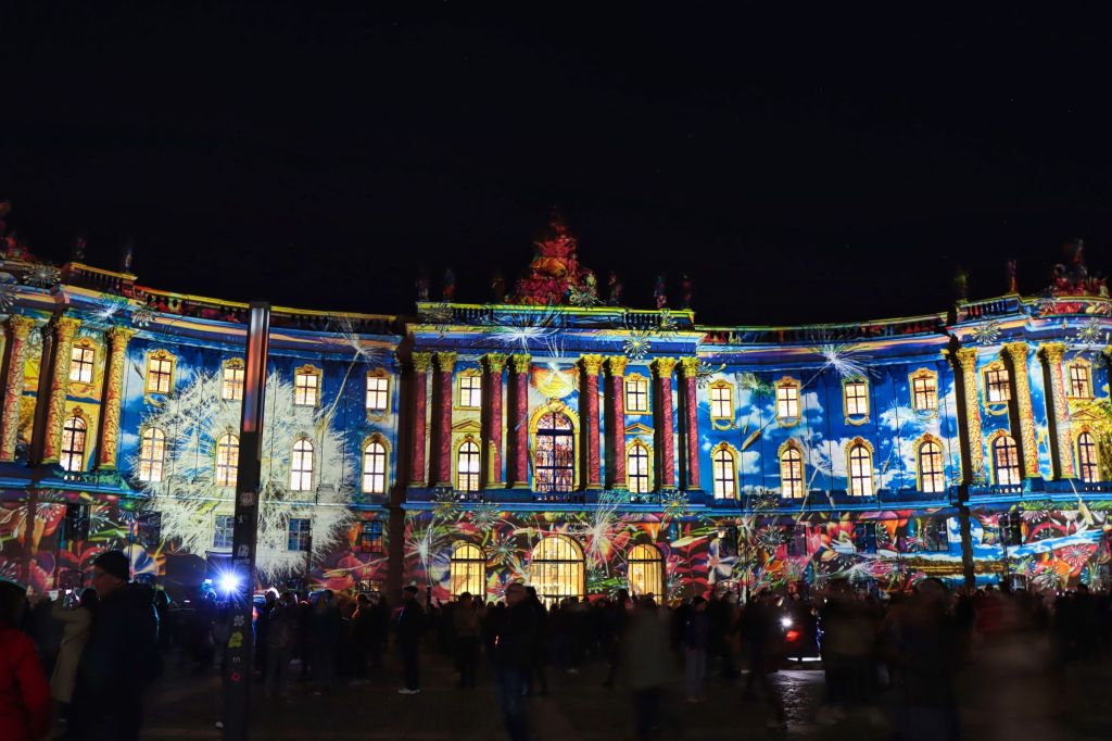 Zurück zum Festival of Lights. Am ersten Abend habe ich am Berliner Dom, am Humboldt Forum und rund um den Bebelplatz fotografiert, um mich dann zu Fuß zum Brandenburger Tor vor zu arbeiten. Am Bebelplatz gab es, wie in den Vorjahren, Bilder auf der juristischen Fakultät, auf der Staatsoper und eine Multimediashow auf dem Hotel de Rome. Sogar Dundu, die bewegliche Marionette, Großpuppe, wie immer ihr sie nennen möchtet, lief plötzlich zwischen den Menschen herum. Alleine hier konnte man sich gute zwei Stunden aufhalten.