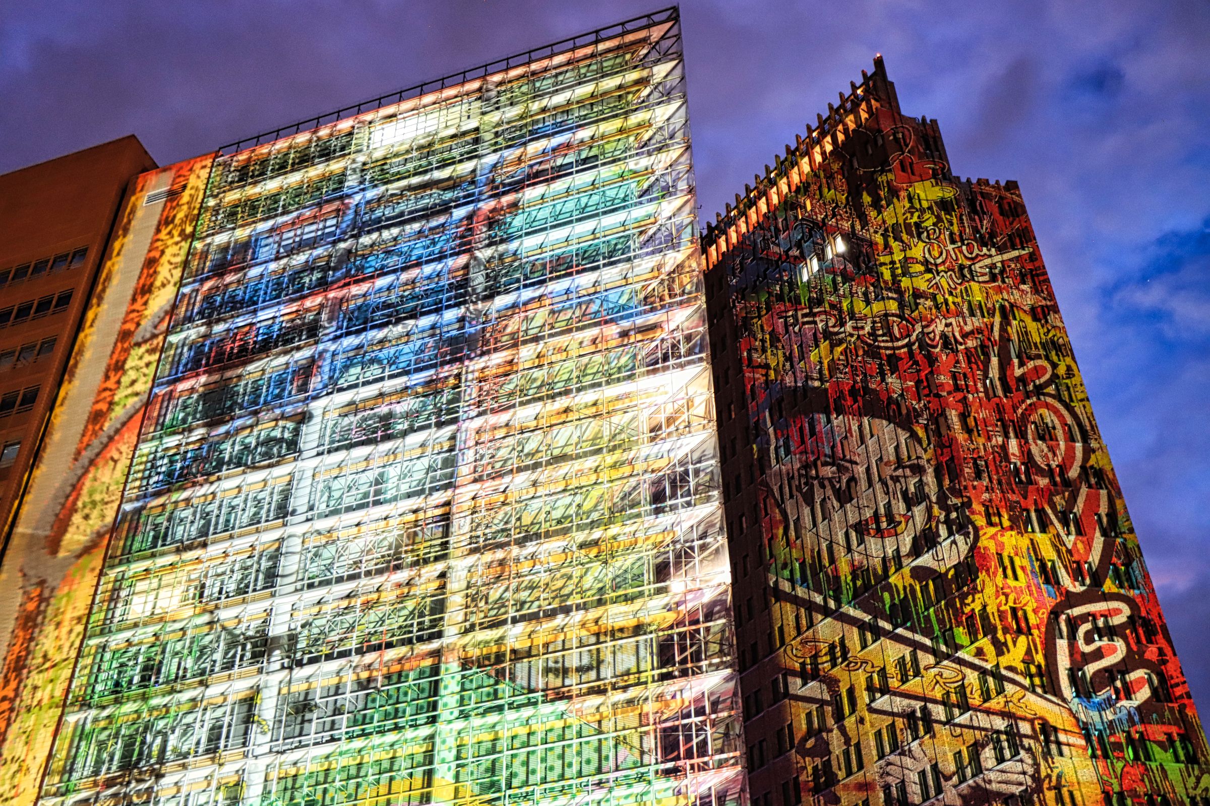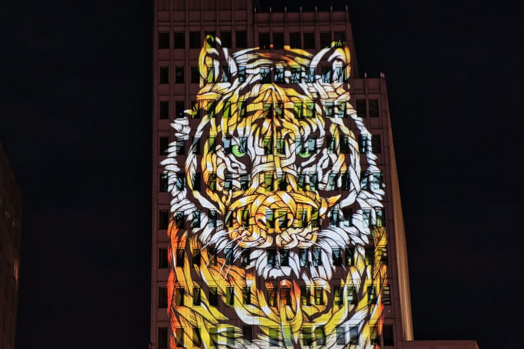 Am zweiten Abend war ich zunächst am Potsdamer Platz. Hier lief der Verkehr, wenn auch zögerlich, weil der Fußgängerstrom an den Ampeln nicht zu enden schien. Ich habe nicht alle Installationen gesucht, die es dort geben sollte, aber der Tiger am P5 (Potsdamer Platz 5) war schon cool. Bevor es weiter ging zum Alexanderplatz habe ich noch kurz einen Blick ins Sony Center (seit 2023 offiziell Center am Potsdamer Platz) geworfen.
