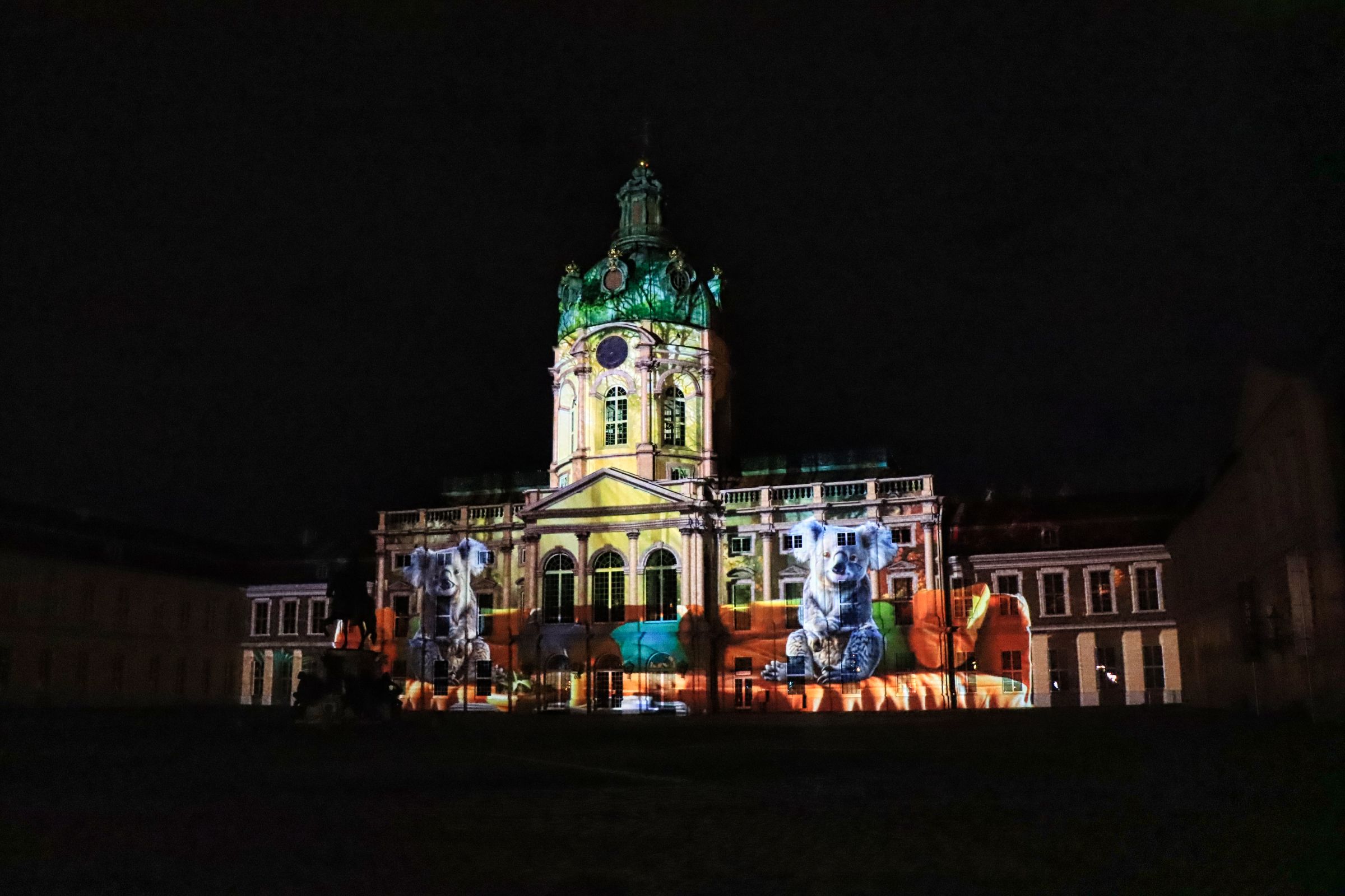 Da ich dieses Jahr einen Abend länger in der Hauptstadt verweilt habe als sonst, habe ich noch einen Abstecher zum Schloß Charlottenburg gemacht. Gar nicht so weit weg, wenn man weiß welche ÖPNV Verbindung einen dorthin bringt (z.B. der Bus M45 vom Bahnhof Zoo). Hier war ich noch nie zum Festival of Lights. Zuerst war ich etwas überrascht, denn man durfte nur vom Platz vor dem Schloß fotografieren, was a.G. der Köpfe, Handys und einem Zaun im Bild unattraktiv war. Also nah ran an den Zaun und hindurch fotografieren. Die Idee erwies sich als einigermaßen gut, zumindest bin ich mit den Bildern zufrieden.
