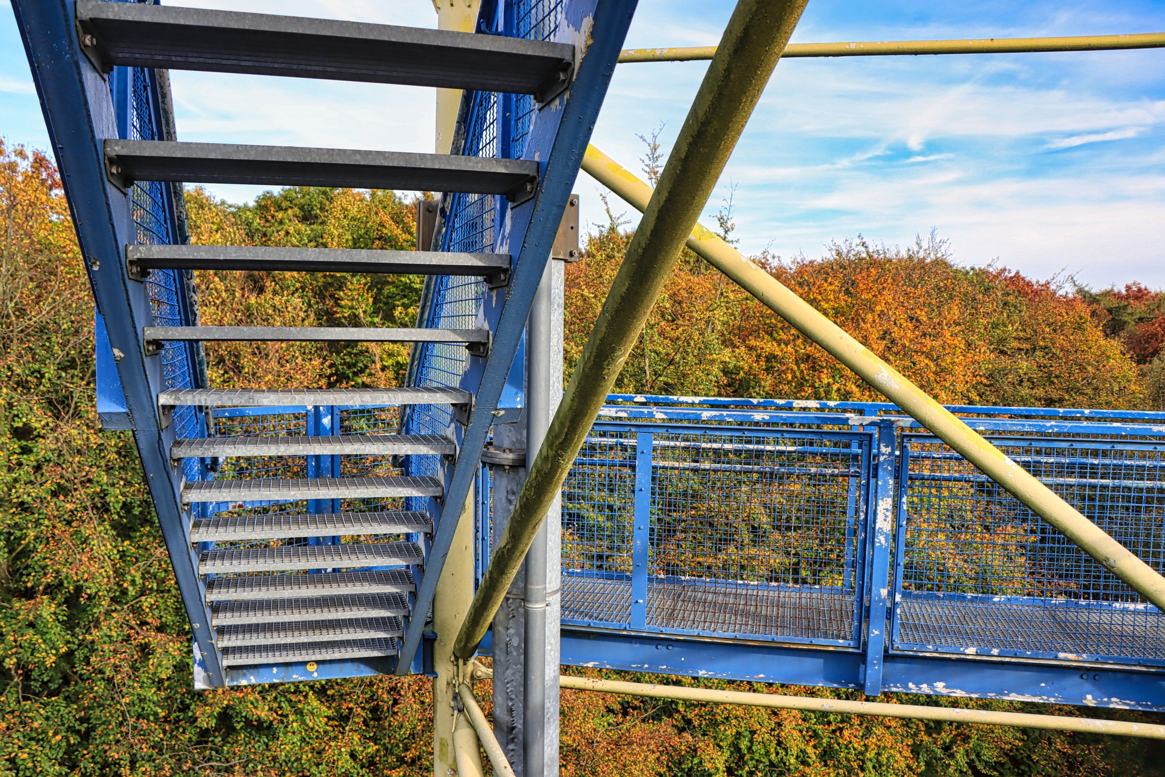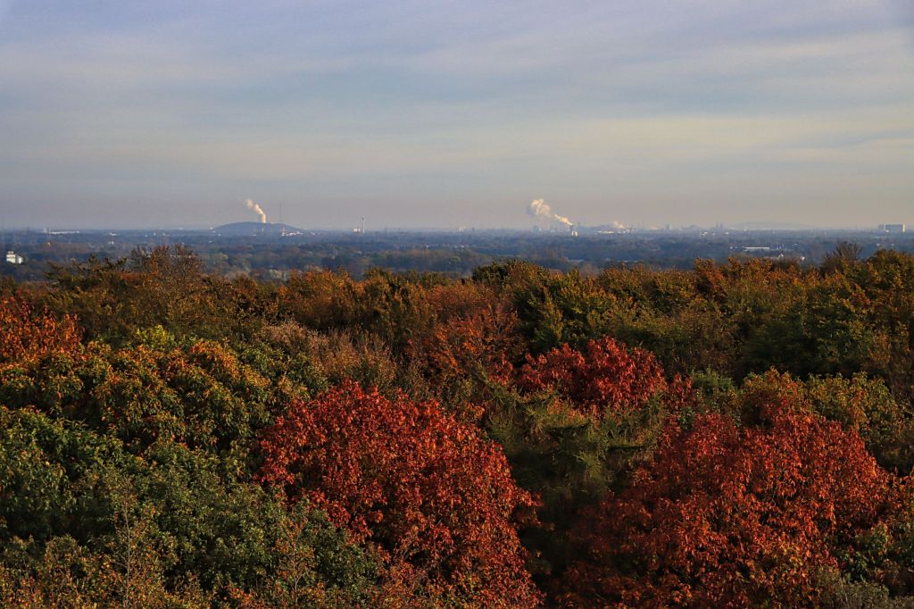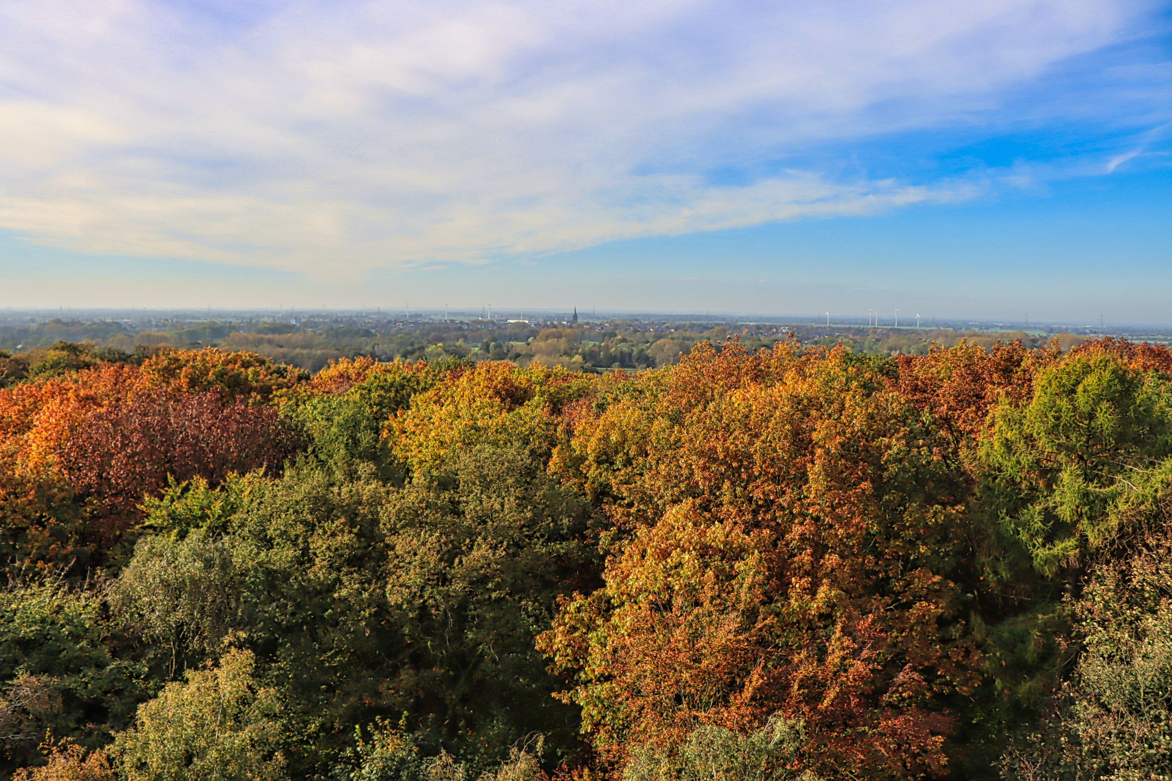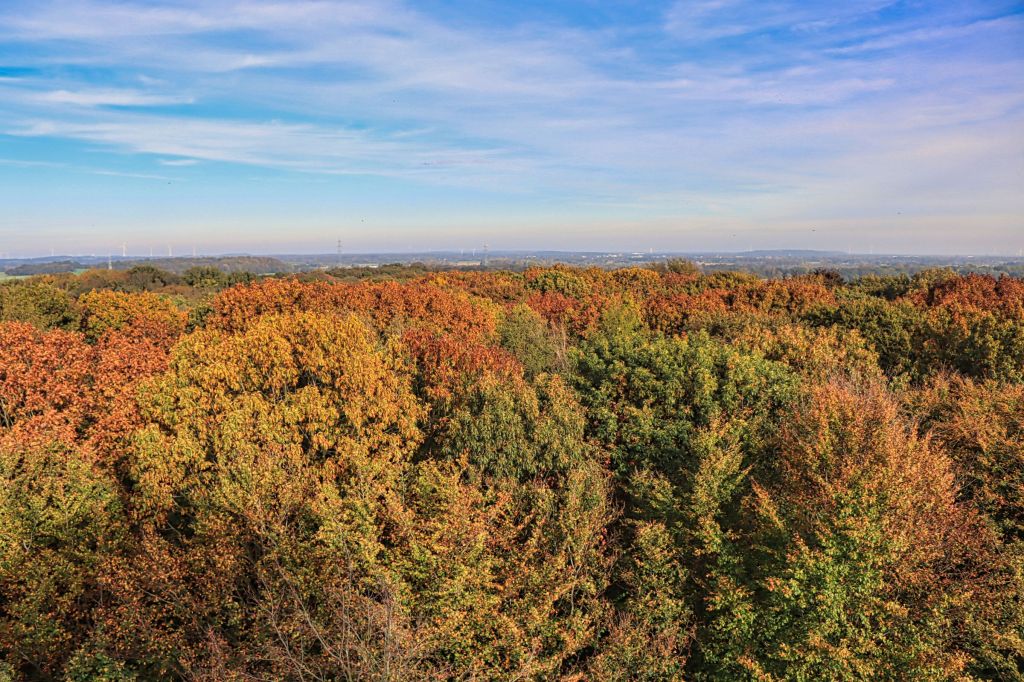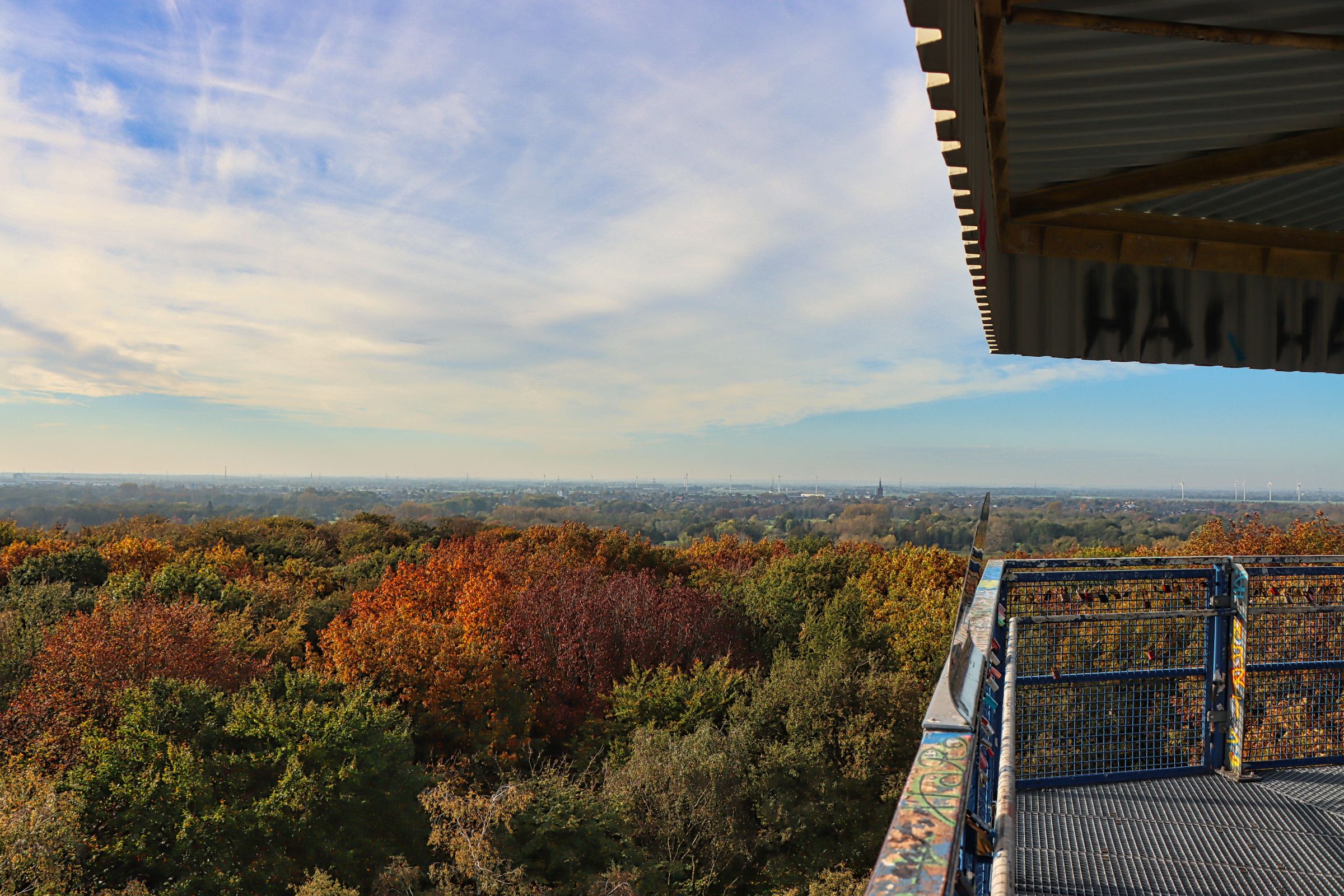 Am Samstag kamen die Winterreifen wieder ans Auto und die Uhr wurde auf MEZ zurückgestellt. Ein deutliches Zeichen, daß das Jahr langsam dem Ende zugeht. Trotzdem war am Samstag nochmal so ein richtig schöner Spätsommertag. Zum Glück fiel mir ein, daß der Hülser Berg in Krefeld da immer ein buntes Schauspiel bietet. Vorausgesetzt man ist schwindelfrei genug, um auf den 30 Meter hohen Aussichtsturm (Johannesturm, 163 Stufen) zu klettern.