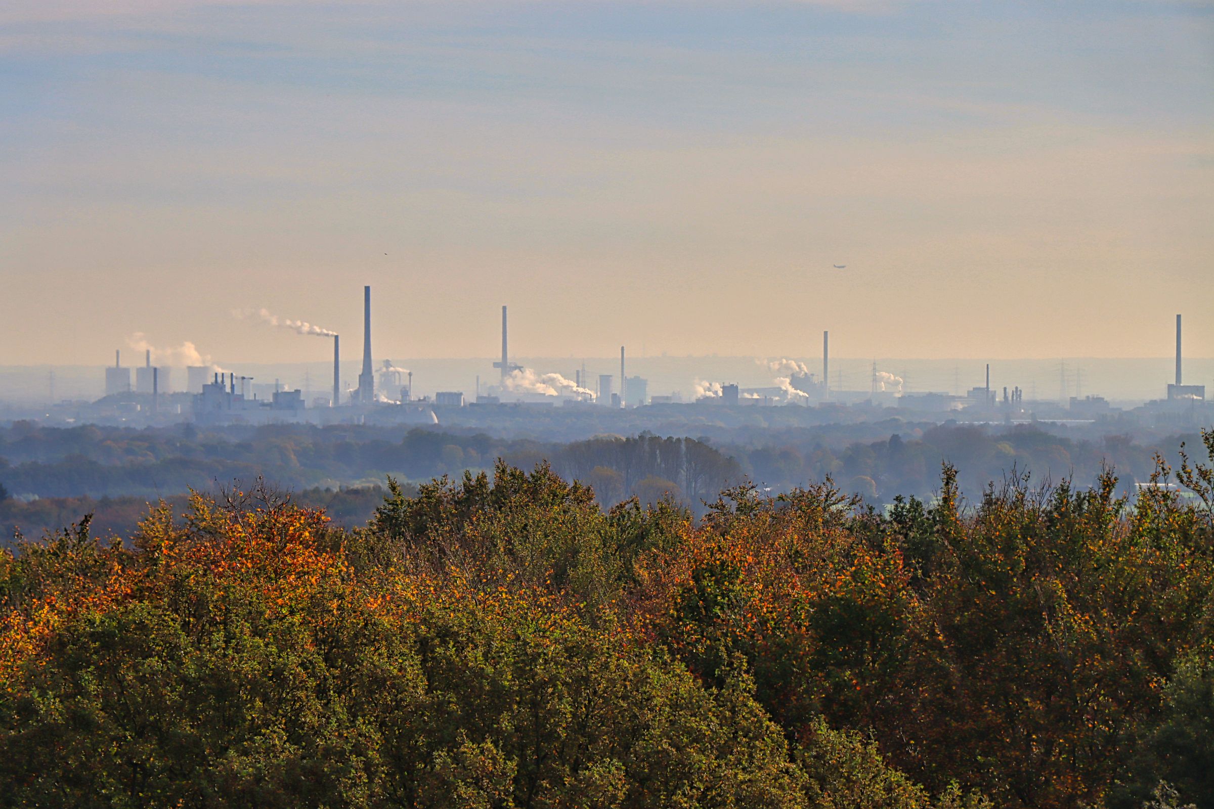 Blauer Himmel wirkt schon Wunder auf Fotos auch wenn am Vormittag ein paar Schleierwolken über den Himmel zogen. Der Blick geht in Richtung Westen über den recht flachen Niederrhein, so flach, daß ich nicht urteilen kann bis wohin. Richtung Osten und Südosten hingegen kann man (an dem Vormittag etwas im Nebel) Düsseldorf erkennen, das ehemalige Bergwerk West (jetzt Zechenpark) Neukirchen-Vluyn, das Kraftwerk Walsum, die Kokerei Schwelgern in Duisburg und mehr.