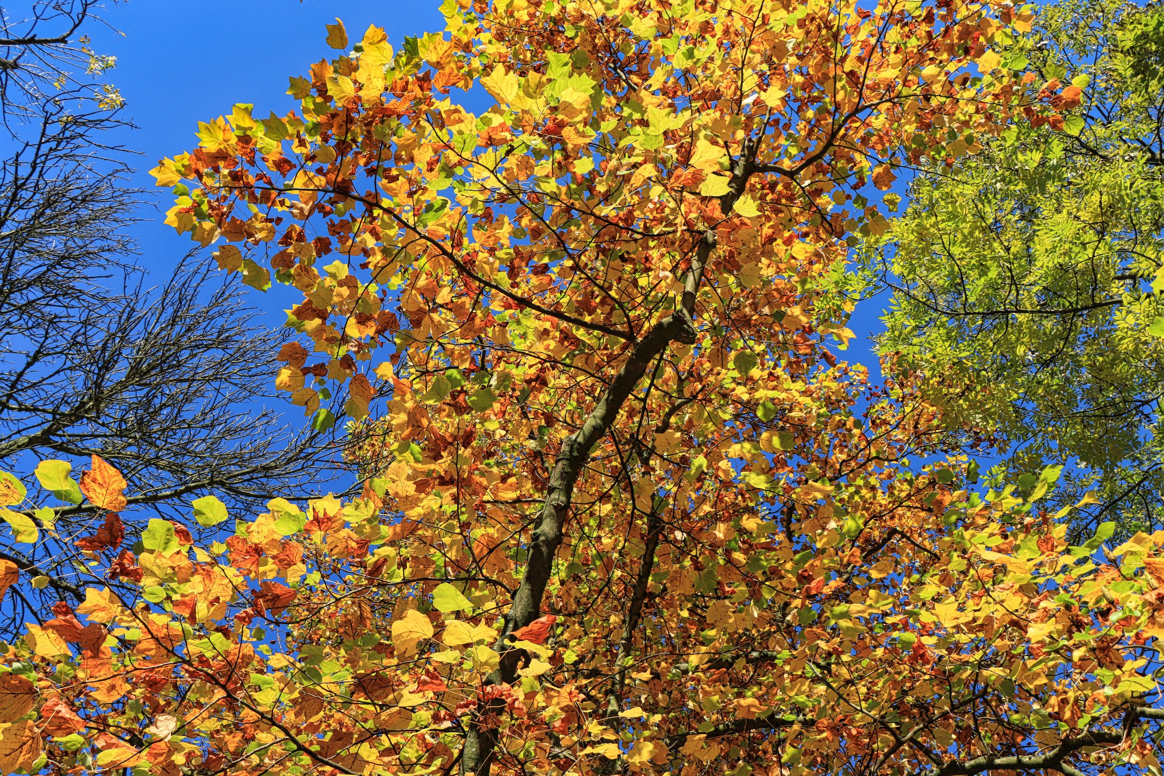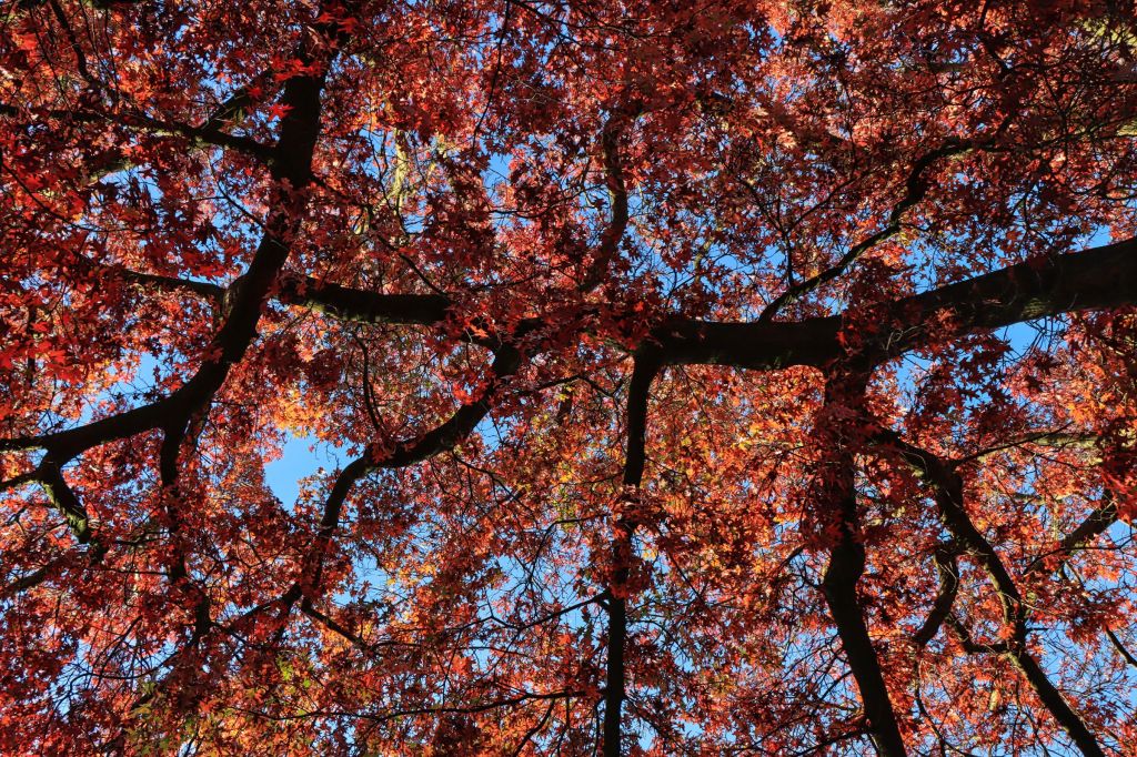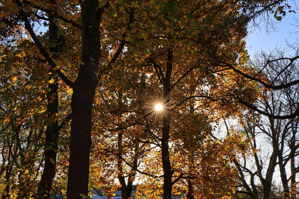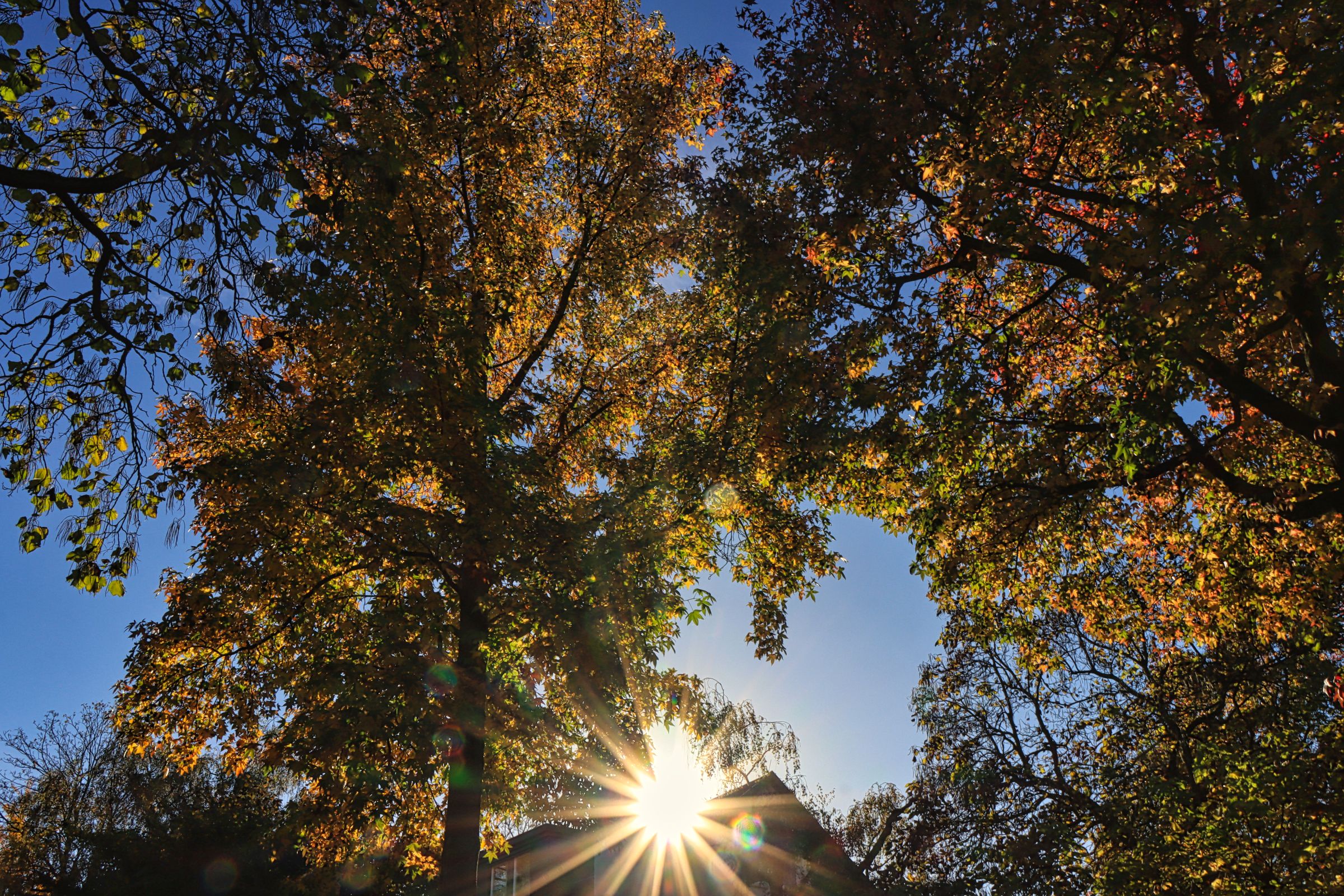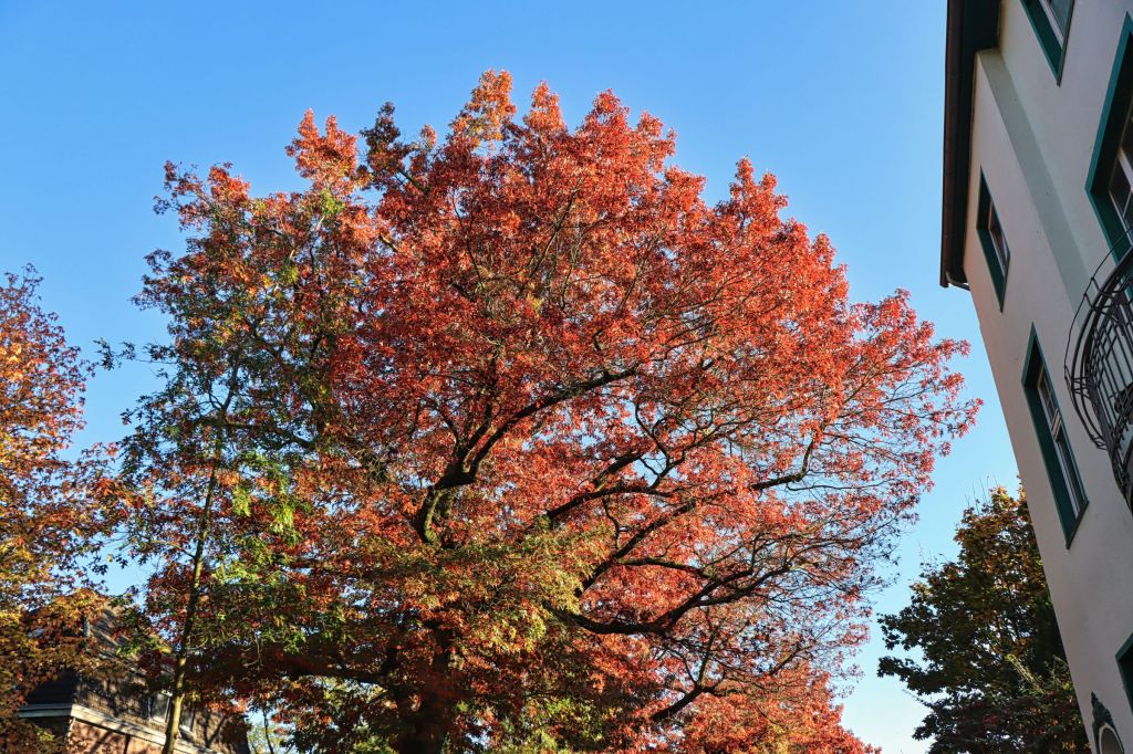 Als dann am Nachmittag auch die letzten Schleierwolken abgezogen waren, mußte ich nochmal um den Block, denn in unmittelbarer Nachbarschaft haben wir an der Roonstraße Amerikanische Roteichen, Scharlacheichen und einen Schnurbaum stehen. Gebt zu, jetzt seit ihr überrascht, daß ich das so genau weiß. Aber ich habe da Hilfe, denn im Naturportal der Stadt Krefeld ist jeder einzelne Baum aufgelistet. So kann man also mal gucken, was da so schön rotgolden glänzt und sich auf Fotos gut macht.
