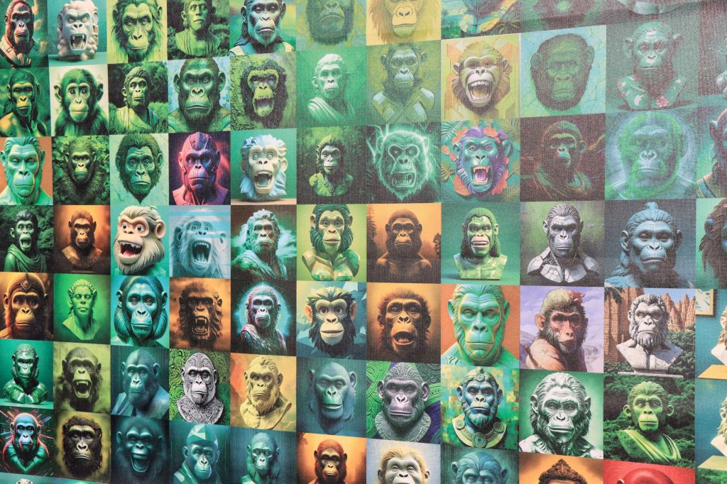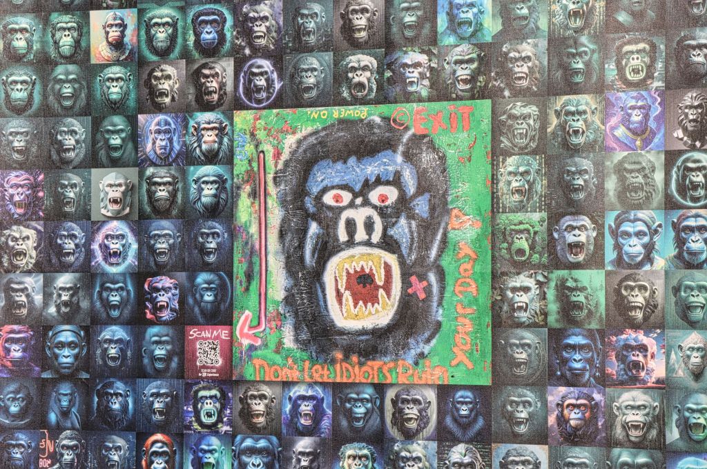 Steht man hier auf Zollverein nahe davor, sieht man unendlich viele Affengesichter, tritt man dann ein paar Schritte zurück entsteht das Bild von der Erschaffung Adams aus dem Deckenfresko des Malers Michelangelo. Auf der anderen Seite der Installation sieht man gemalte Bilder unter der Überschrift „We Can Be Heroes“. Ich meine verstanden zu haben, daß diese Bilder von einer KI generiert wurden. Wer sonst noch an Planung, Umsetzung und als Sponsor mitgewirkt hat, erfahrt ihr hier.