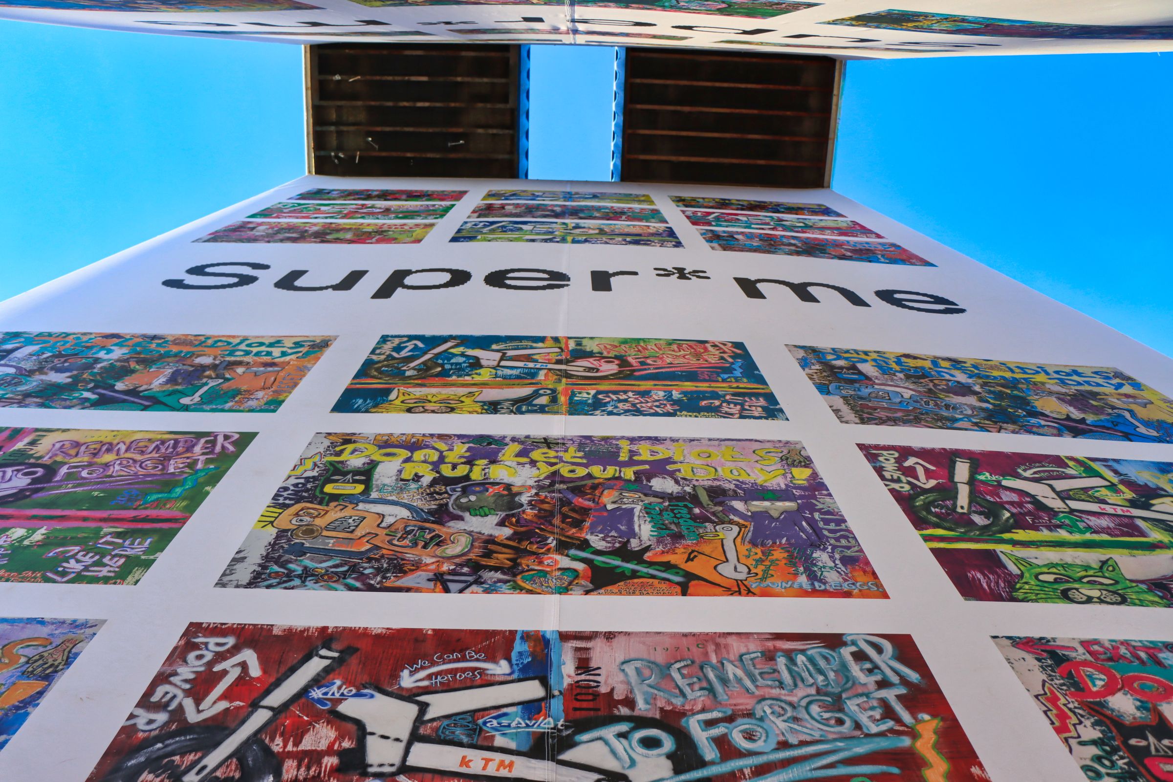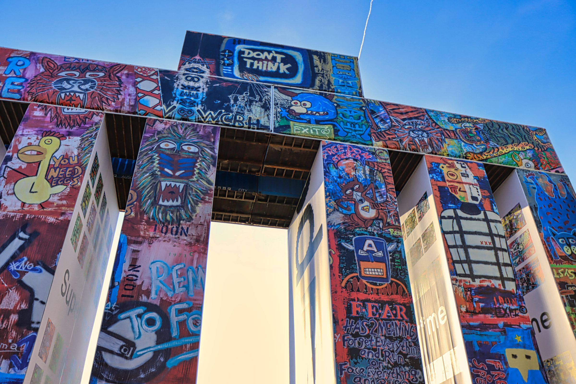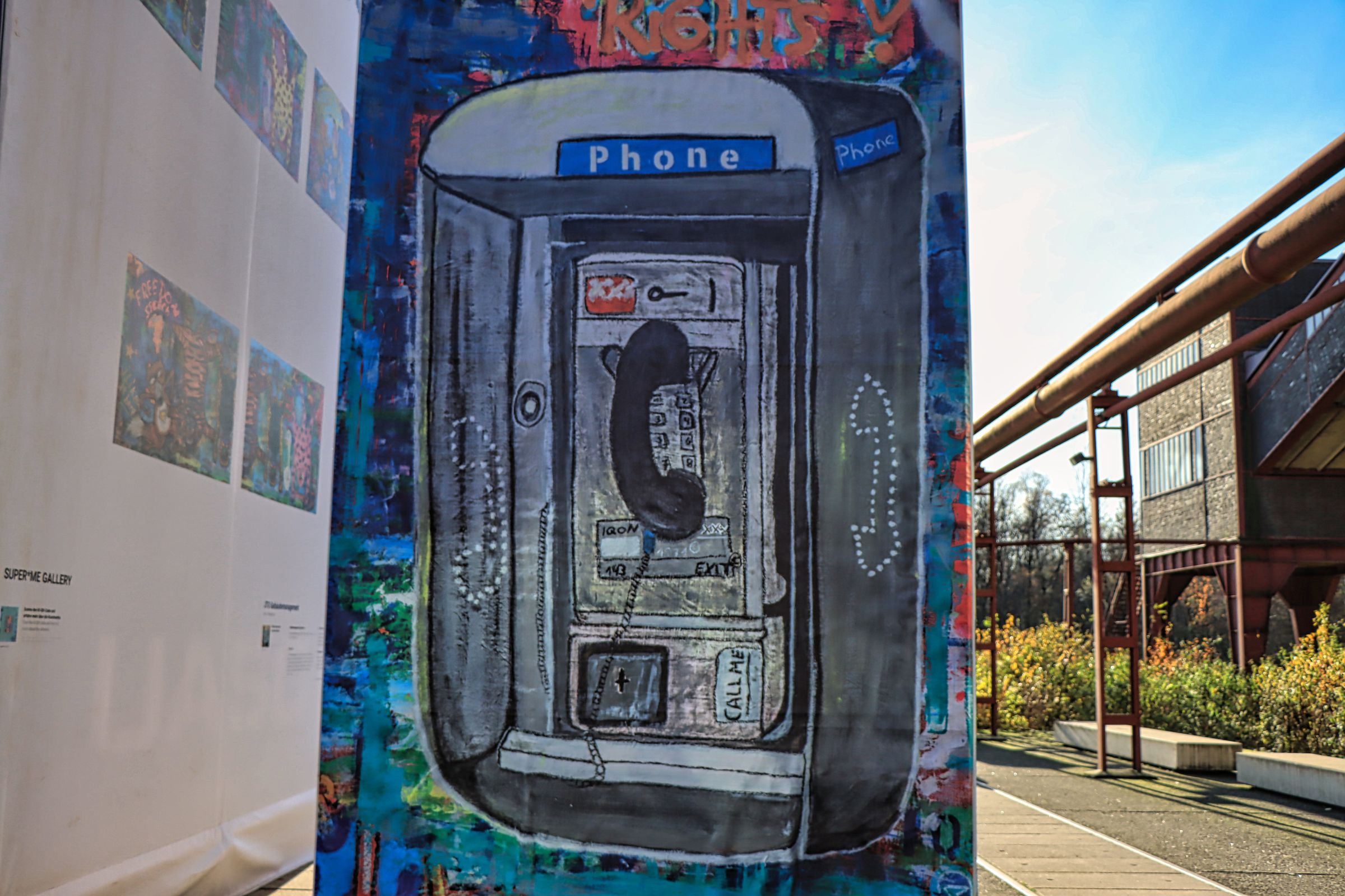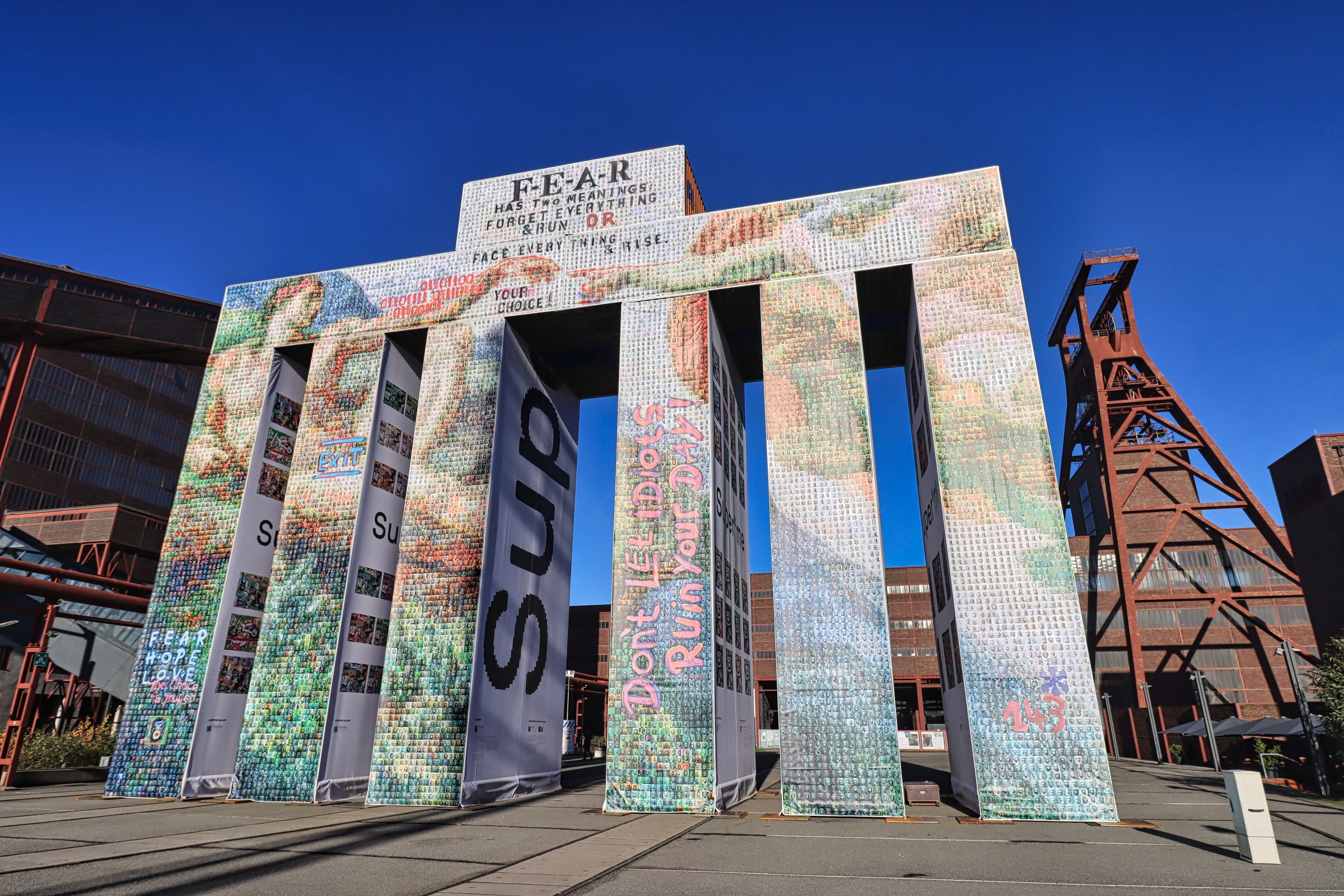 Nach Dubai, Frankfurt und Hamburg steht die Konstruktion aus 37 Schiffs- oder Seecontainern jetzt bis Ende März 2025 in Essen, unweit des Doppelbocks der Zeche Zollverein. An jedem Ort wird die Bespannung neu gestaltet und während in Hamburg noch Otto Waalkes als Künstler gewonnen werden konnte, wurde hier die künstlerische Konzeption und Umsetzung durch den Künstler Thomas Wirth alias Super*me realisiert.