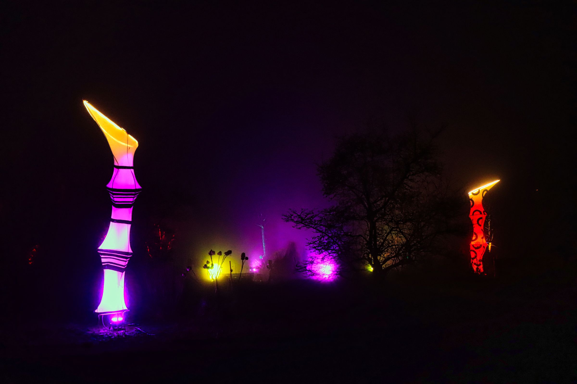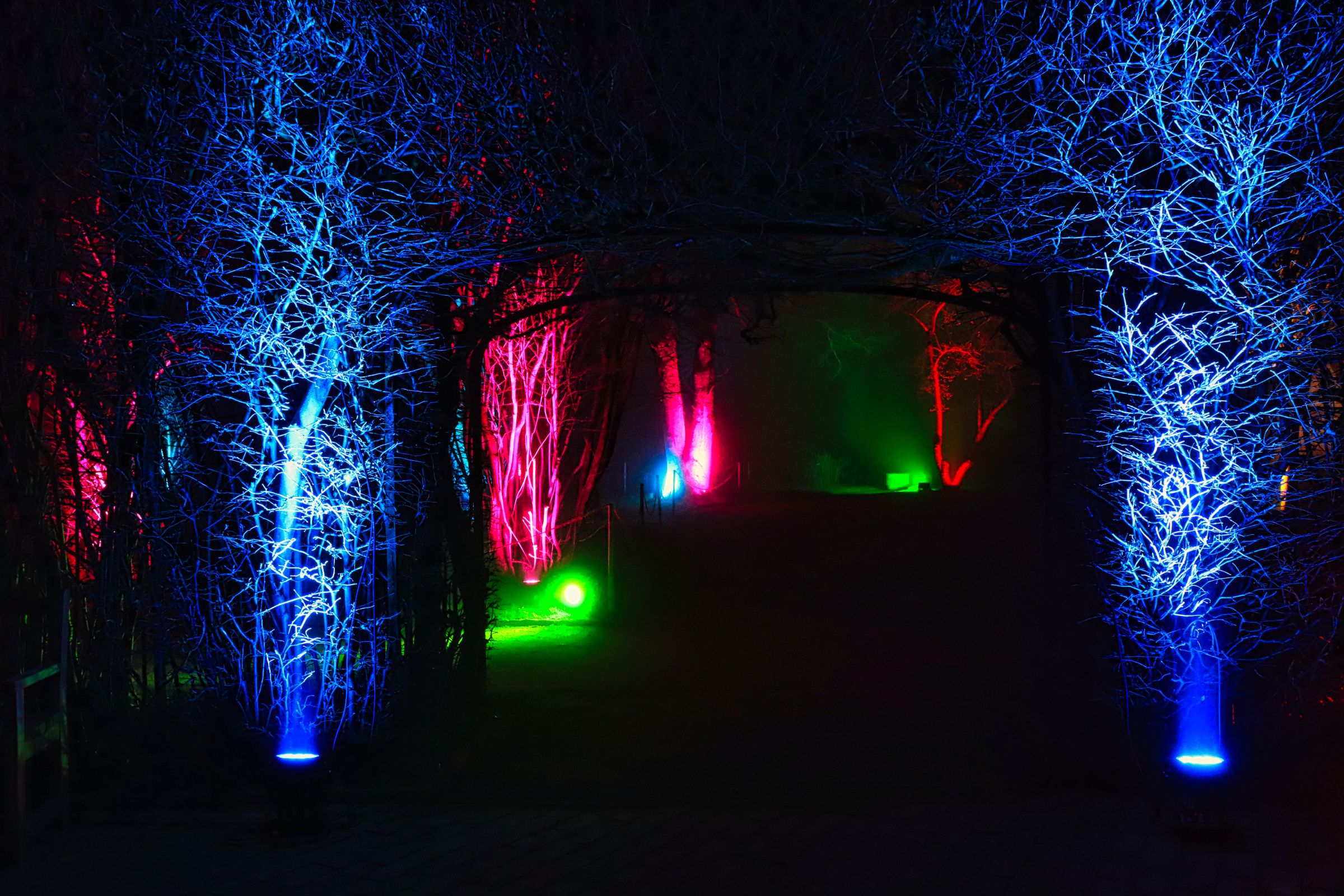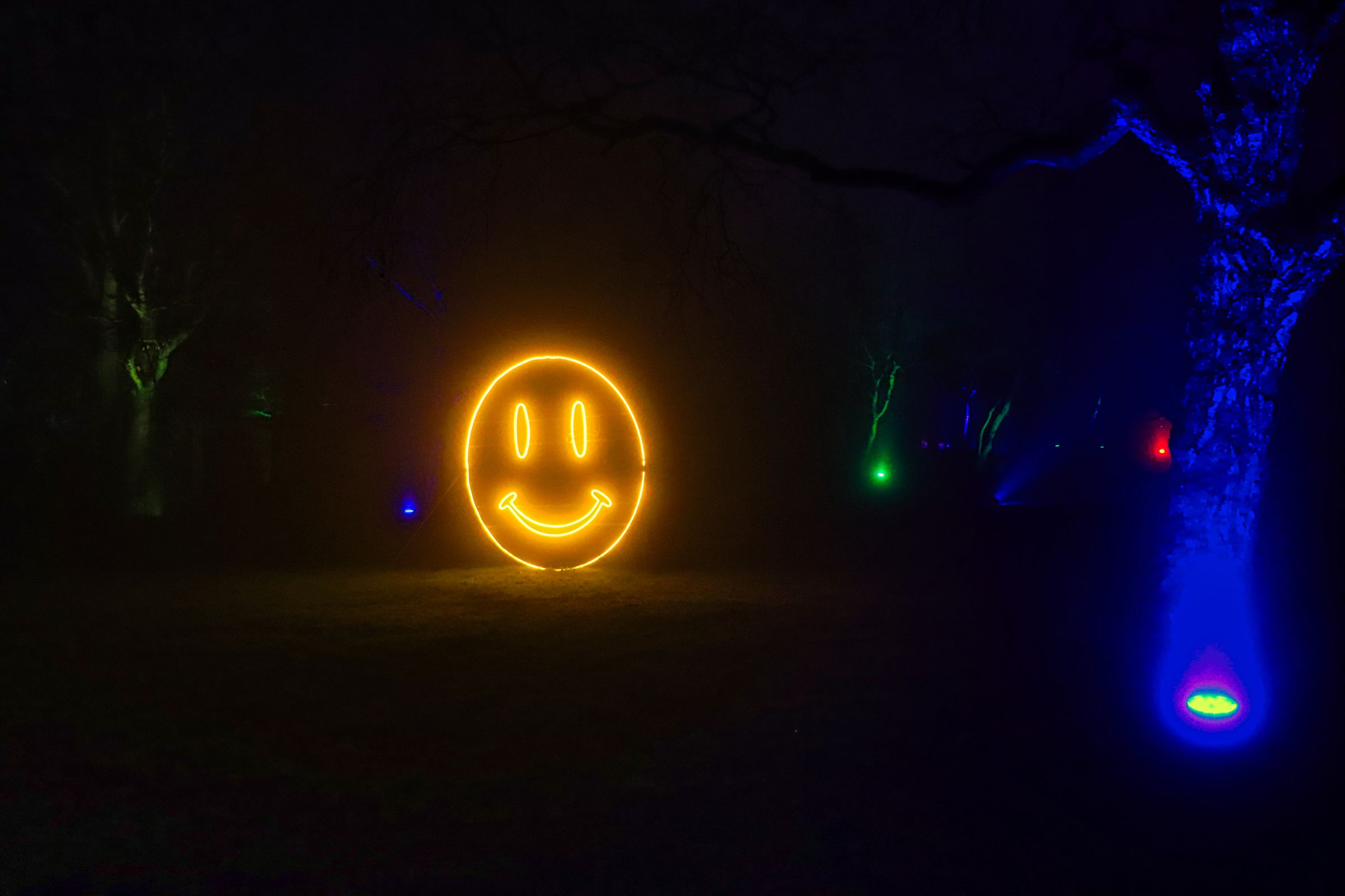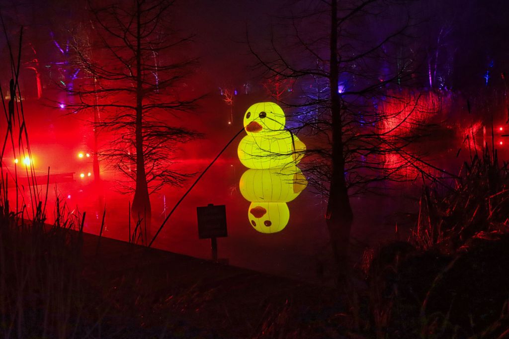 Viele Bäume im ganzen Park sind bunt erleuchtet, rund um den Waldsee wird die Beleuchtung gerade eingeschaltet, ich halte schon mal Ausschau noch guten Stellen fürs Stativ. Freitag und Samstag hat man übrigens eine Stunde mehr Zeit, deshalb sind das auch meine bevorzugten Tage. Dieses mal habe ich nicht meinen bunt beleuchteten Rucksack sondern eine beleuchtete Bauchtasche schräg über der Schulter und errege auch damit natürlich wieder Aufmerksamkeit. Ich sollte mal fragen, ob Nebulite Provision zahlt.