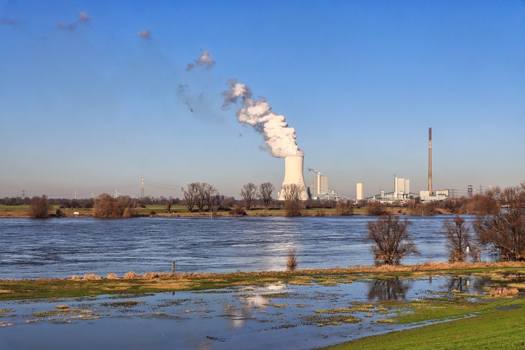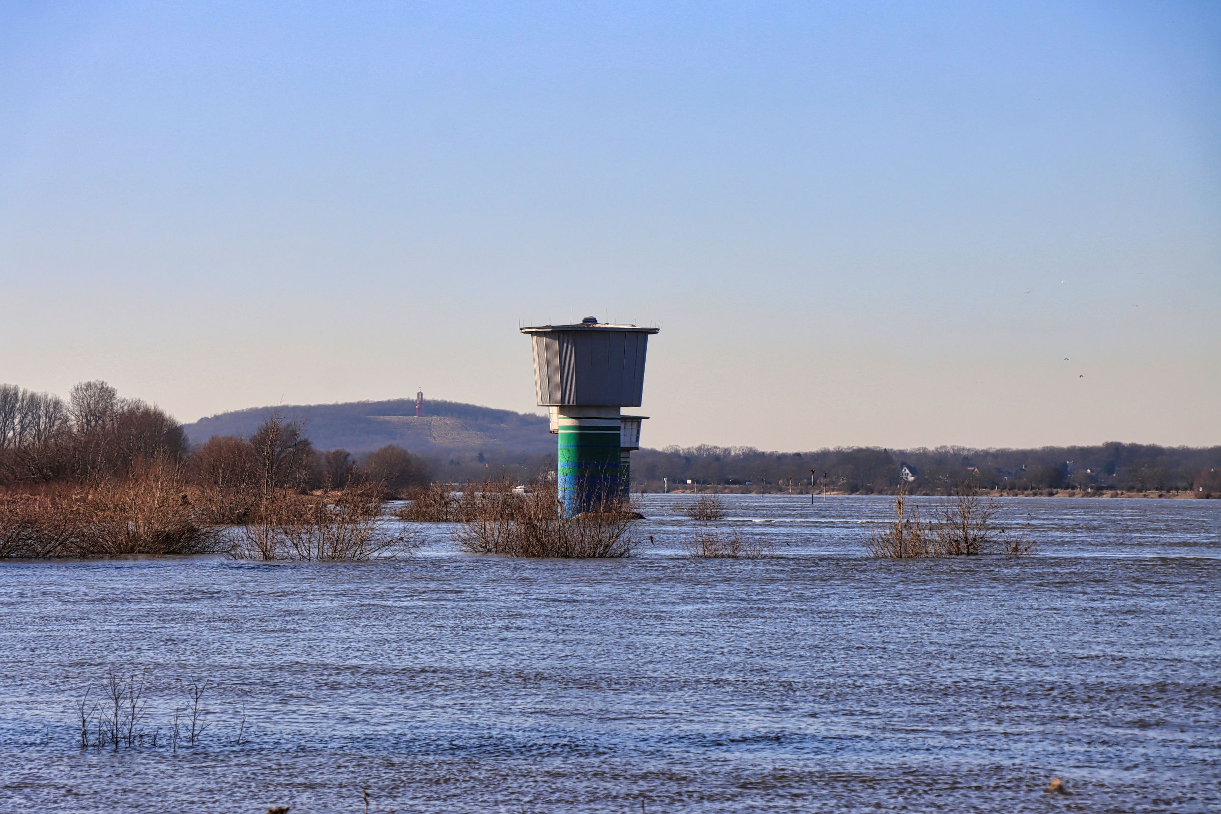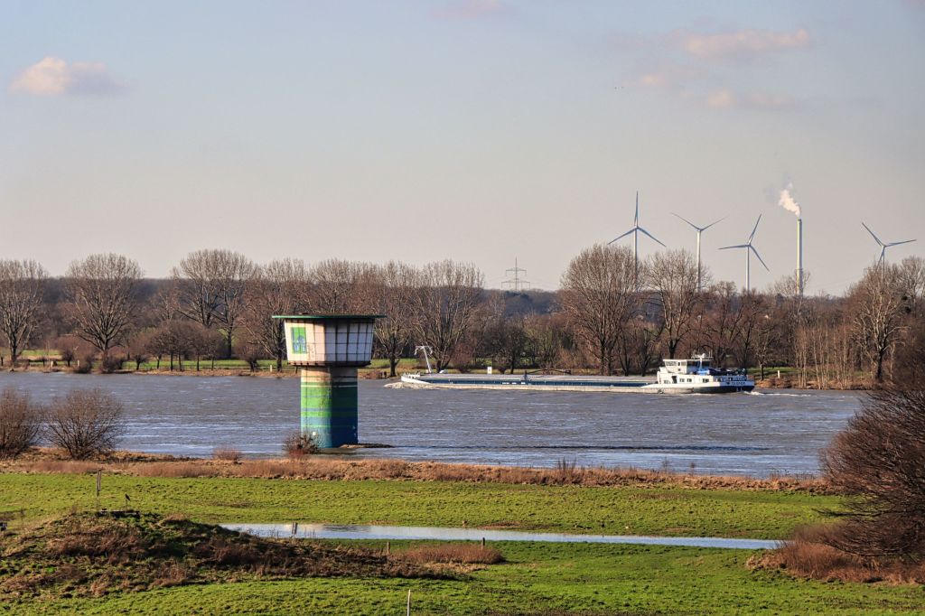 Ein ziemlich trockener Rheindeich und hoch gewachsene Bäume waren im letzten Blogbeitrag des Alsumer Bergs zu sehen, ganz anders dieses Mal. Die Wiesen waren satt grün, der Rhein hatte leichtes Hochwasser und auf dem Berg wurde die Aussicht auf die Kokerei kräftig freigeschnitten. Der Wind wehte aus Nordosten, so daß der Dampf aus 25 Kubikmeter Wasser (ca. 25.000 Liter) pro Koks Löschvorgang über den Rhein abzog.