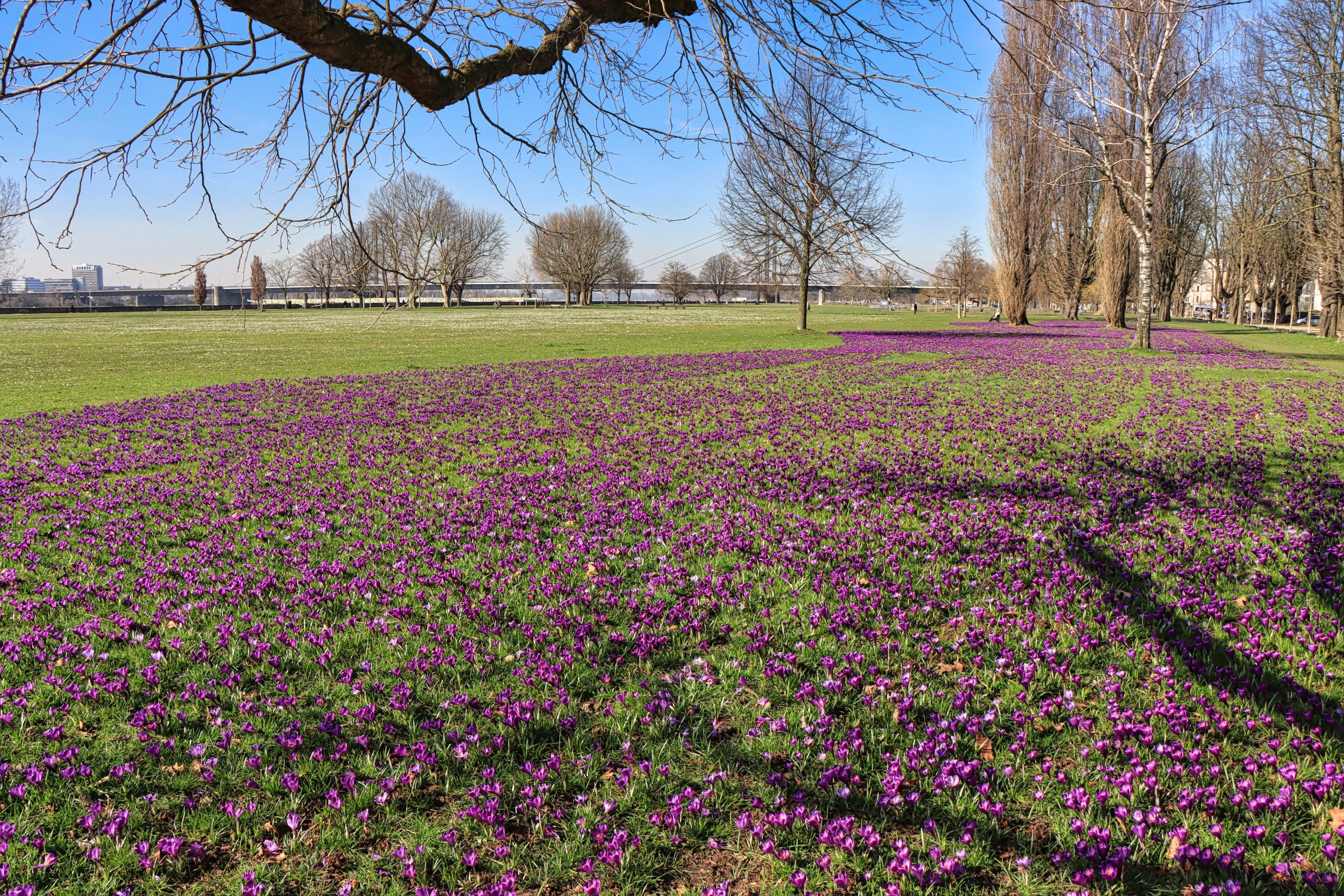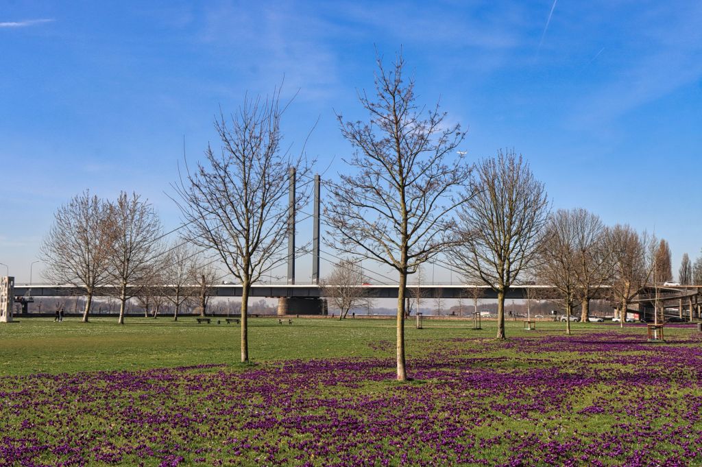 Wenn bei mir vor der Haustüre die ersten Krokusse aus dem Boden gucken, weiß ich, daß ich nach Düsseldorf in den Nordpark muß. Er ist ein hervorragender Ausgangspunkt, um von dort entlang des Rheins theoretisch bis in die Altstadt, sogar bis in den Medienhafen zu laufen. Wo am Wochenende Spaziergänger und Radfahrer, Skater und Rollschuhfahrer gemeinsam unterwegs sind, ist es am Veilchendienstag überschaubar. Ich laufe gemütlich unter der Theodor-Heuss-Brücke entlang bis zum Rheinpark im Ortsteil Golzheim. Der Rheinpark reicht fast bis zu den Kunstmuseen.
