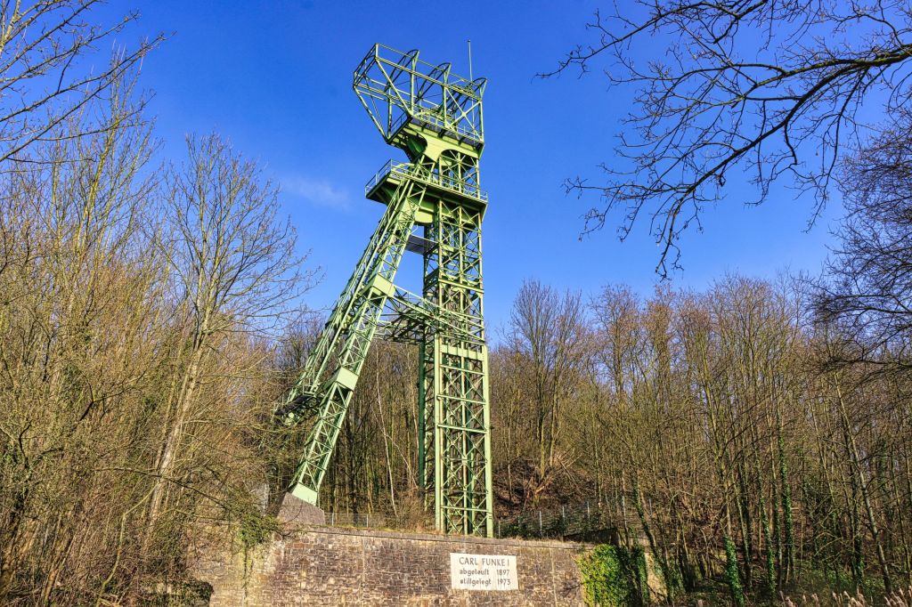 Ein kleines Stück zurück, geht es jetzt abwärts, unterhalb der Korte Klippe entlang. Hier über Serpentinen ein Teilstück des Baldeneysteigs. Achtung, es wird kurz etwas steil, dafür kommt der See langsam näher. Es lohnt sich zwischendurch mal stehen zu bleiben, denn an jeder zweiten Ecke entdeckt man wieder einen neuen Blick. Auf dem Baldeneysee machen sich an dem sonnigen Tag die Segelboote breit. Für das erste März Wochenende ist das Wetter aber auch ausgesprochen schön. Unten angekommen noch wenige Meter und ich stehe am alten Förderturm der Zeche Carl Funke.