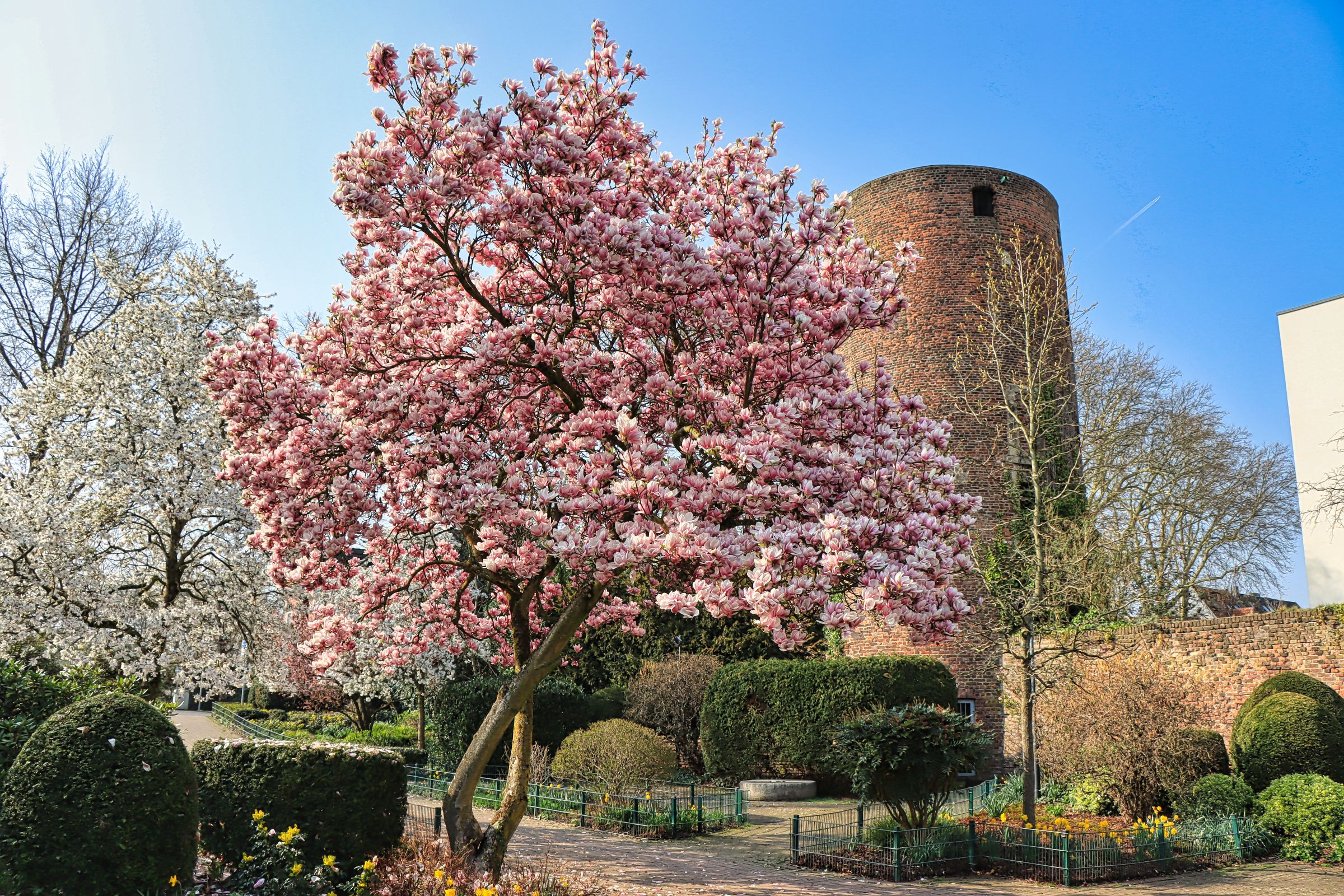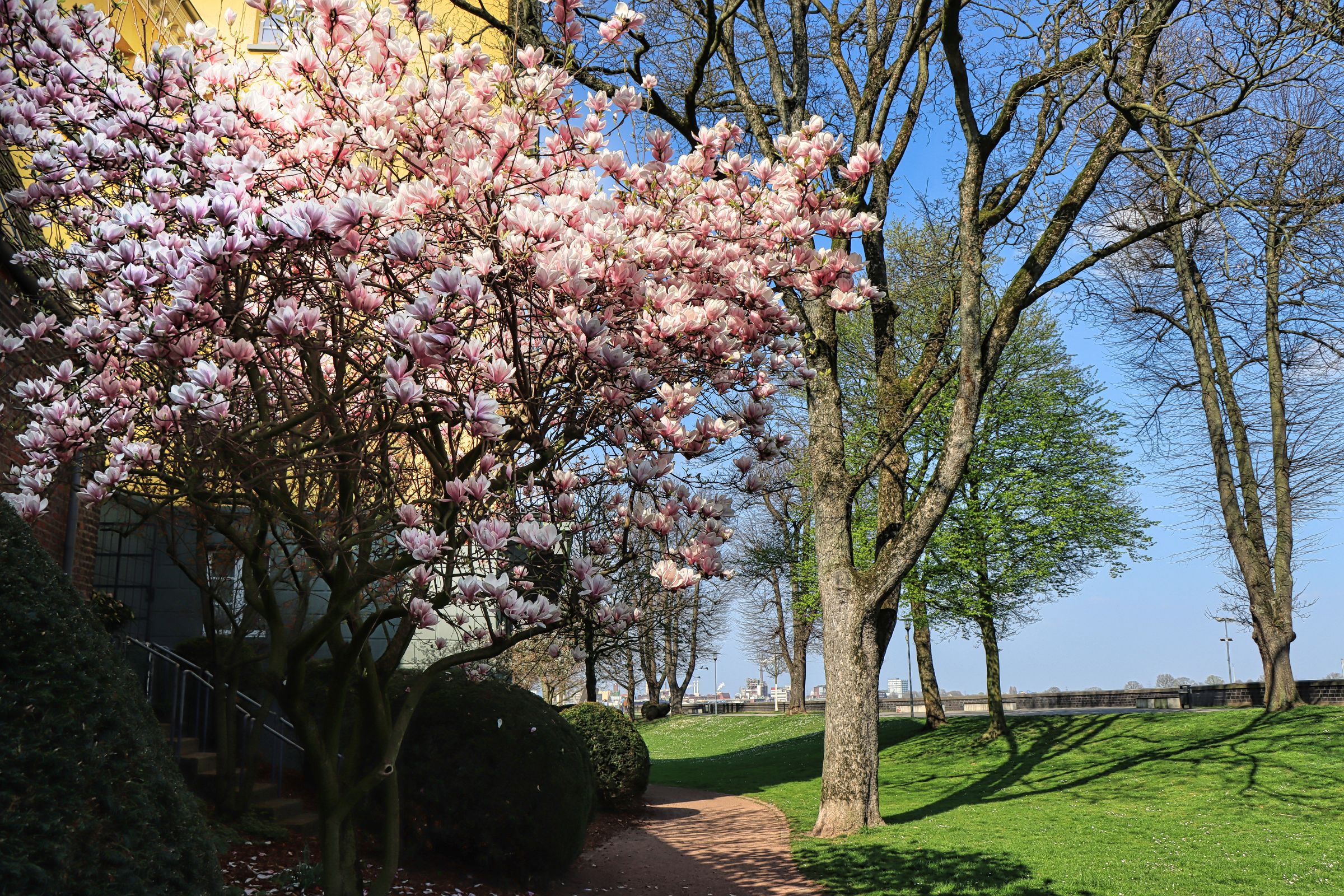 Hier stehe ich gerne und schaue den Schiffen hinterher, denn sie müßen von Kaiserswerth kommend eine große Kurve in Richtung Duisburg zurücklegen (umgekehrt natürlich auch). Sogar unterhalb der Rheinpromenade blühen die Magnolien. Seit ich mit dem Augen eines Fotografen darauf gucke, begegnen sie mir an jeder Ecke. Genauso im nahen Uerdinger Wallarten, der sich ebenfalls frühlingshaft zeigt.