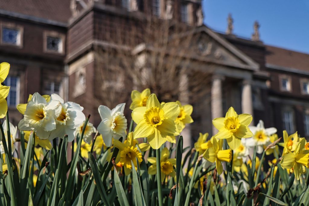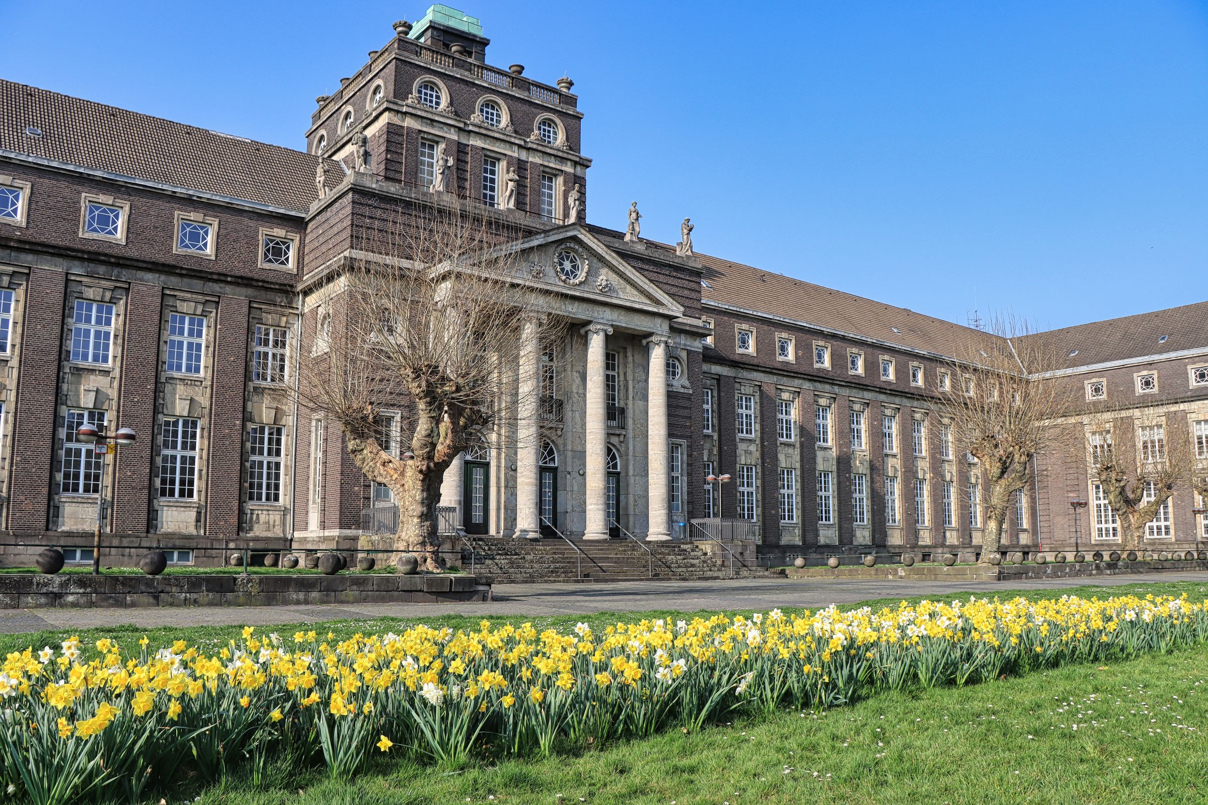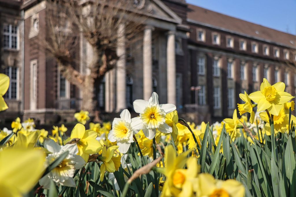 Danach ging es über Radwege und entlang der A57 (die Autobahn liegt hier nicht sichtbar etwas höher) und durch den anliegenden Sollbrüggen- und Schönhausenpark (gegenüber des Krefelder Zoos, der auch einen Besuch wert ist) bis vor das altehrwürdige Gymnasium am Moltkeplatz. Hier und auch in den umliegenden Straßen blühen im Frühjahr immer hunderte von Narzissen, die soweit ich weiß, der Bürgerverein gepflanzt hat.